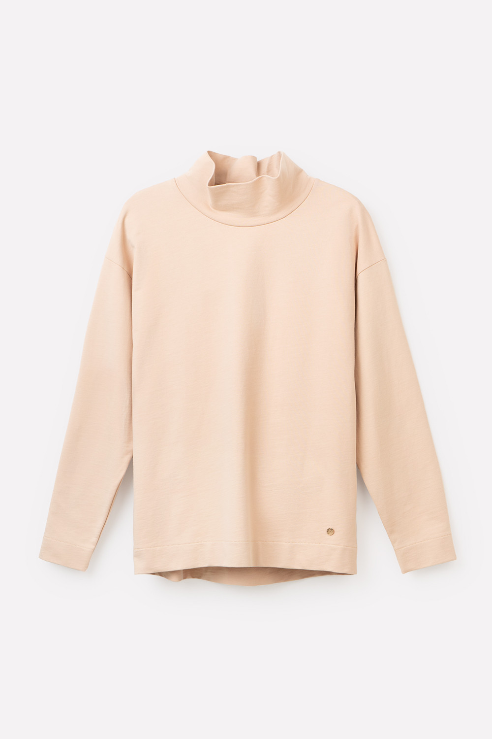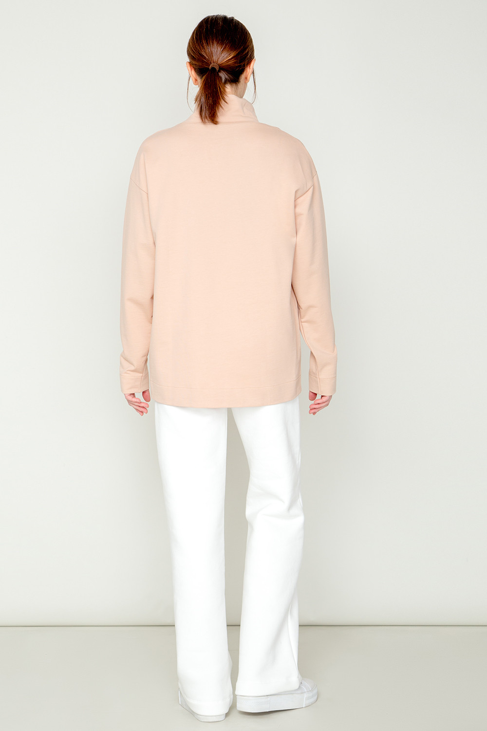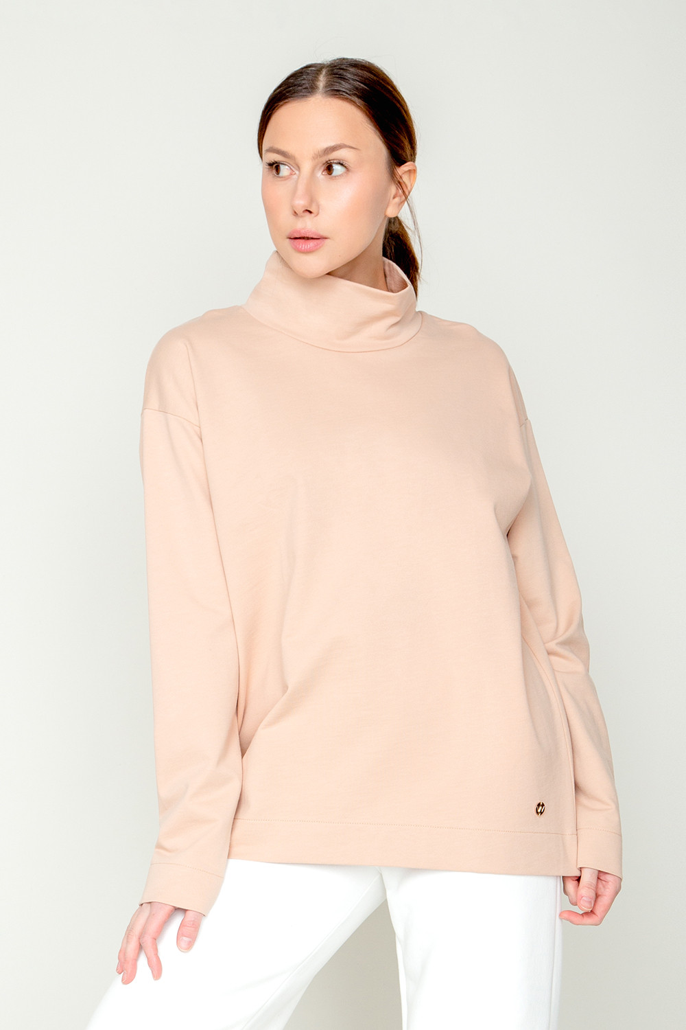Базовый однотонный джемпер из петельчатого футера с высоким воротником и спущенными плечами. В составе изделия 100% натуральный хлопок. Свободная посадка, объёмный силуэт..