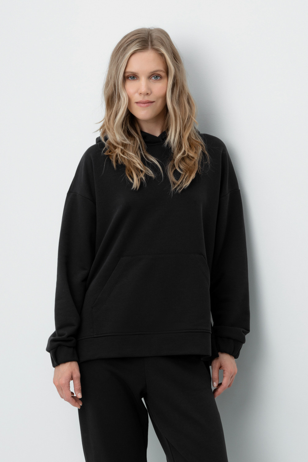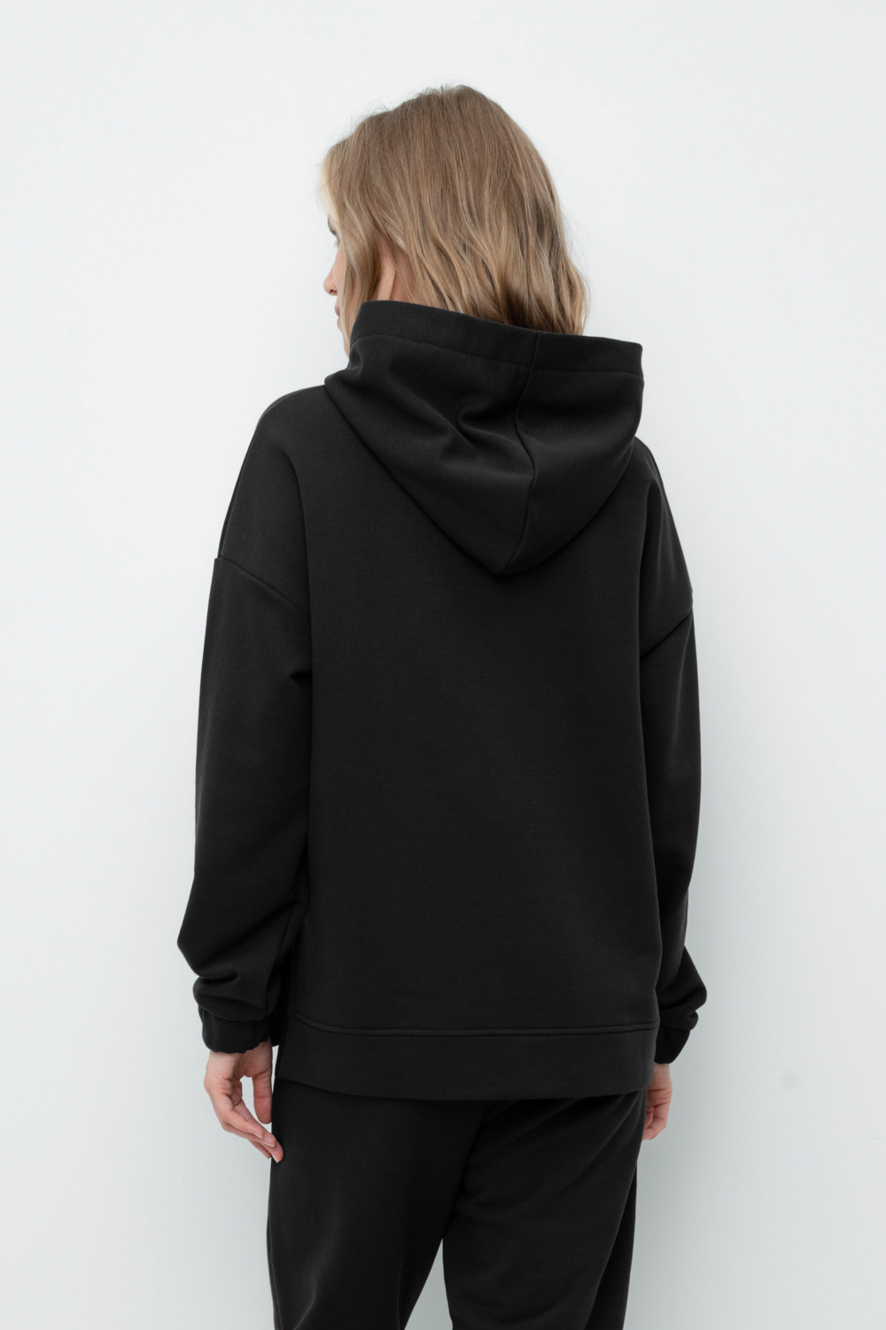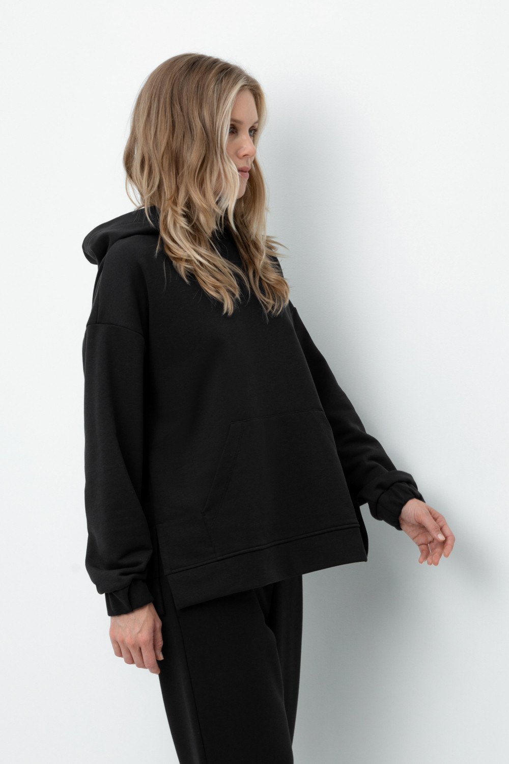 Теплая толстовка с капюшоном, карманом кенгуру и спущенным плечом из мягкого футера трехнитки. Уютный капюшон с подкладом из супрема. В боковых швах разрезы
