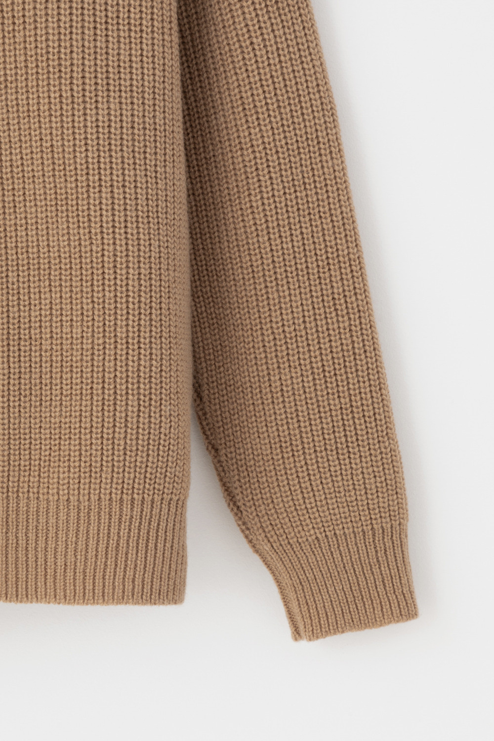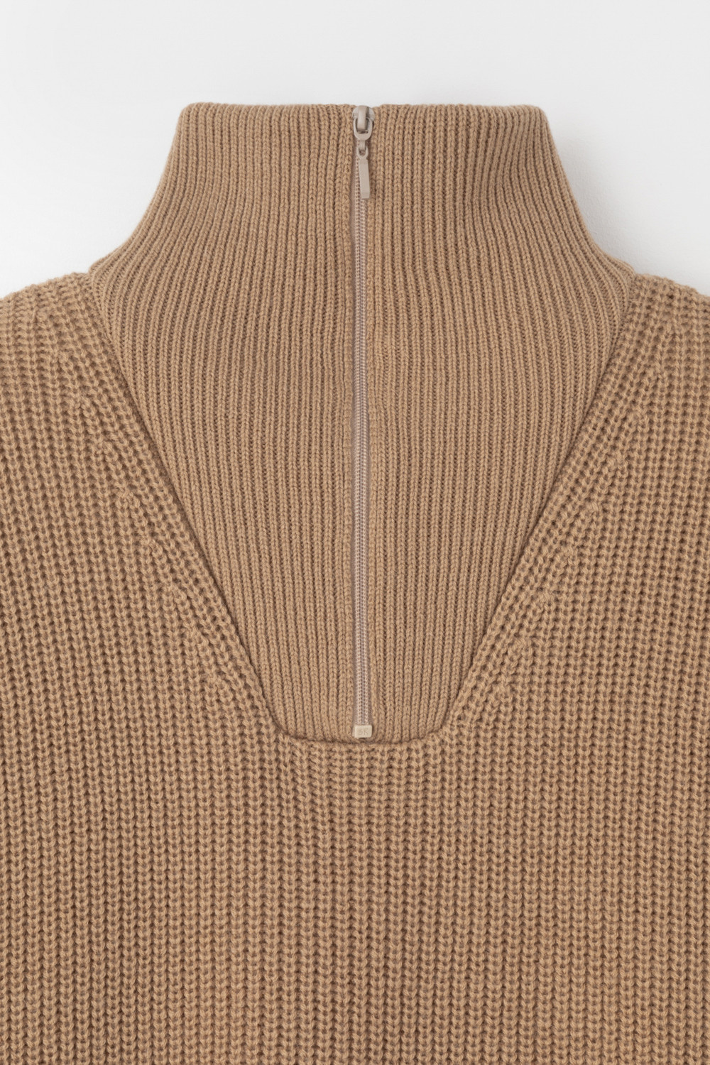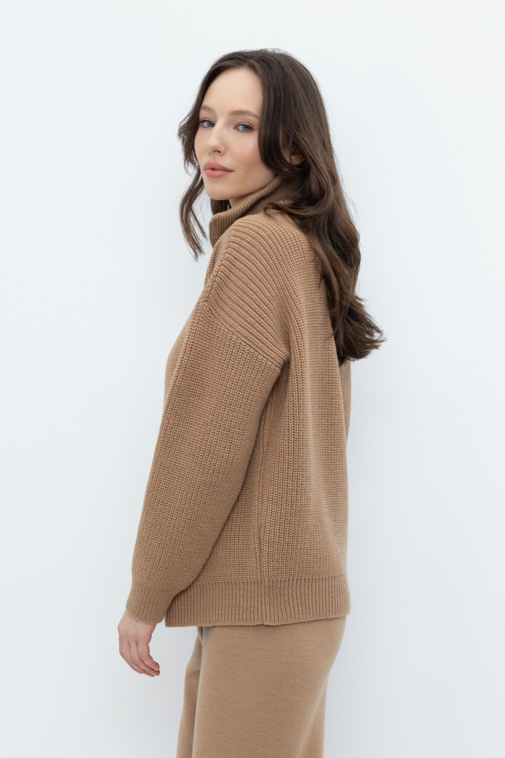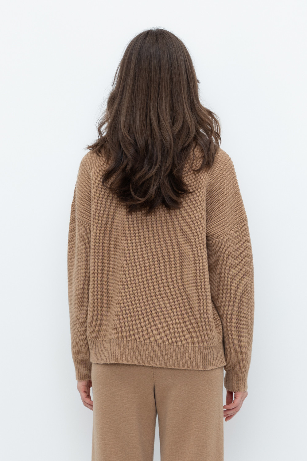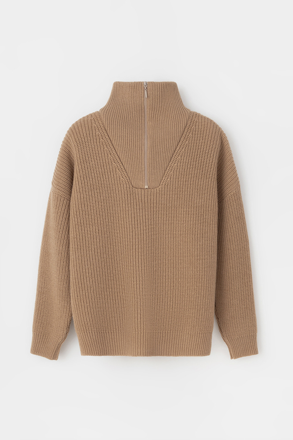 Уютный джемпер в стиле оверсайз со спущенным плечом и объемными рукавами из полушерстяной пряжи. Воротник-стойка застёгивается на молнию.
