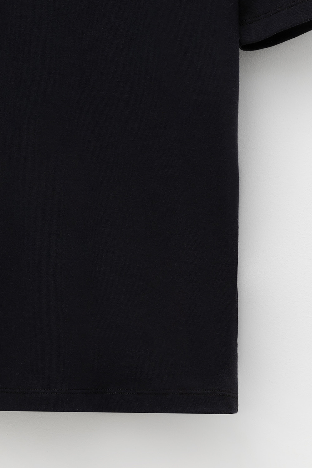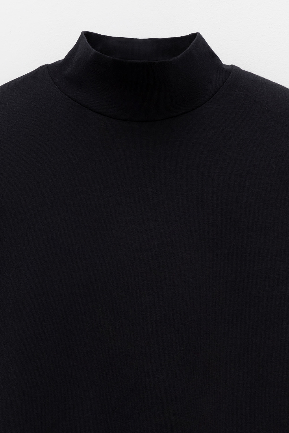 Базовый джемпер с короткими рукавами и воротником-стойкой из плотного однотонного трикотажа супрем с добавлением спандекса.