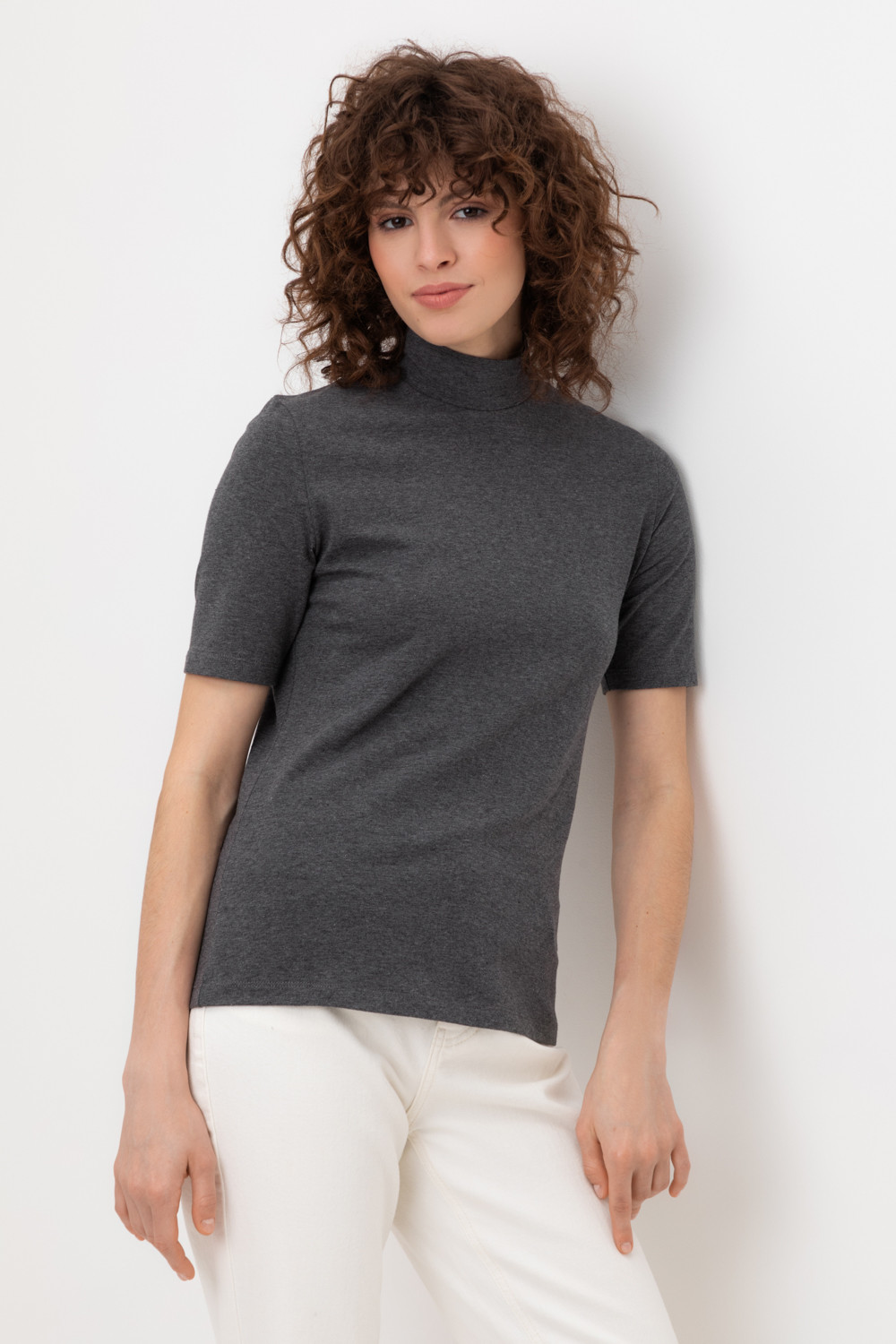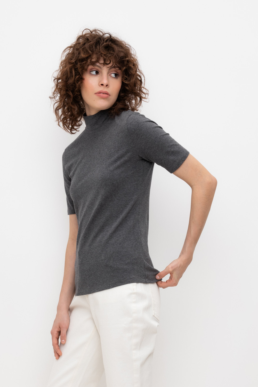 Базовый джемпер с короткими рукавами и воротником-стойкой из плотного однотонного трикотажа супрем с добавлением спандекса.