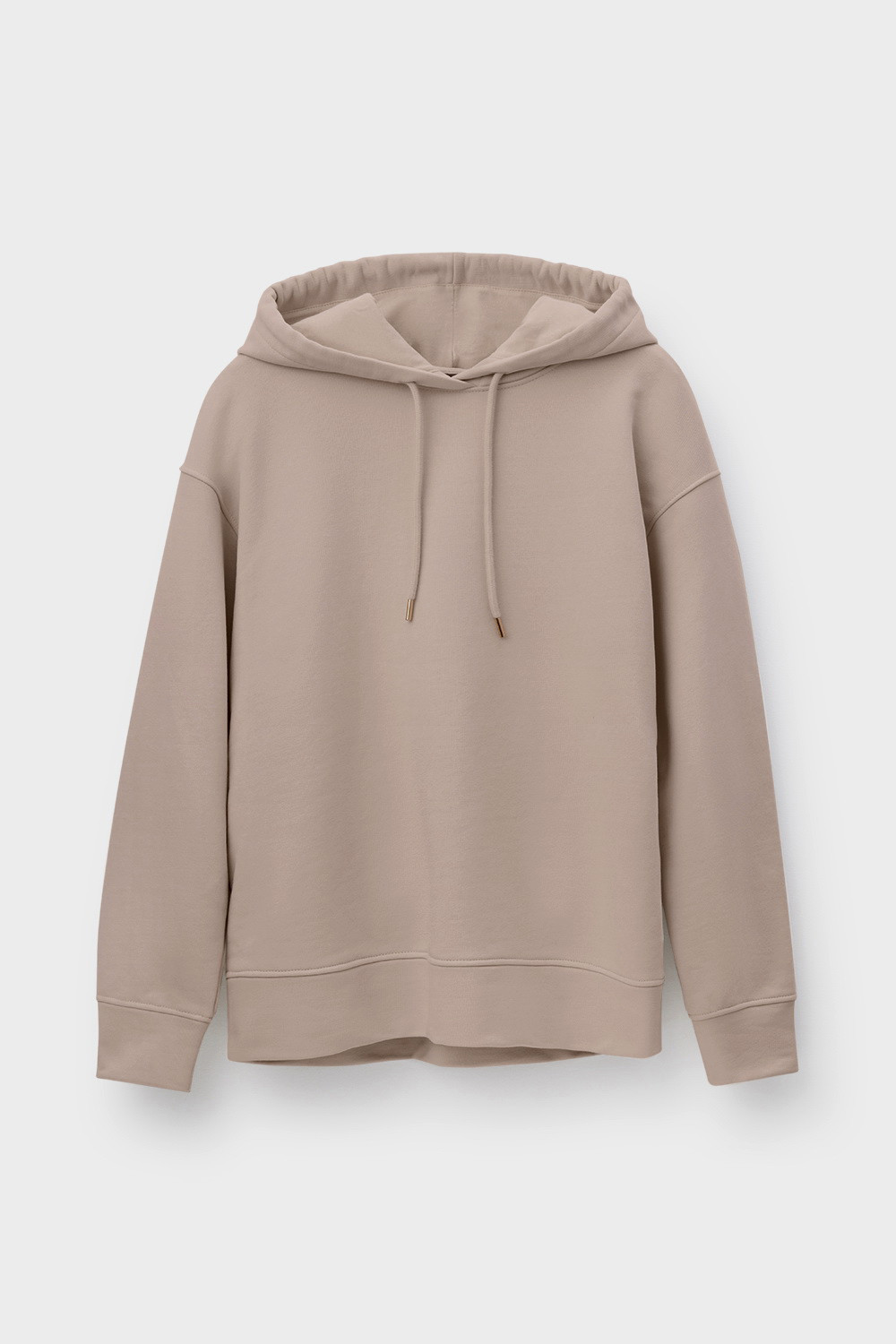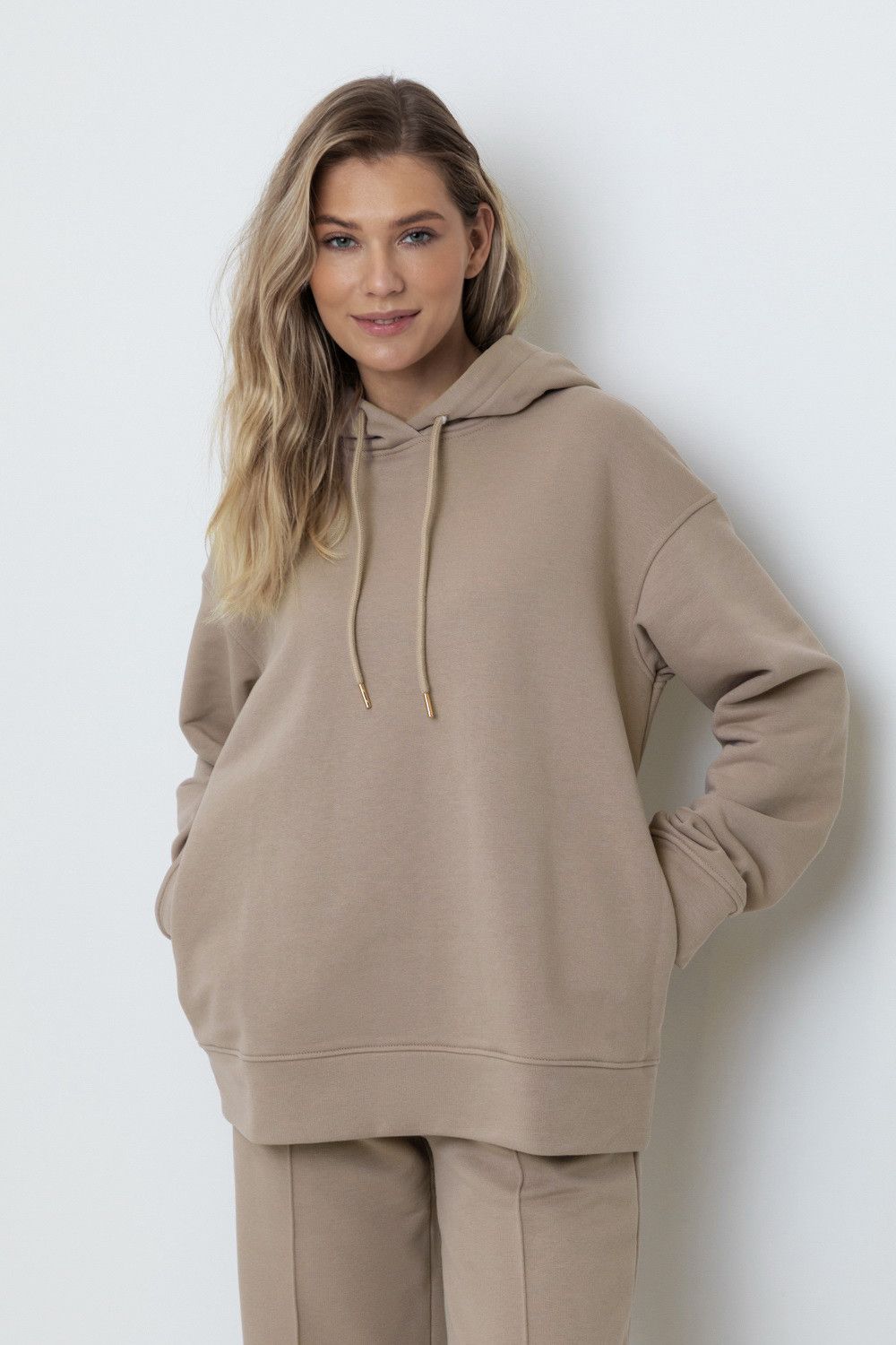 Толстовка с капюшоном и боковыми карманами из петельчатого футера трехнитки. В составе 80% натурального хлопка и 20% полиэстера, при этом полиэстер ввязан внутрь по особой технологии и не соприкасается с кожей. Спущенные рукава, манжеты из основного полотна. Свободный силуэт.