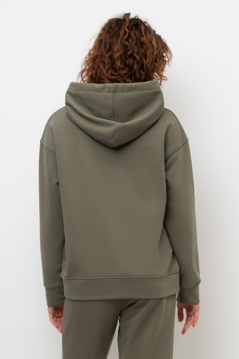 Толстовка с капюшоном и боковыми карманами из петельчатого футера трехнитки. В составе 80% натурального хлопка и 20% полиэстера, при этом полиэстер ввязан внутрь по особой технологии и не соприкасается с кожей. Спущенные рукава, манжеты из основного полотна. Свободный силуэт.