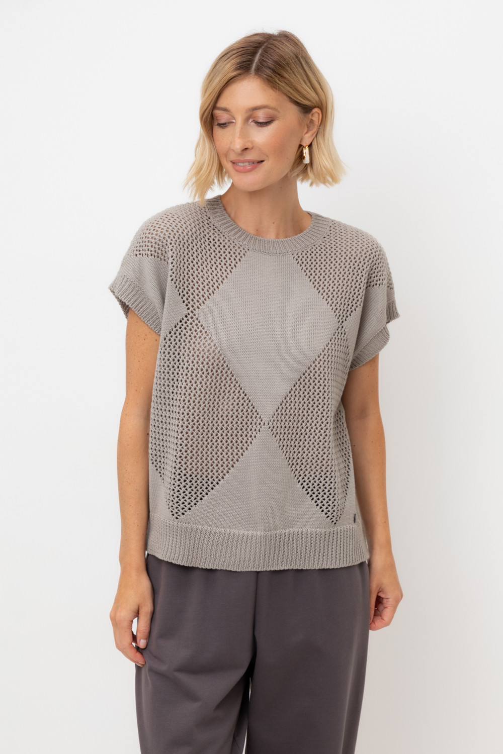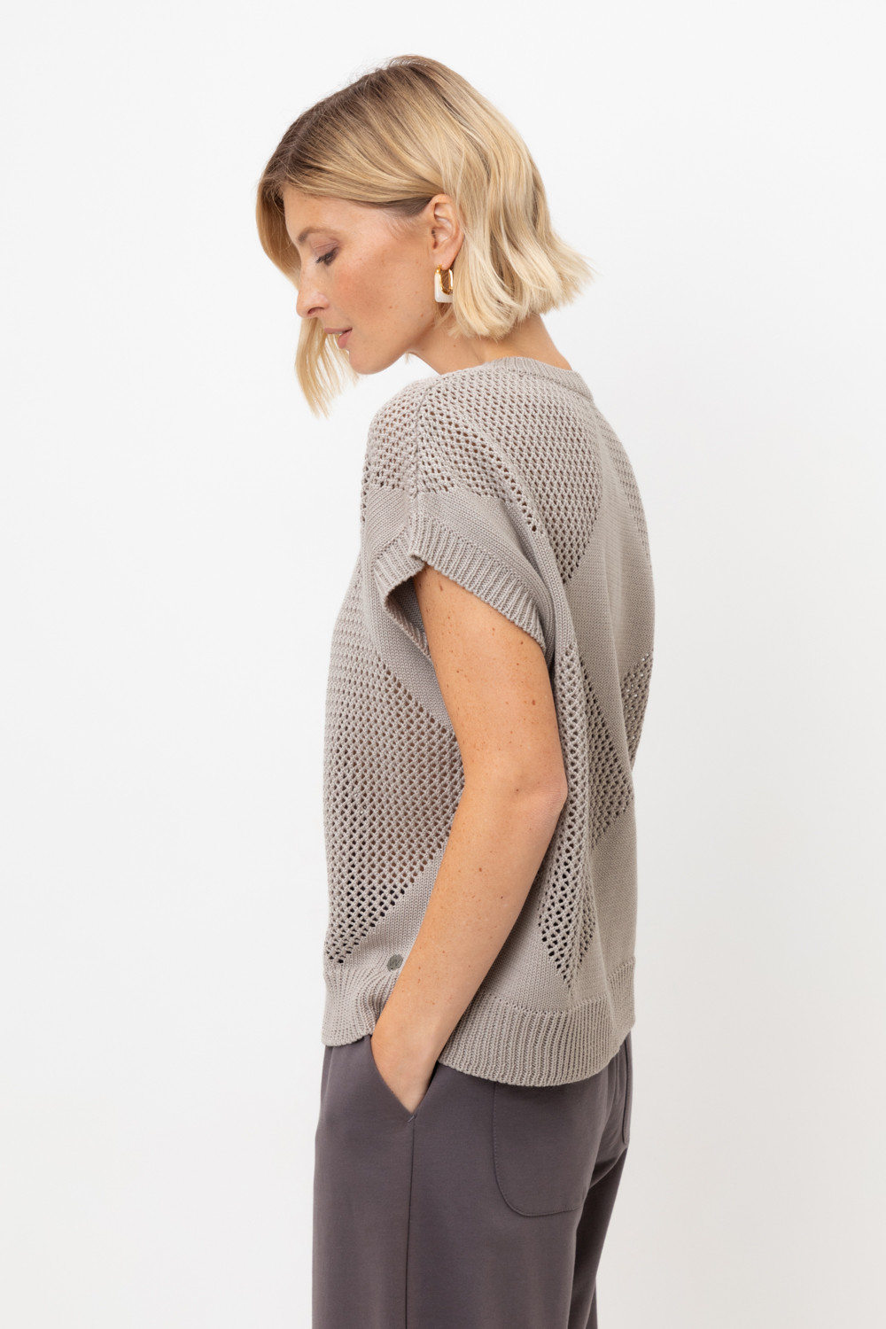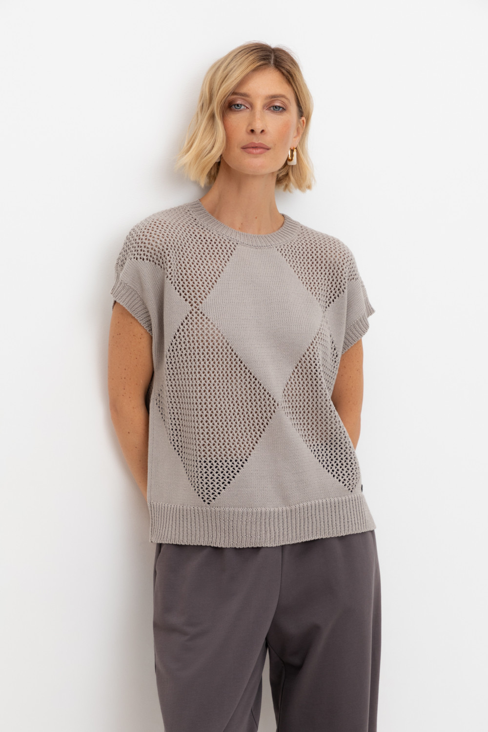 Джемпер со спущенным плечом ажурной вязки из итальянского хлопка. Умеренное переплетение, хлопок в составе придают изделию форму и ощущение комфорта во время носки. Незаменим в повседневном летнем гардеробе.