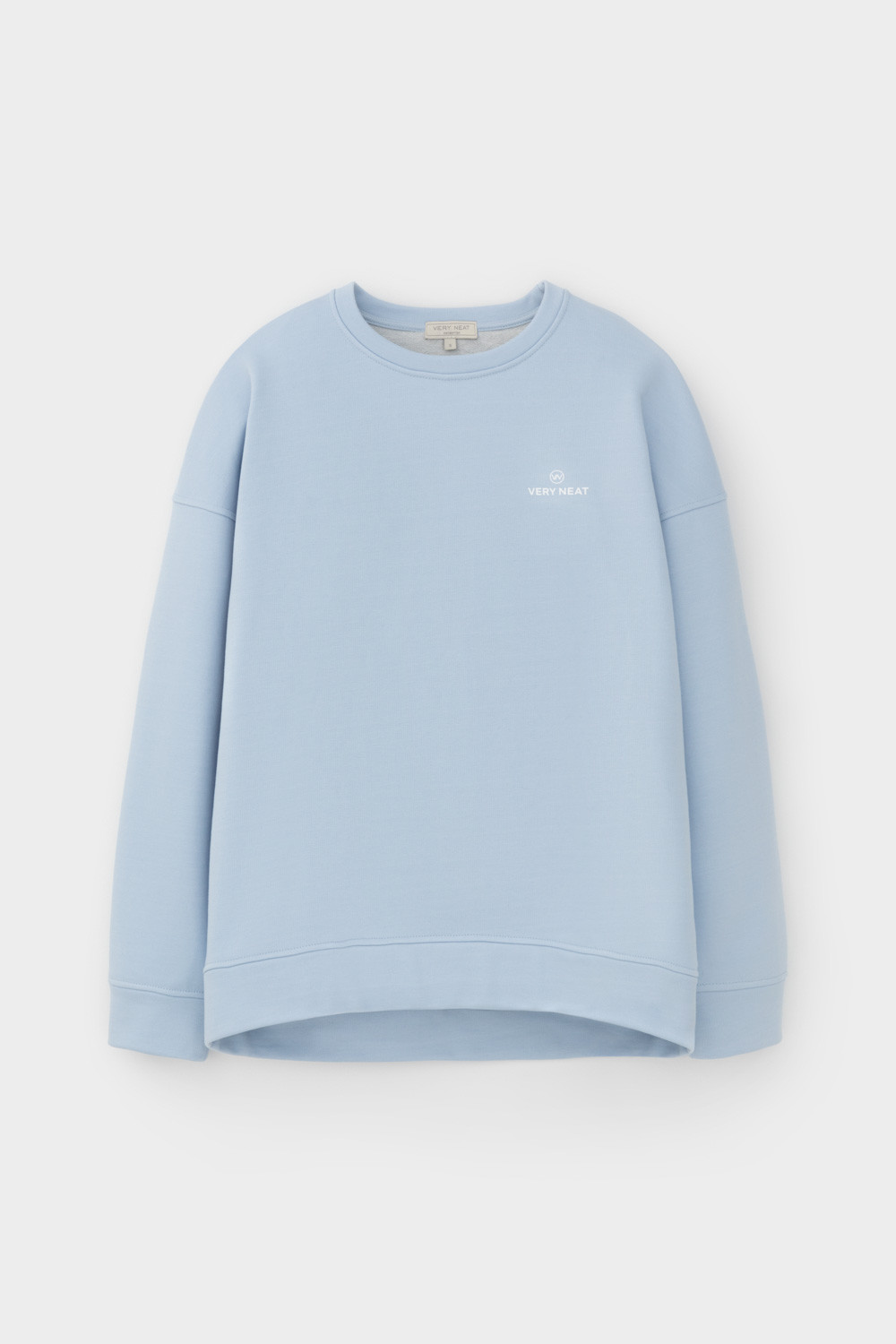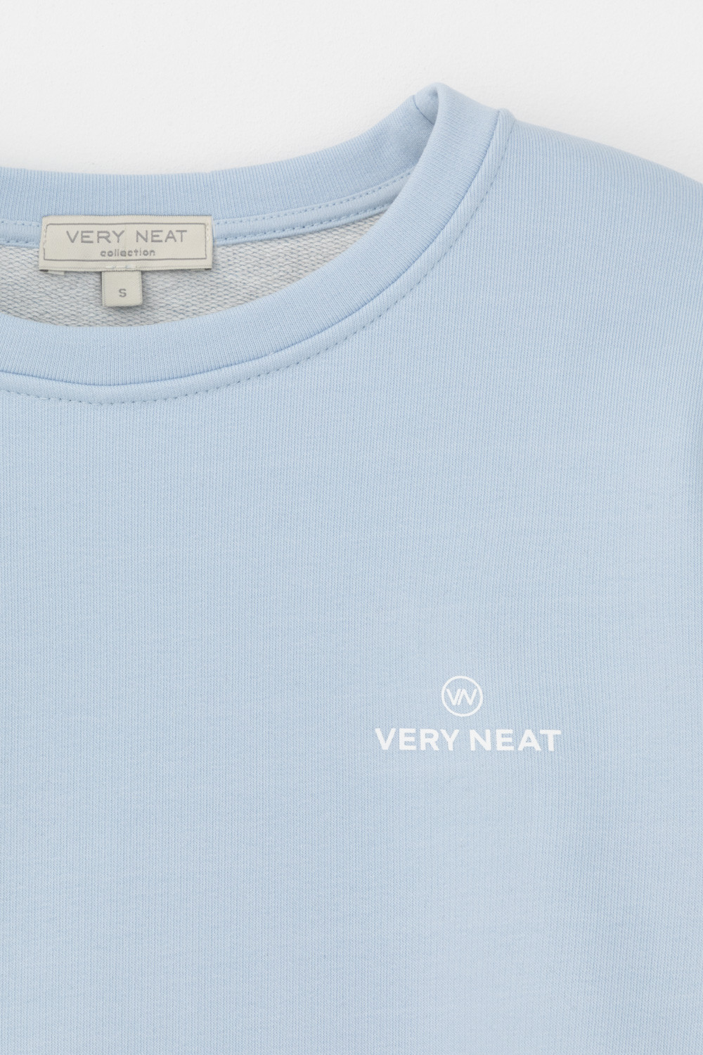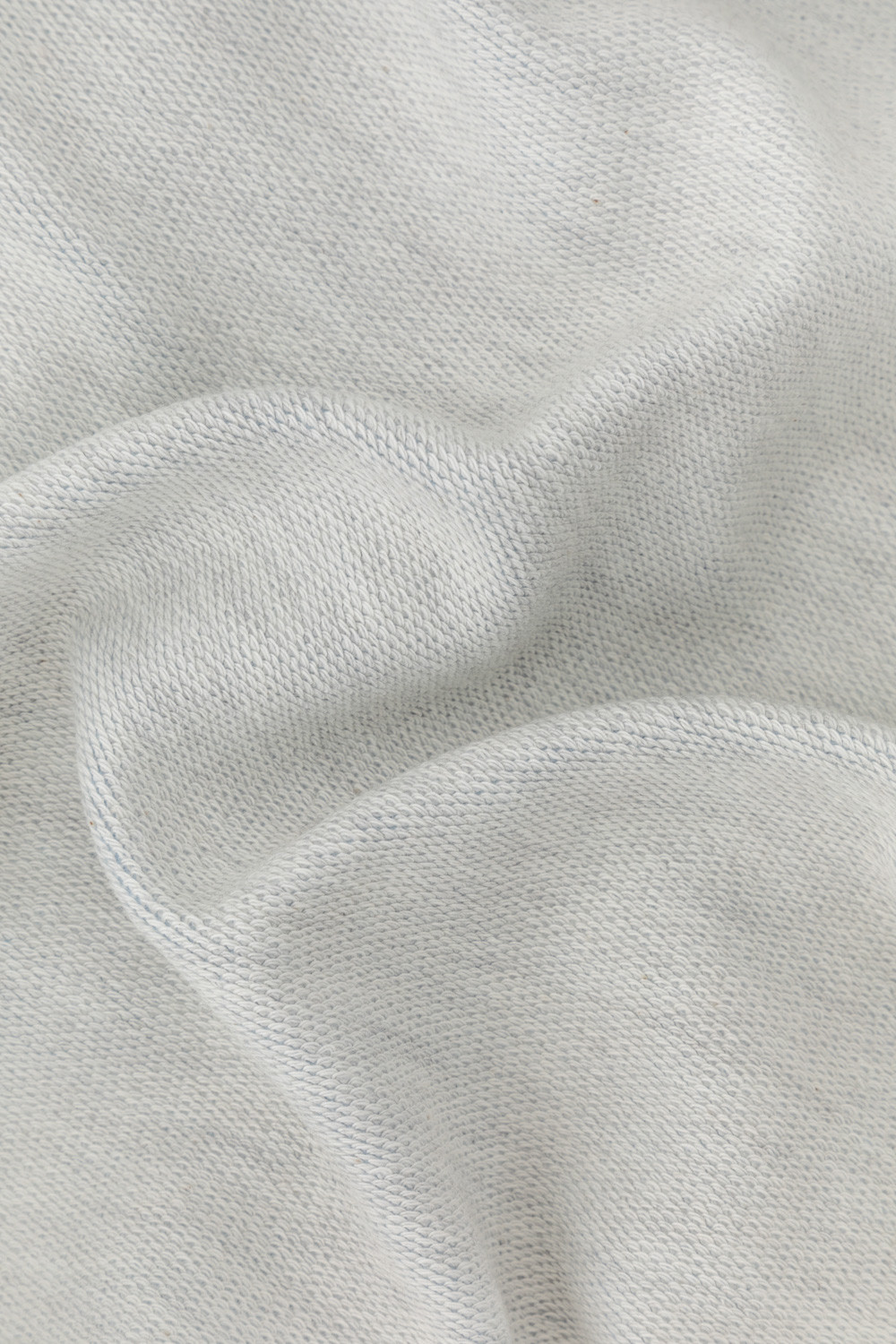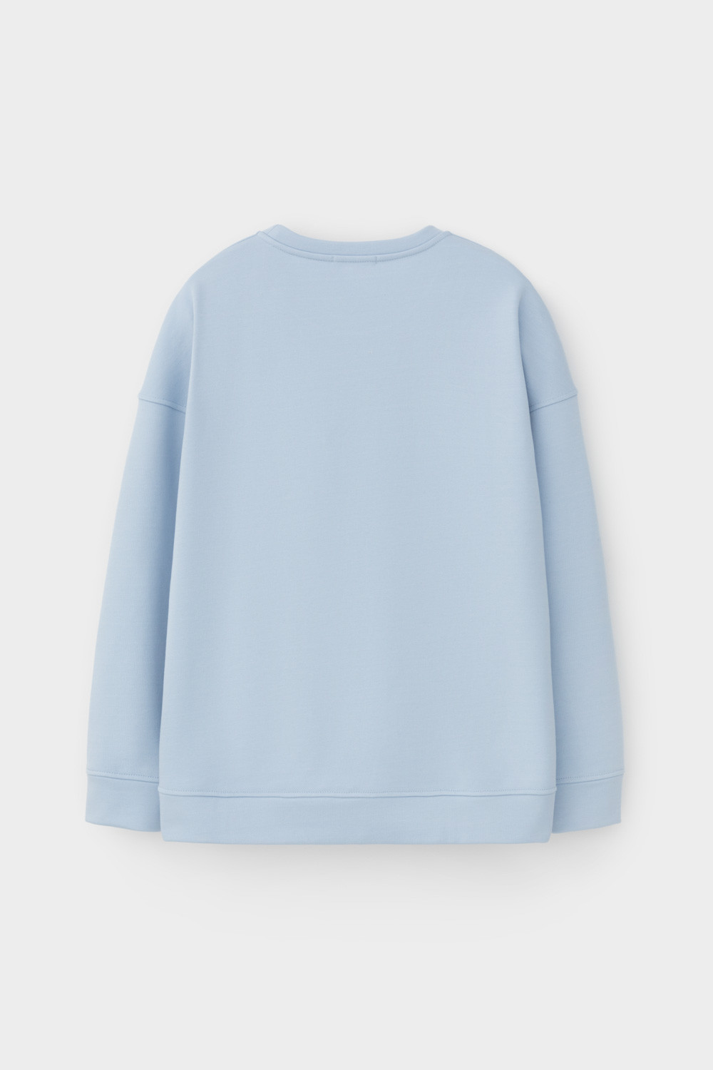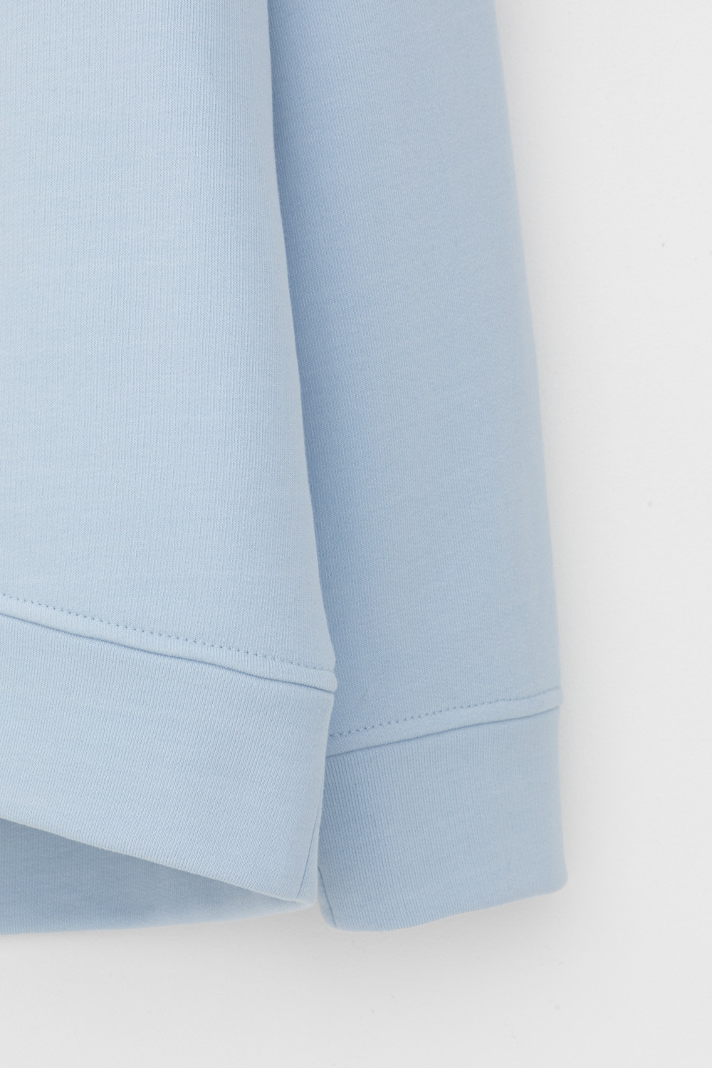 Объемный свитшот из двухцветного трикотажного футера. Внутренняя сторона изделия представлена в натуральном цвете хлопка, внешняя в нежно-голубом. За счет использования крашенной пряжи, данный вид полотна прошел минимальную обработку, что придало изделию мягкость и шелковистость.