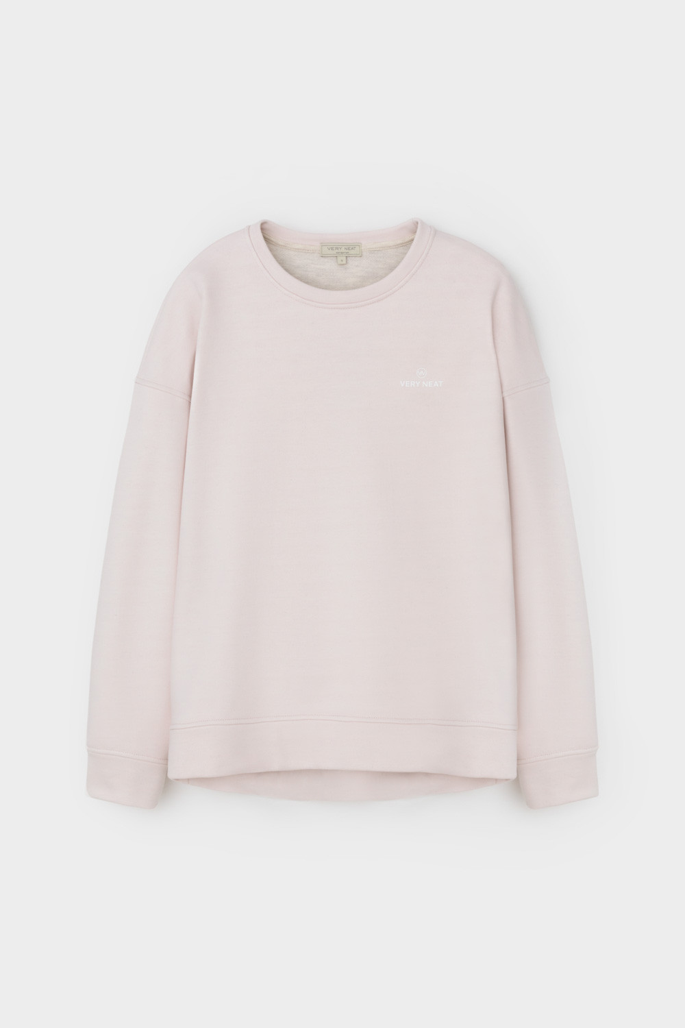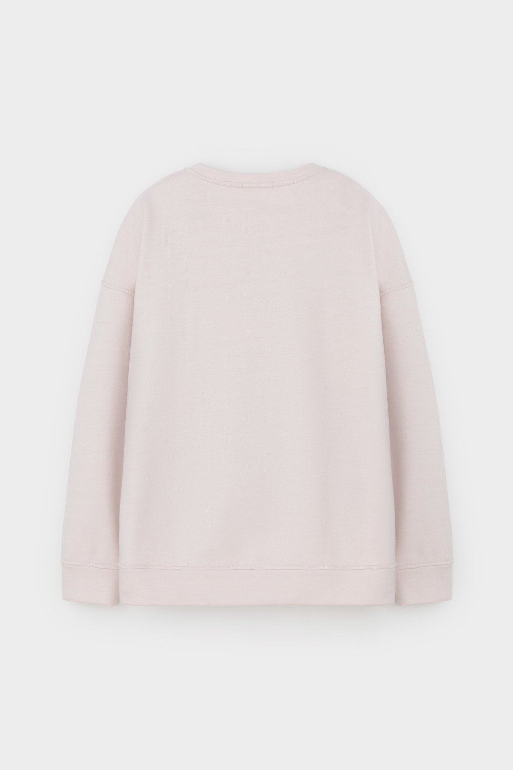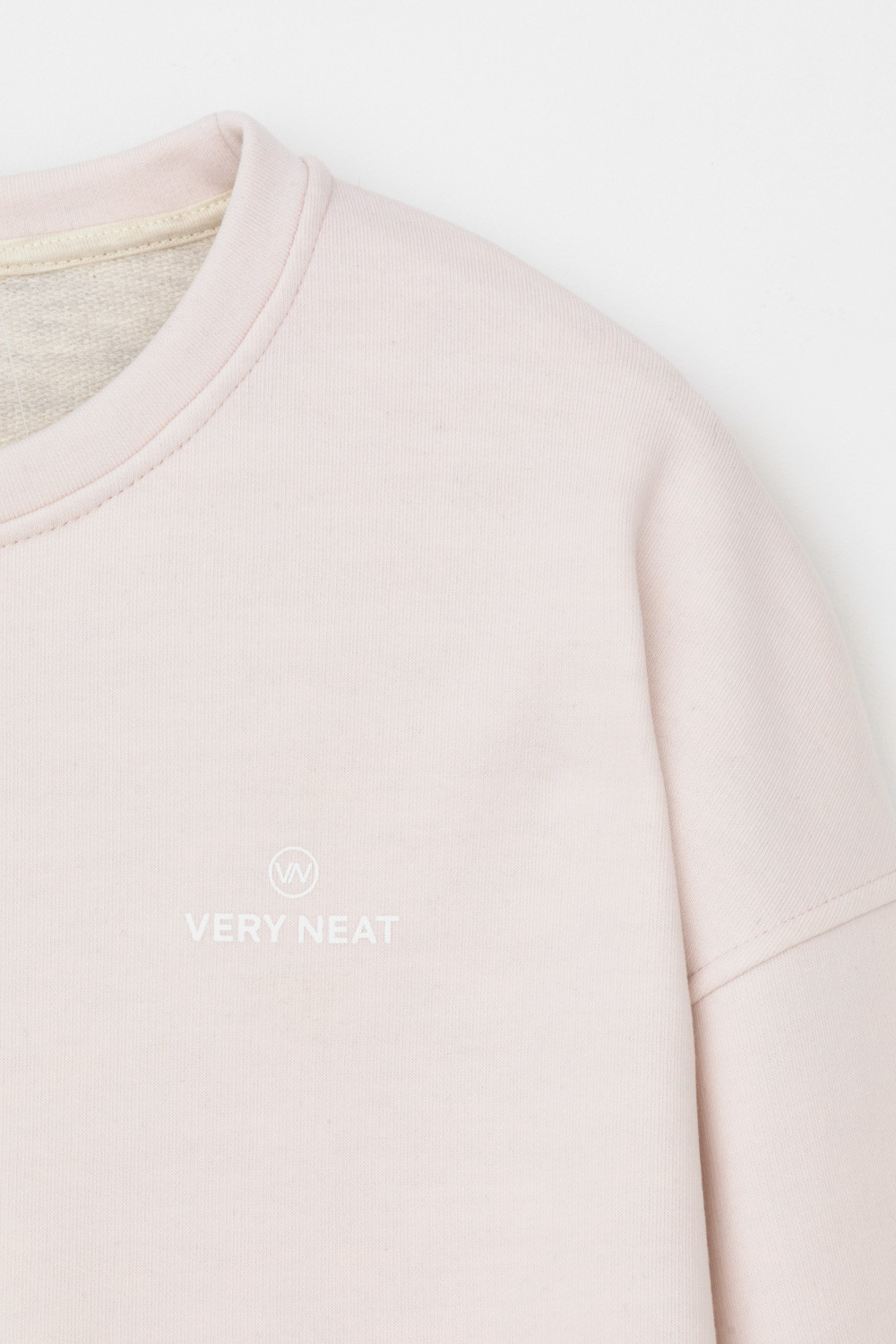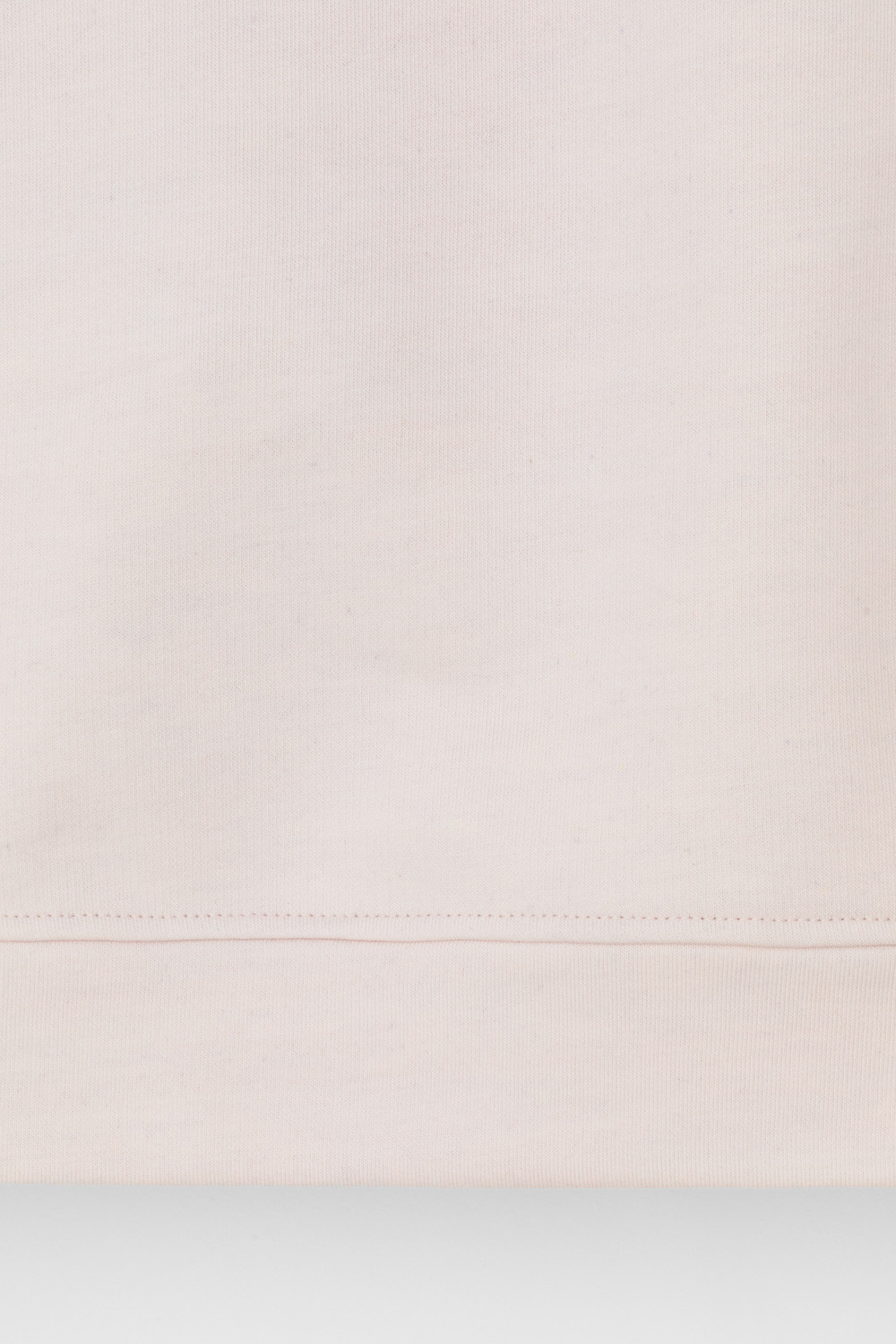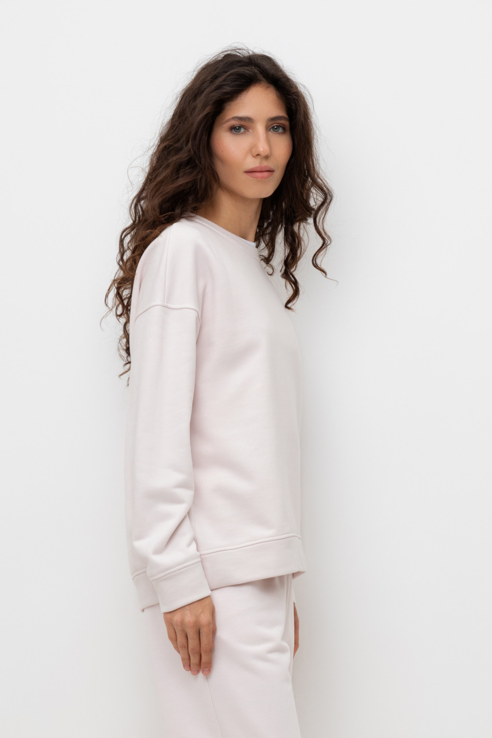 Объемный свитшот из двухцветного трикотажного футера. Внутренняя сторона изделия представлена в натуральном цвете хлопка, внешняя в нежно-розовом. За счет использования крашенной пряжи, данный вид полотна прошел минимальную обработку, что придало изделию мягкость и шелковистость.