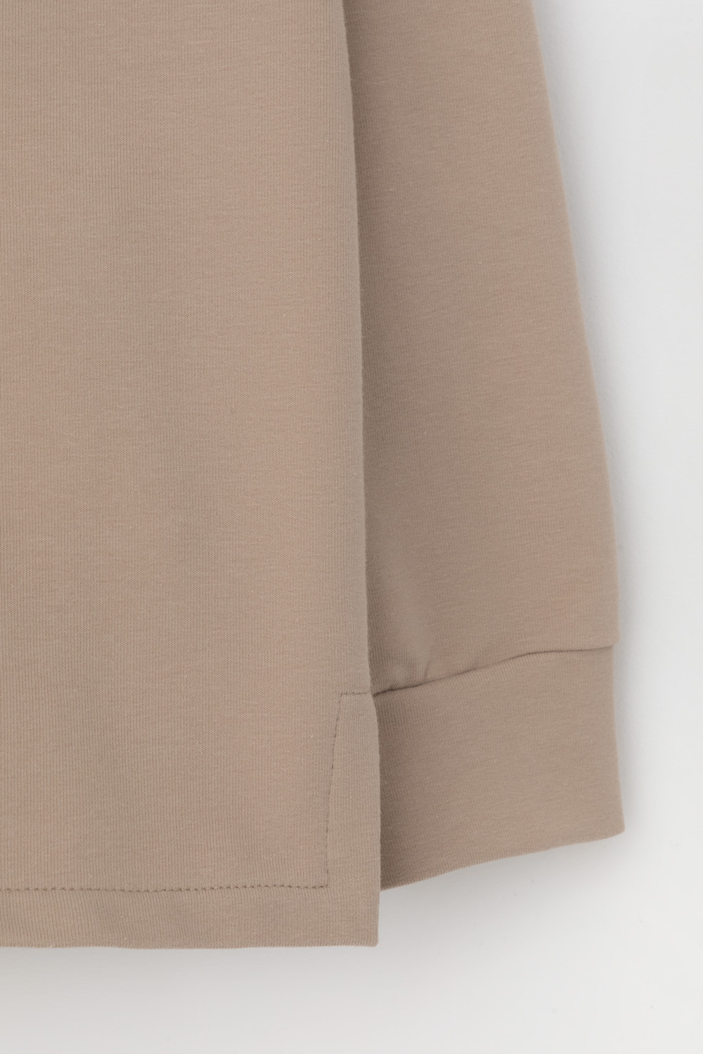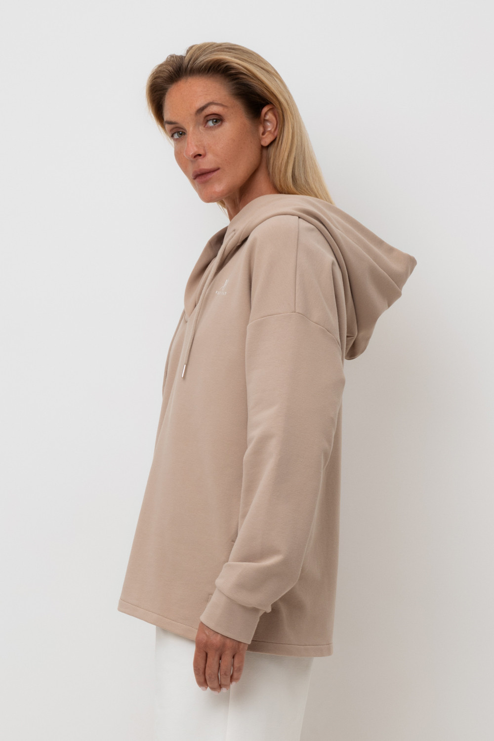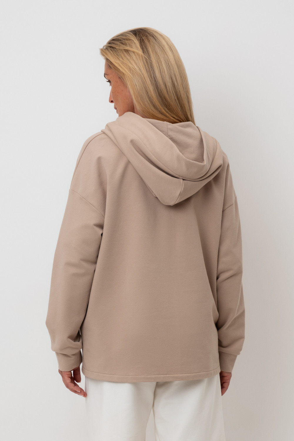 Подарите себе ощущение комфорта и уюта с худи из мягкого эластичного футера в теплом песочном оттенке. Спущенные плечи, удлиненная спинка и объёмный капюшон в сочетании с вместительными карманами придают изделию расслабленный вид.