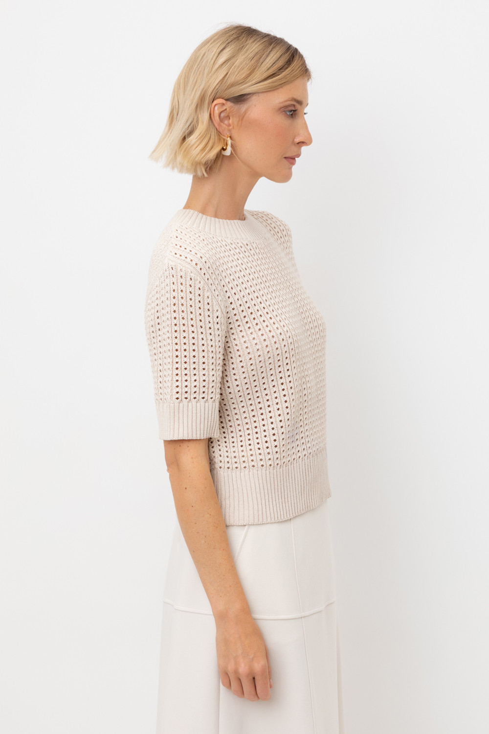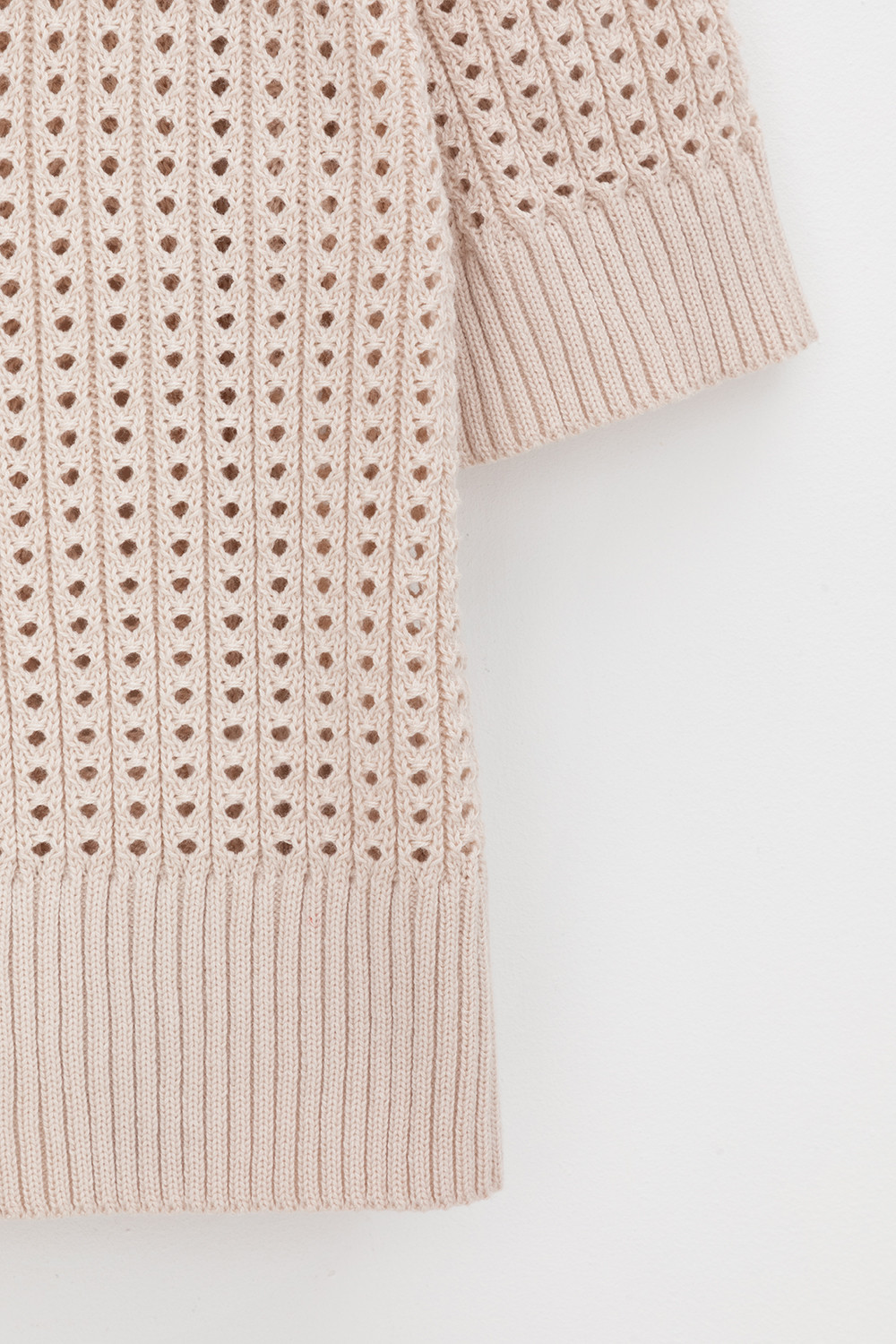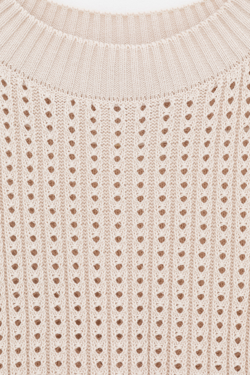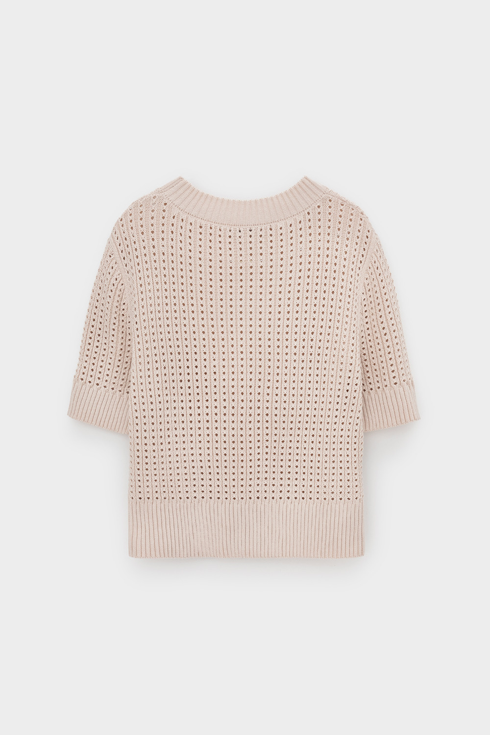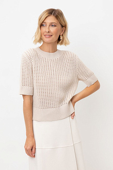 Джемпер с коротким рукавом ажурной вязки из итальянского хлопка. Умеренное переплетение, хлопок в составе придают изделию форму и дают ощущение комфорта во время носки. Незаменим в повседневном летнем гардеробе.
