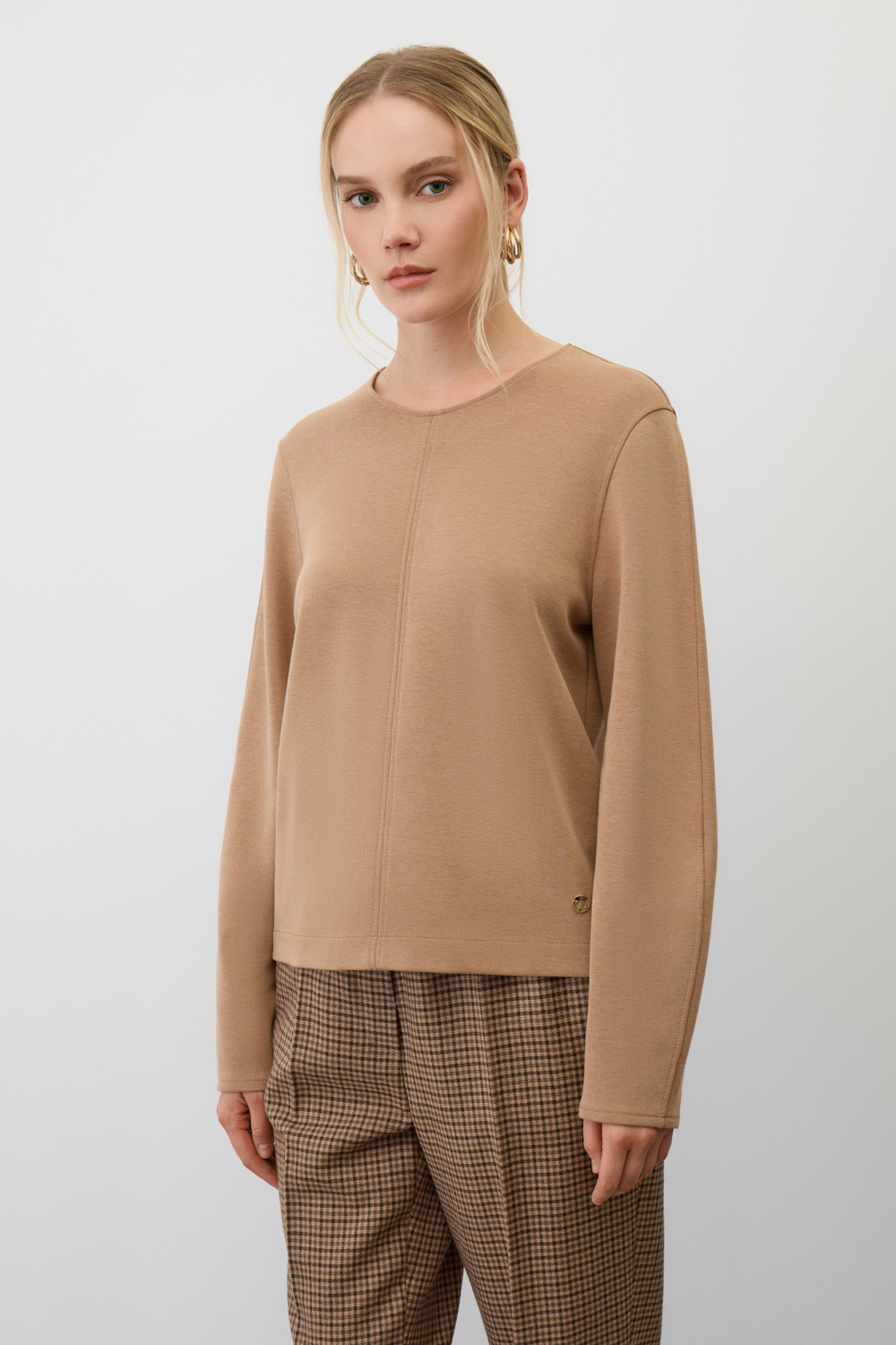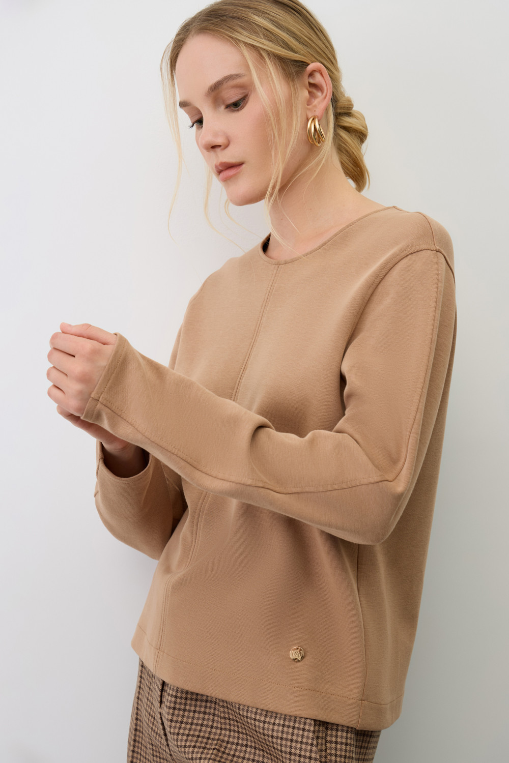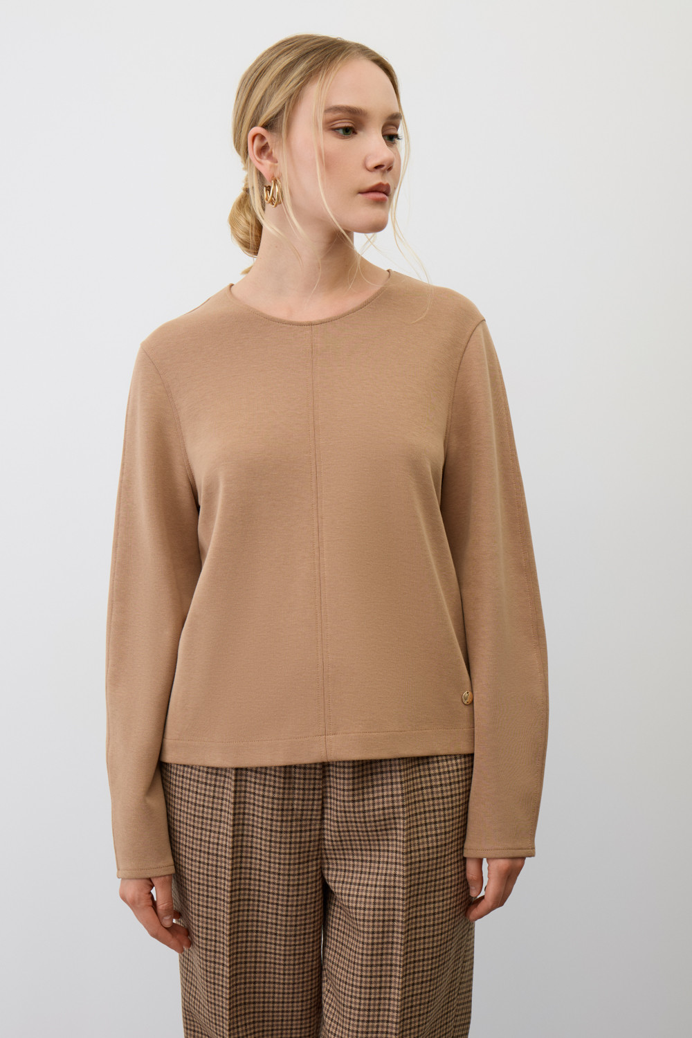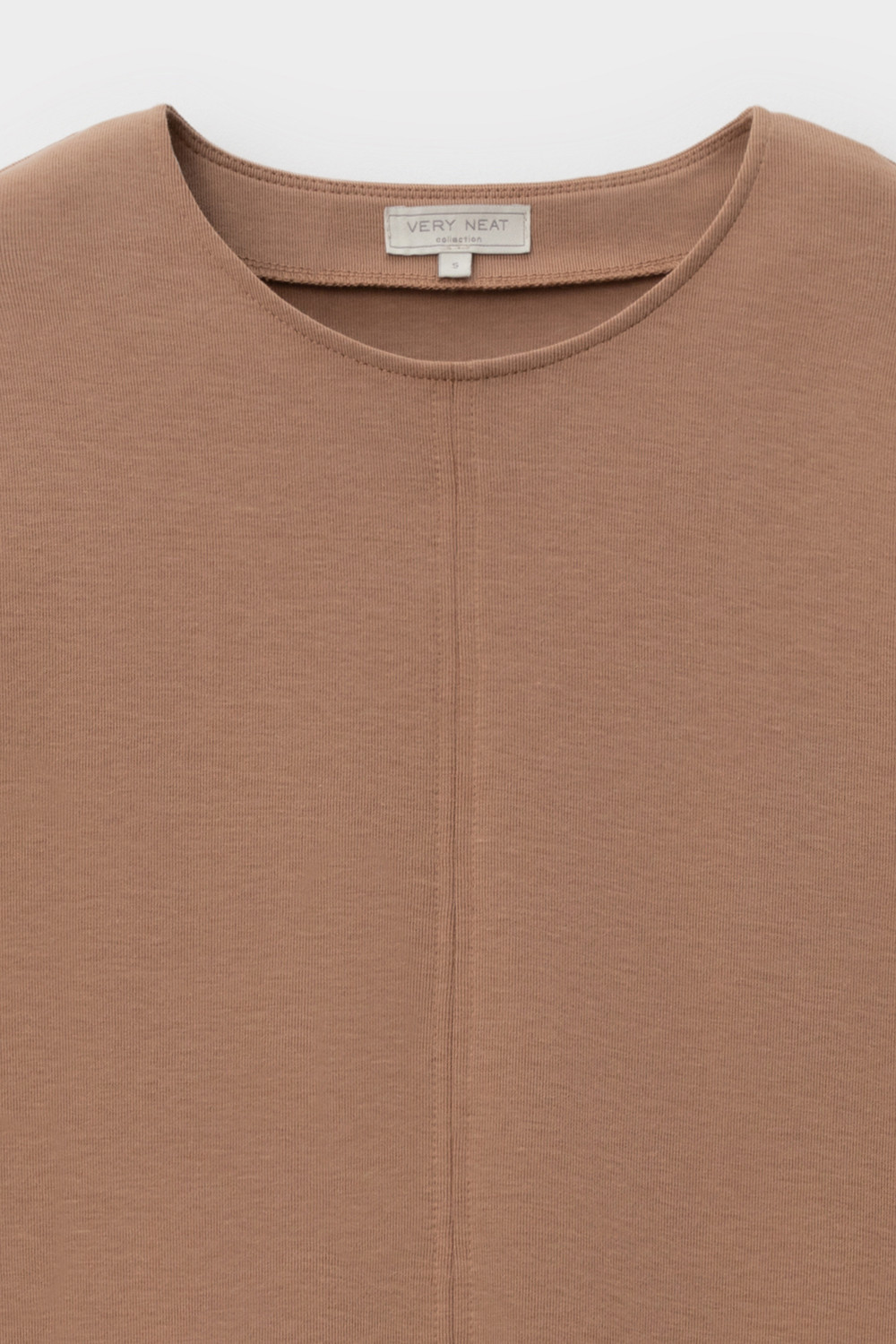 Модель имеет классический круглый вырез, что делает ее универсальной. Удобный прямой крой и рельефный шов, расположенный по центру, добавляют изделию оригинальности.