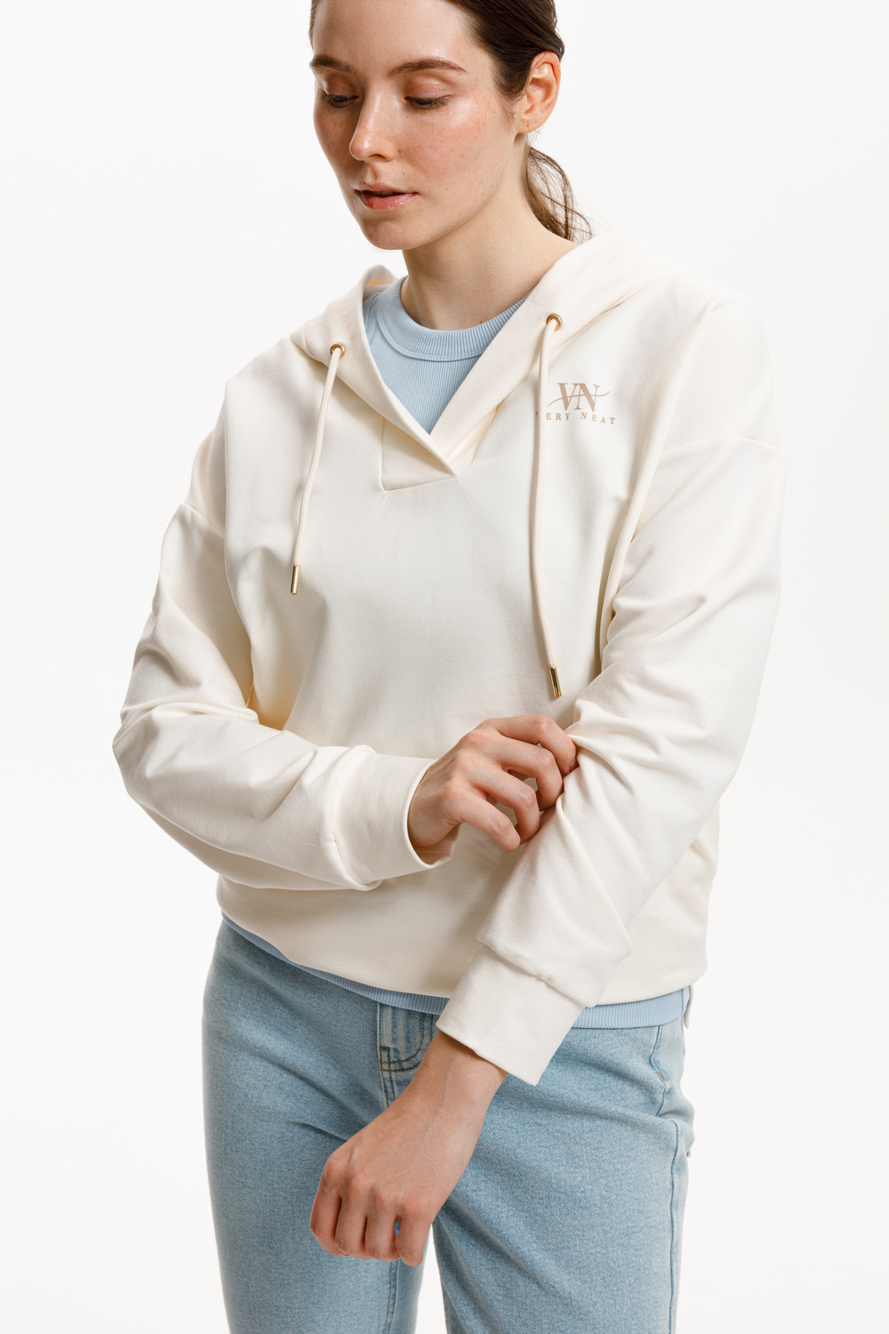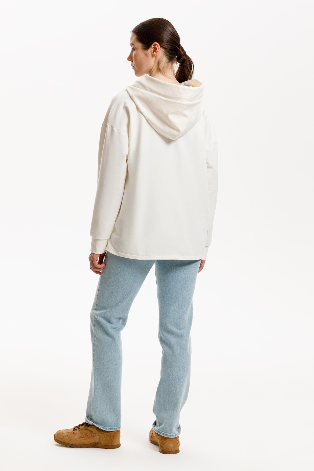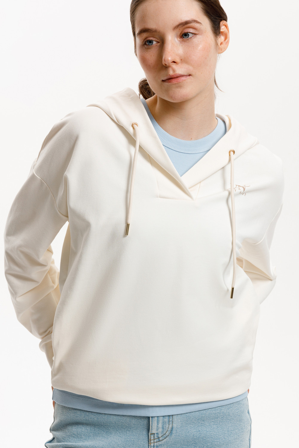 Подарите себе ощущение комфорта и уюта с худи из мягкого эластичного футера в теплом молочном оттенке. Спущенные плечи, удлиненная спинка и объёмный капюшон в сочетании с вместительными карманами придают изделию расслабленный вид.