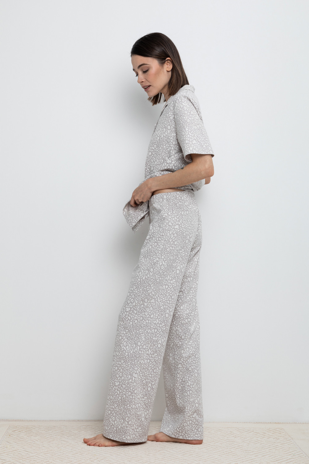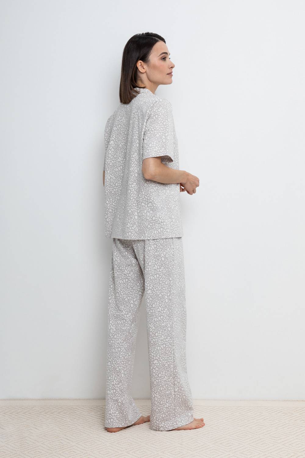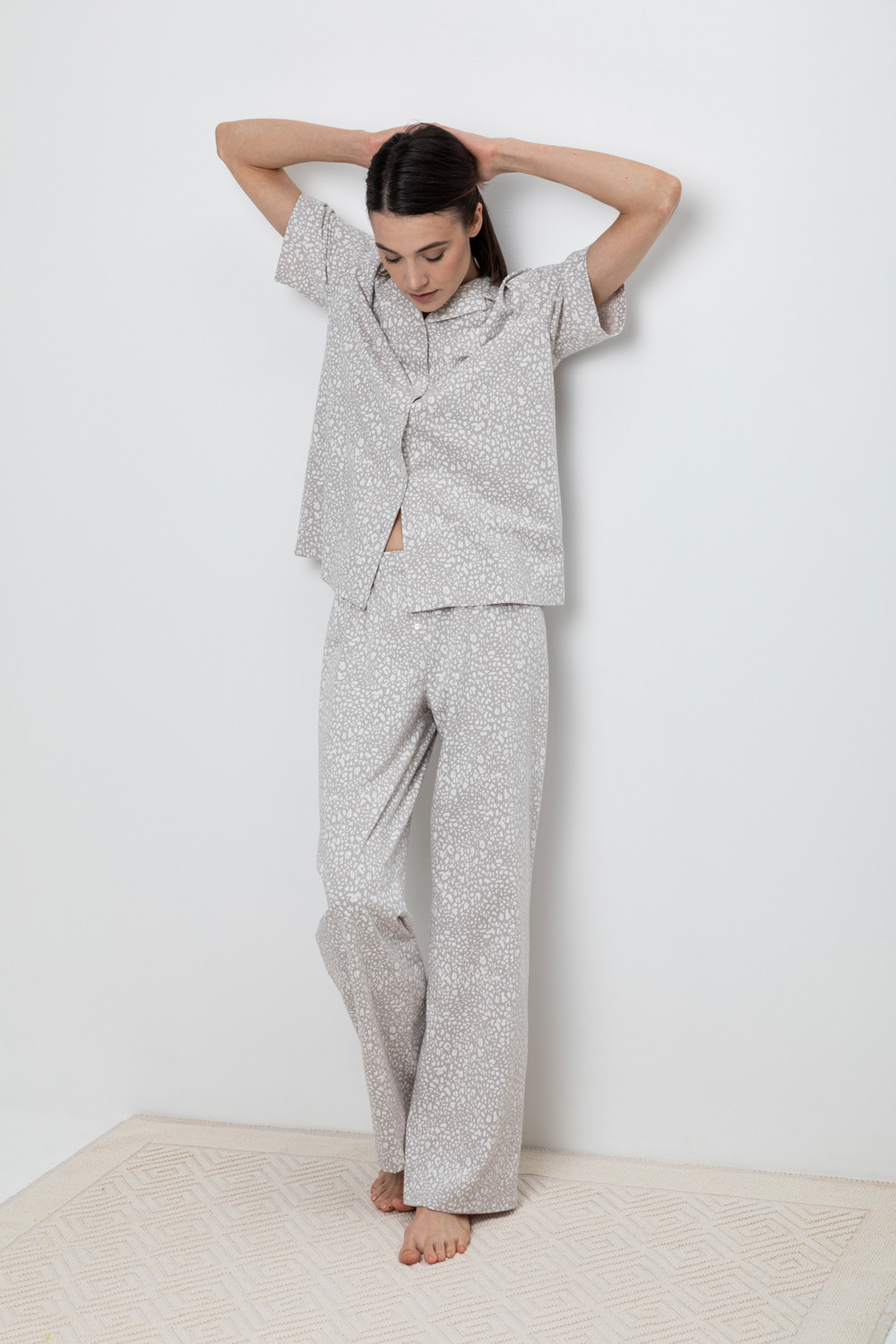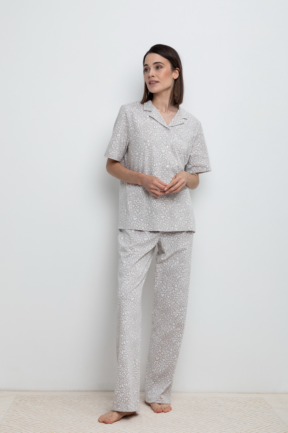 Комплект для комфортного сна и отдыха из набивного трикотажа из 100% натурального хлопка. Рубашка с короткими рукавами на пуговицах. Брюки с мягким поясом на резинке. Гладкий материал приятен к телу, не теряет форму и позволяет коже дышать.