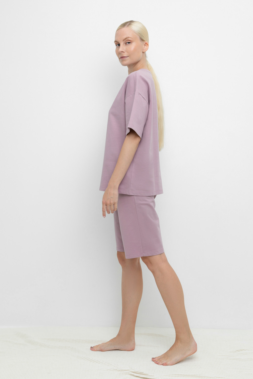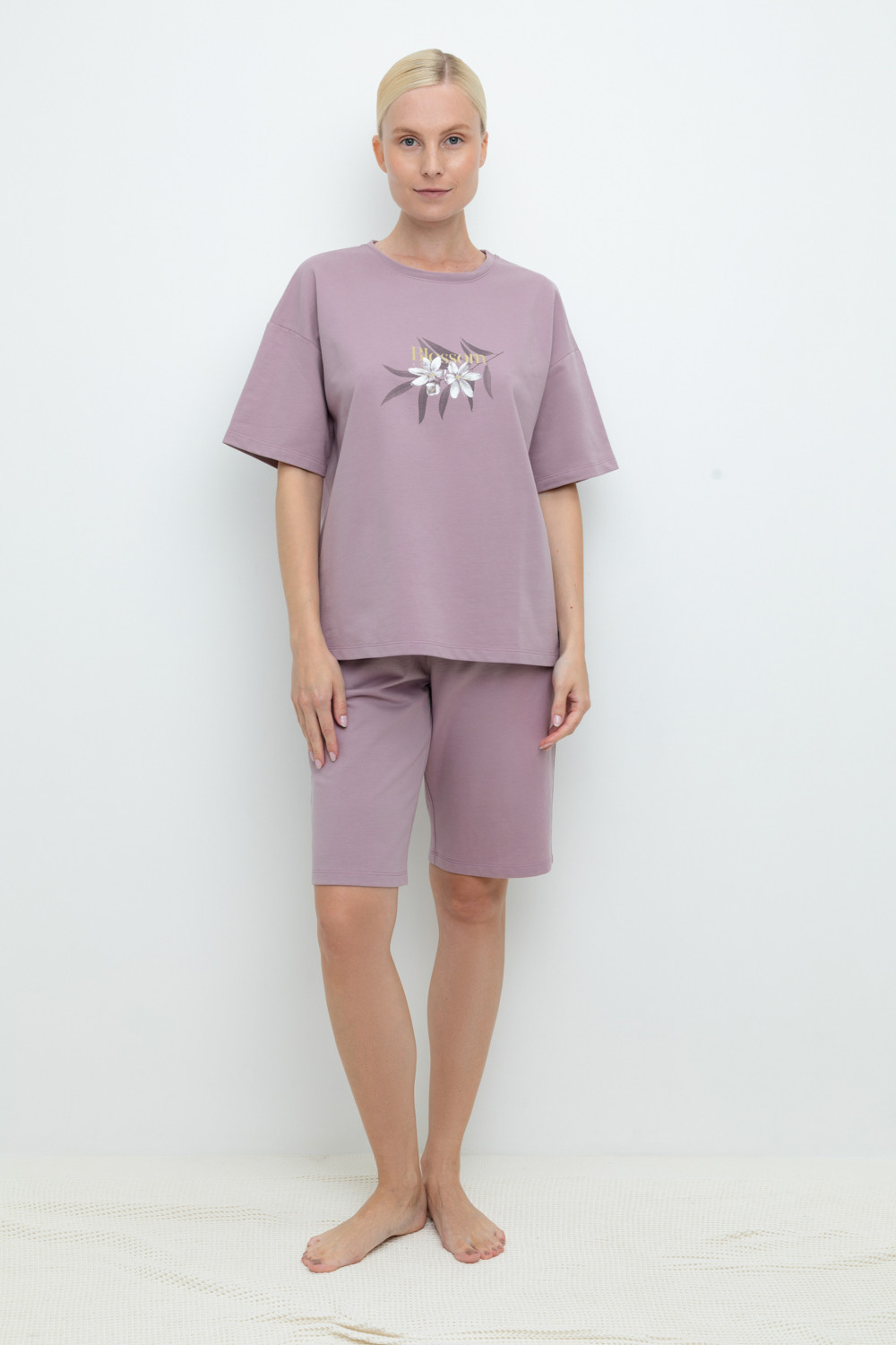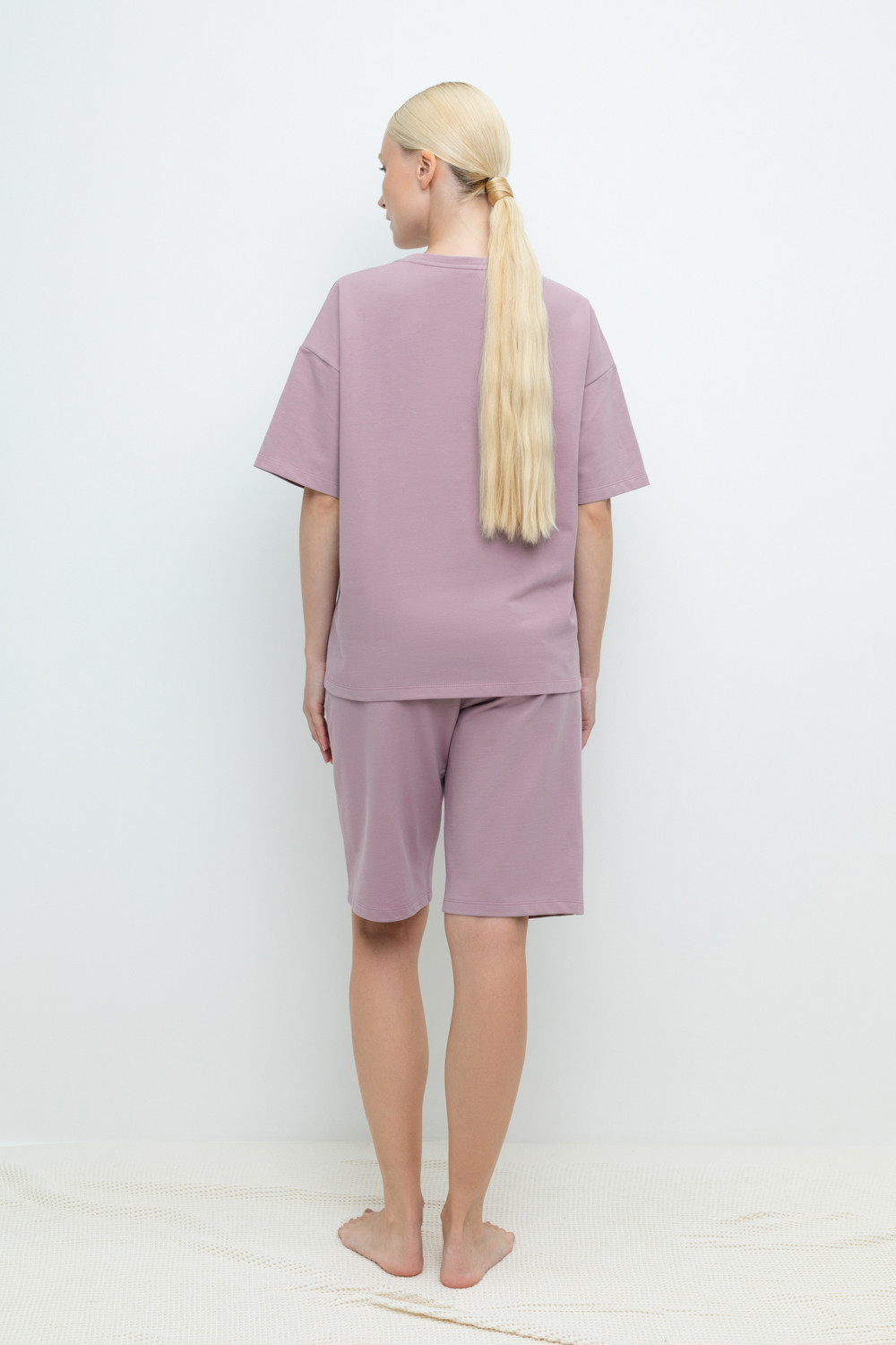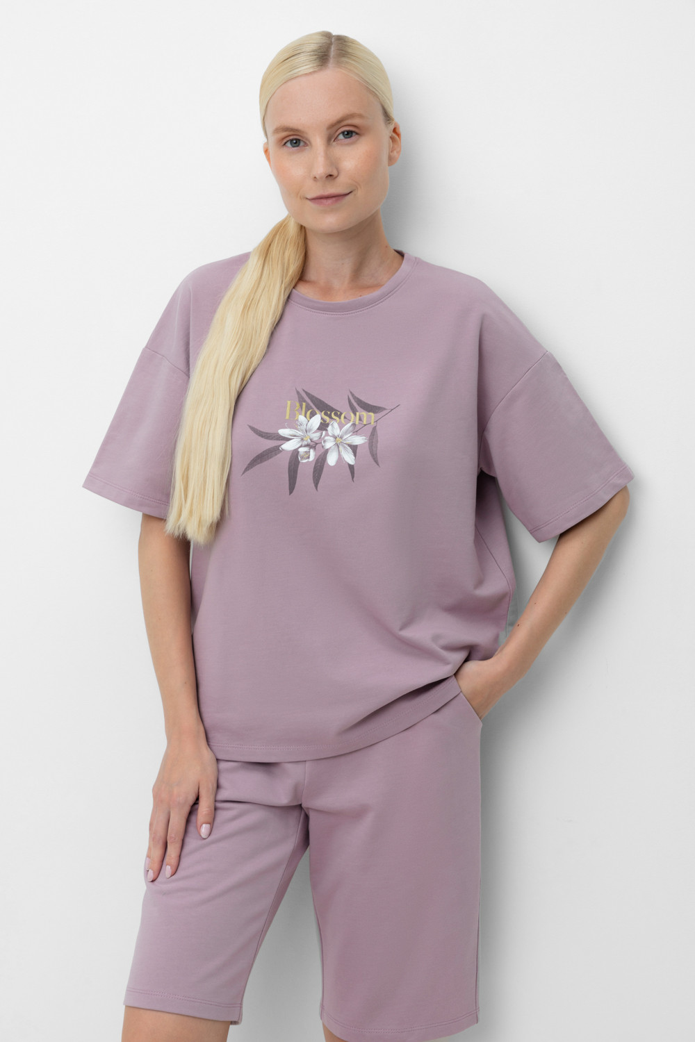 Комплект для комфортного отдыха из мягкого футера. Футболка с короткими рукавами и спущенной линией плеча комфортно садится по фигуре. Шорты с карманами и мягким поясом на резинке. Свободный силуэт не сковывает движения.