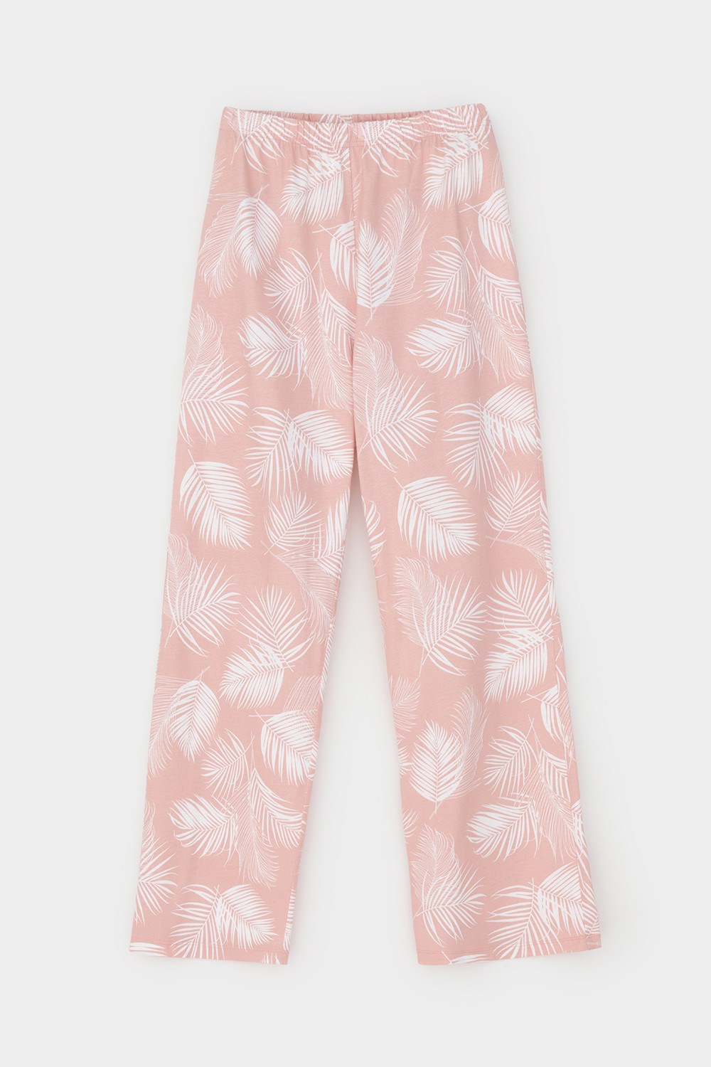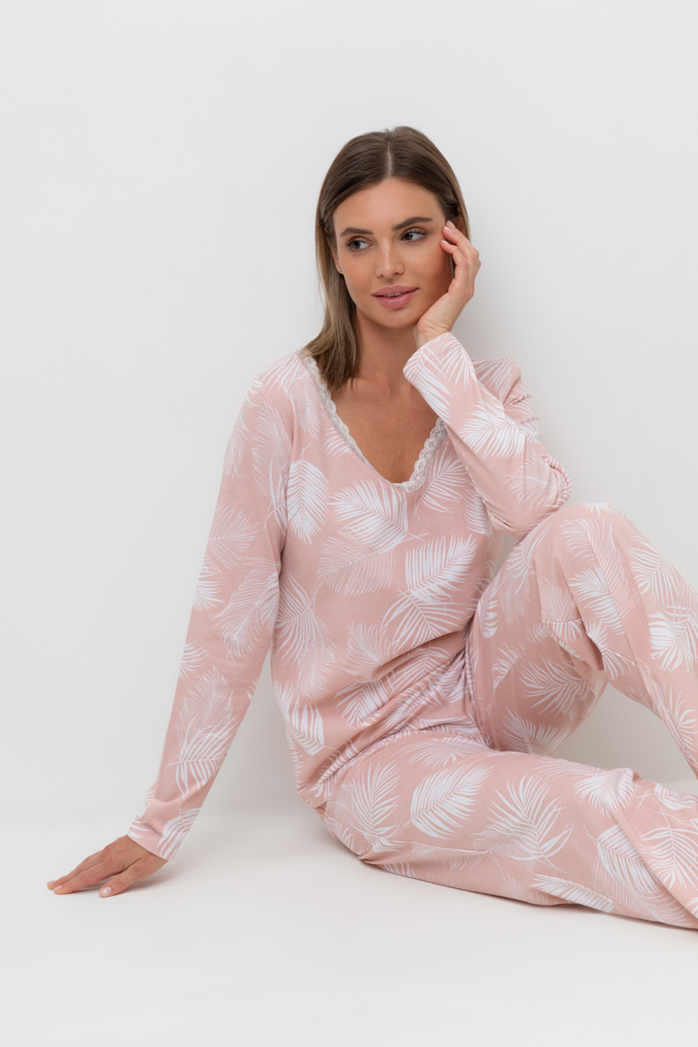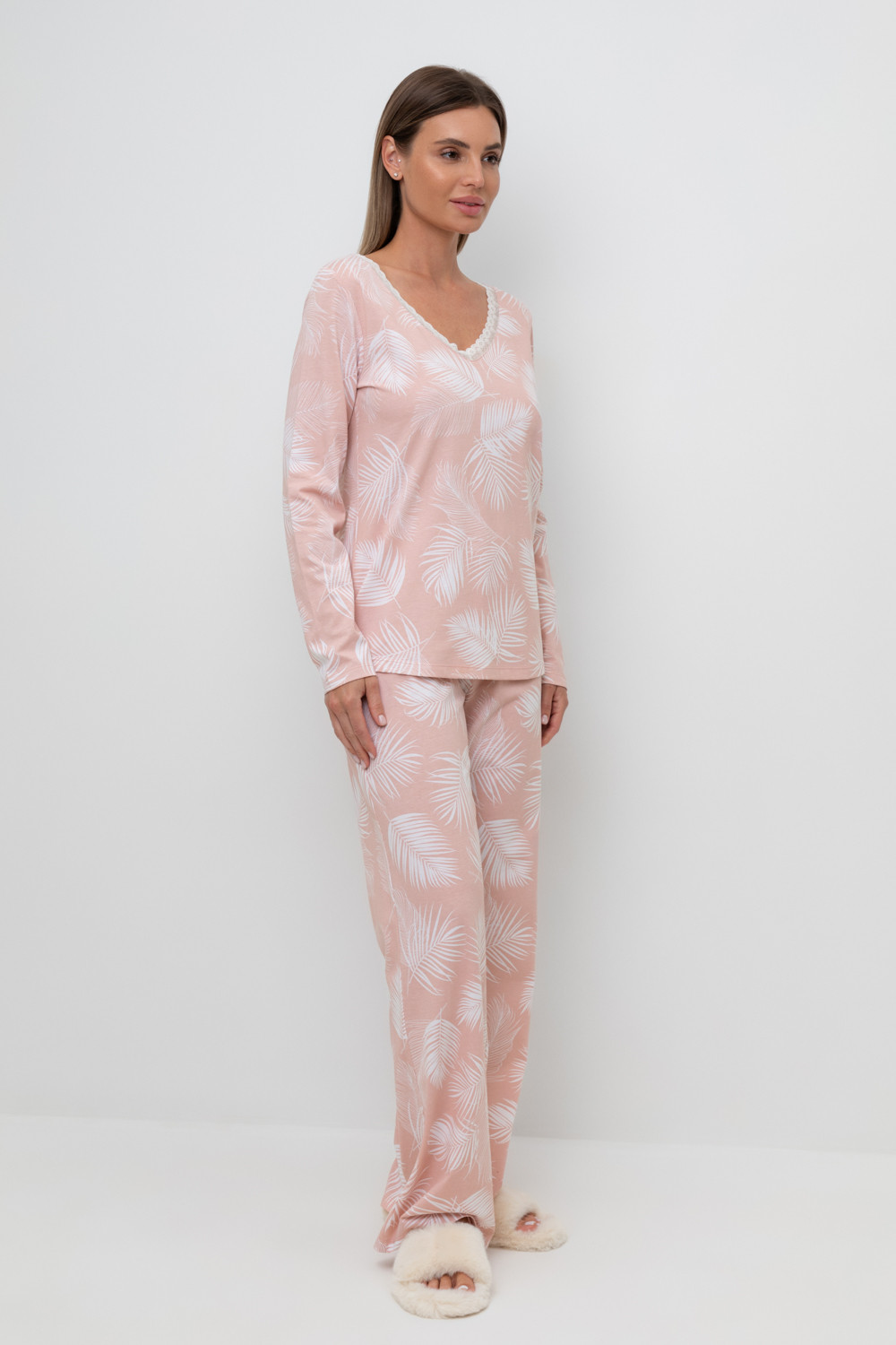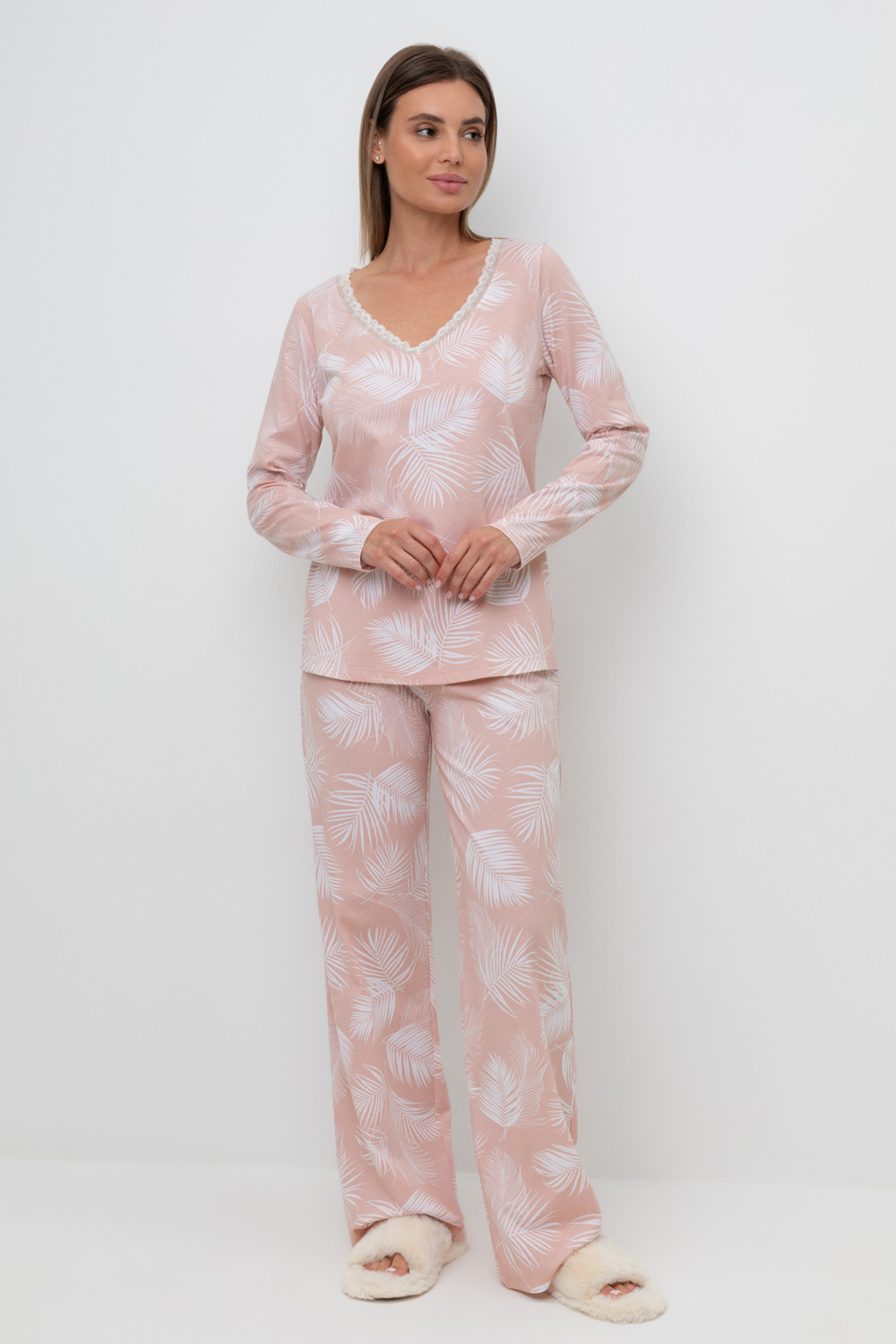 Легкий комплект для комфортного сна и отдыха набивного трикотажа с нежным рисунком из 100% натурального хлопка. Джемпер с V-образным вырезом, украшенный эластичным кружевом комфортно садится по фигуре.  Брюки с поясом на резинке и атласной лентой. Гладкий материал приятен к телу и позволяет коже дышать.