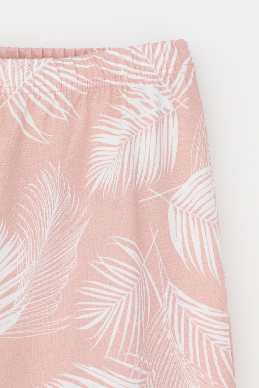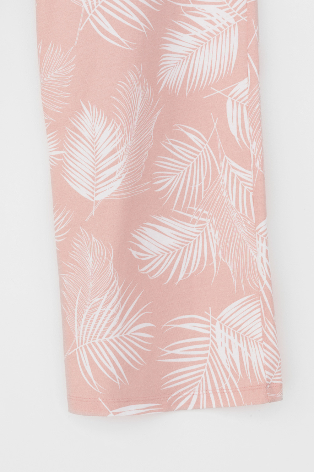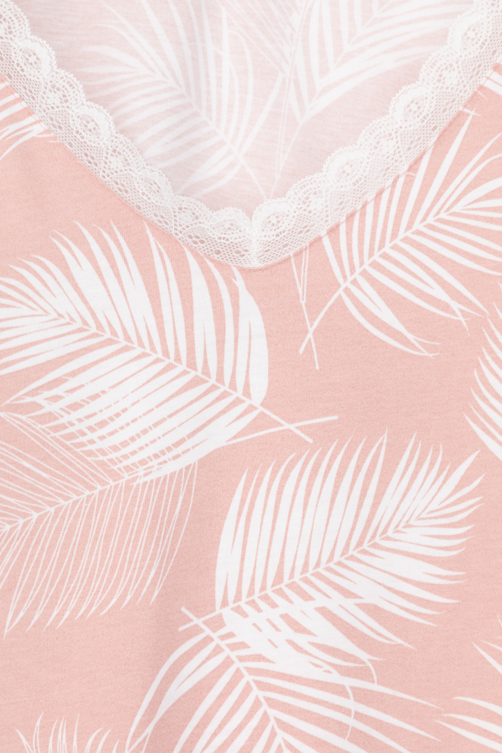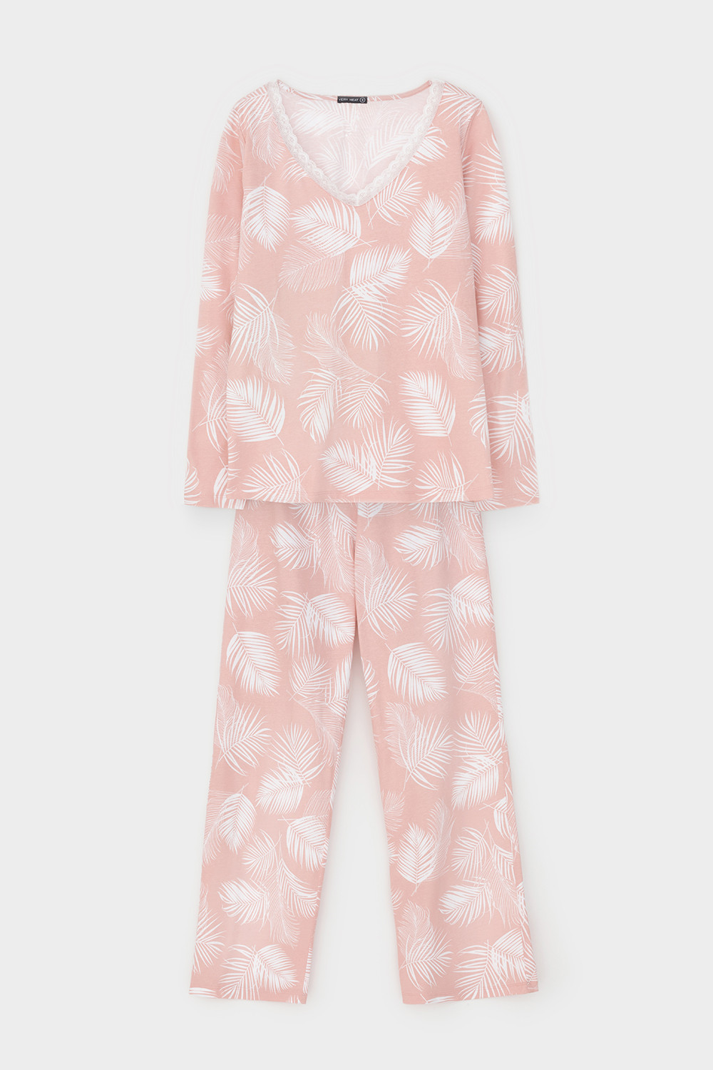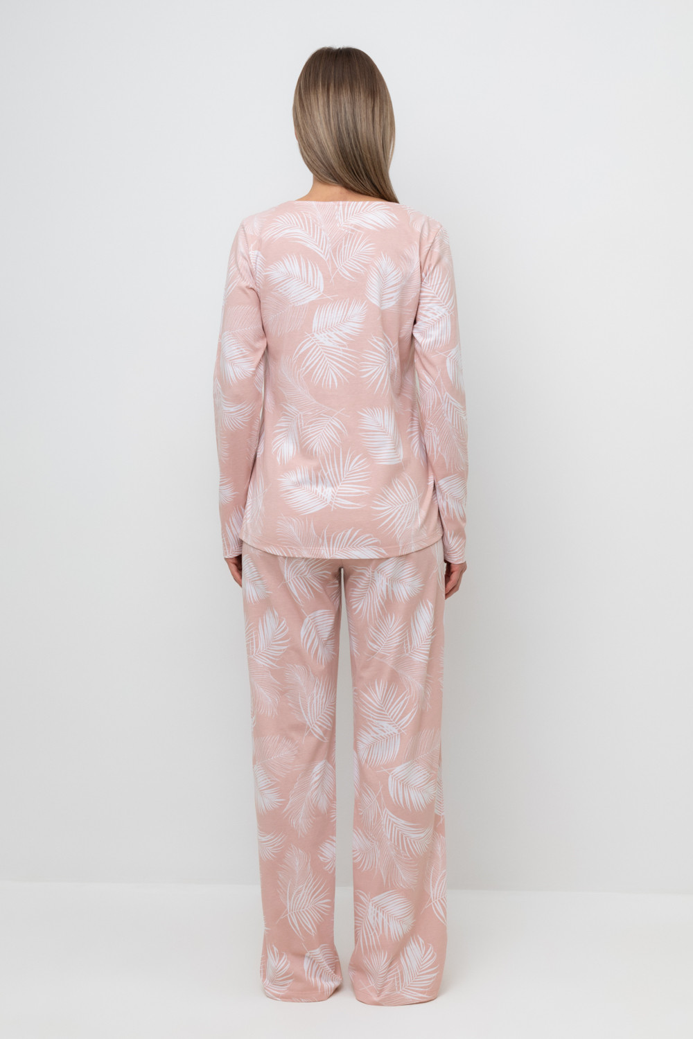 Легкий комплект для комфортного сна и отдыха набивного трикотажа с нежным рисунком из 100% натурального хлопка. Джемпер с V-образным вырезом, украшенный эластичным кружевом комфортно садится по фигуре.  Брюки с поясом на резинке и атласной лентой. Гладкий материал приятен к телу и позволяет коже дышать.