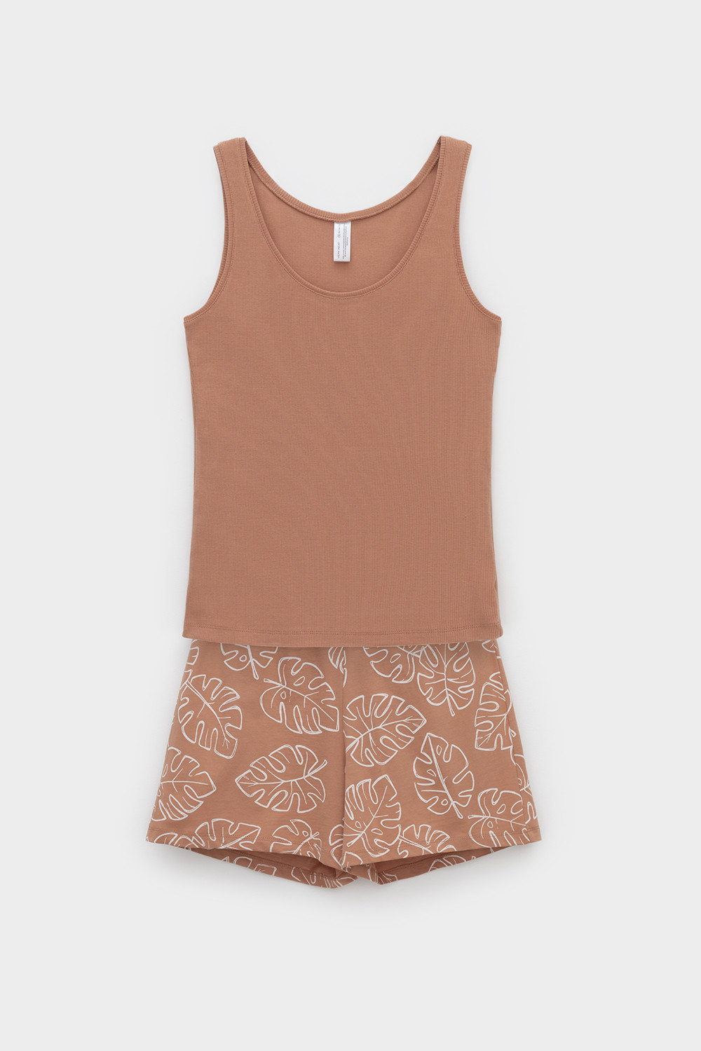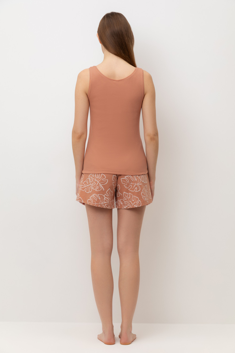 Комплект для комфортного сна из трикотажного полотна.  Майка из эластичного трикотажа с добавлением лайкры в рубчик. Шорты с мягким поясом на резинке удобно садятся по фигуре. Гладкий материал приятен к телу, не теряет форму и позволяет коже дышать.