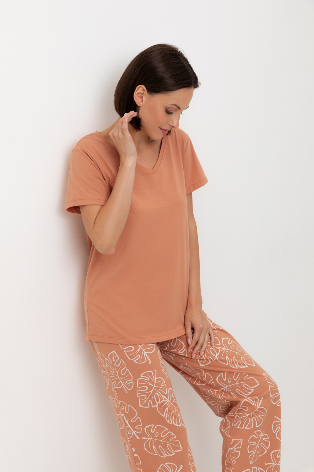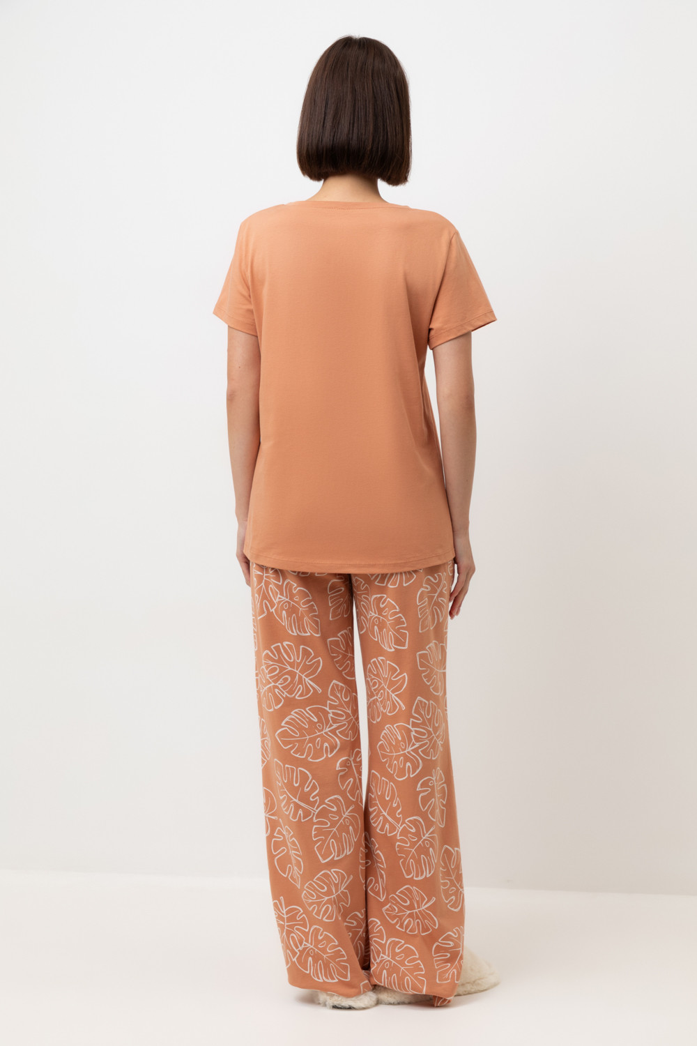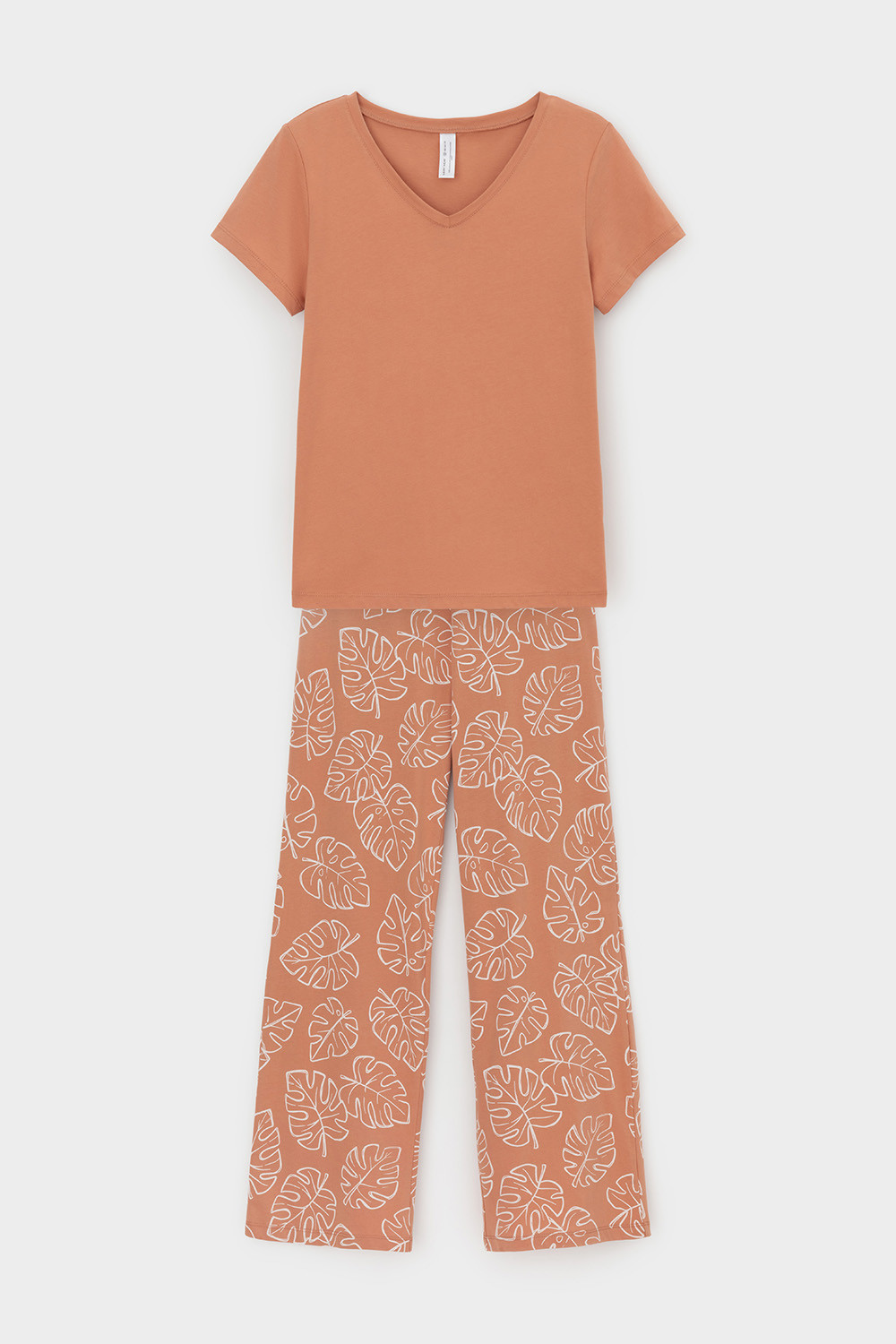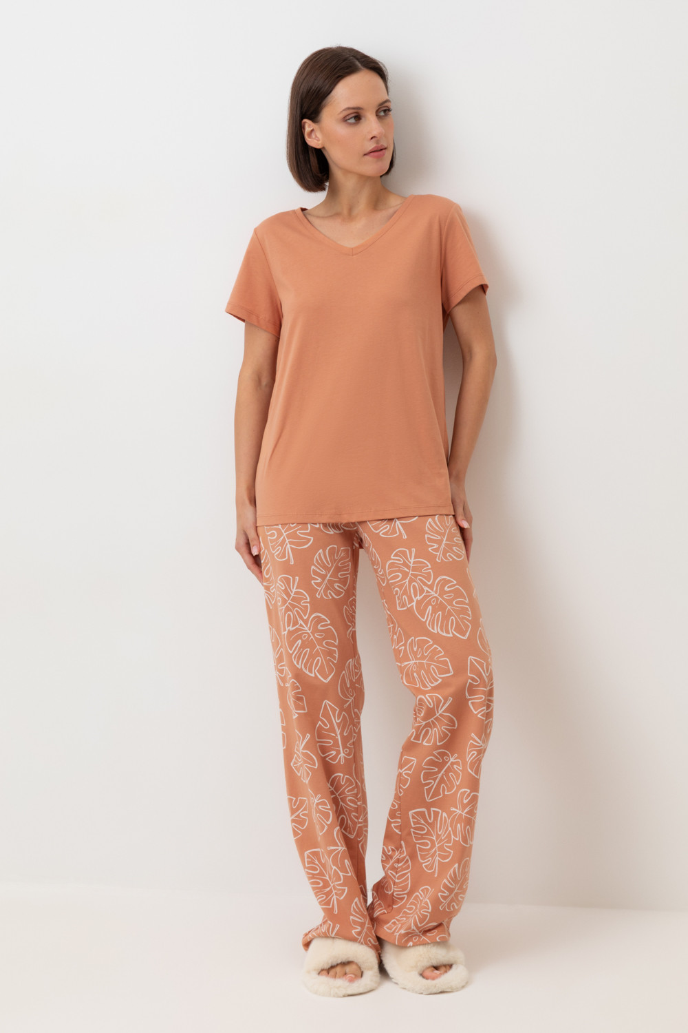 Легкий комплект для комфортного сна и отдыха из натурального хлопка. Футболка с V-образным вырезом комфортно садится по фигуре.  Брюки с поясом на резинке выполнены из набивного трикотажа. Гладкий материал приятен к телу и позволяет коже дышать.