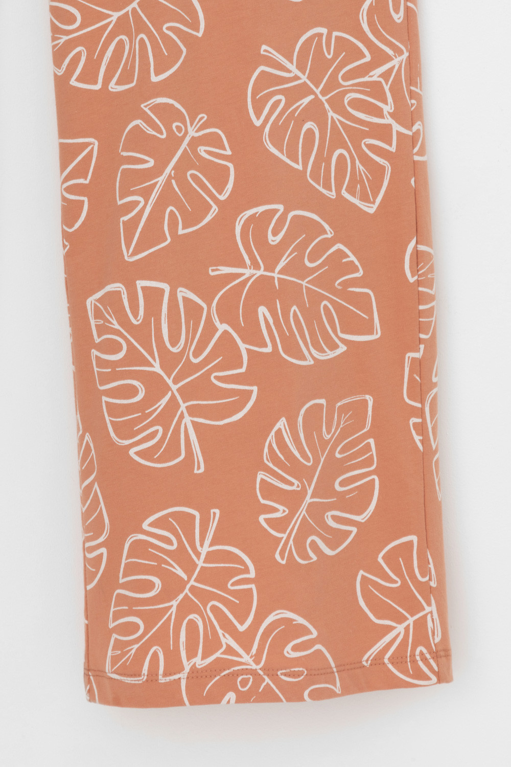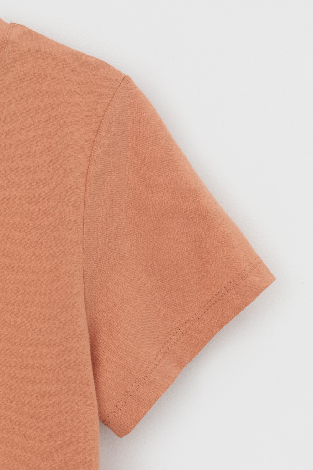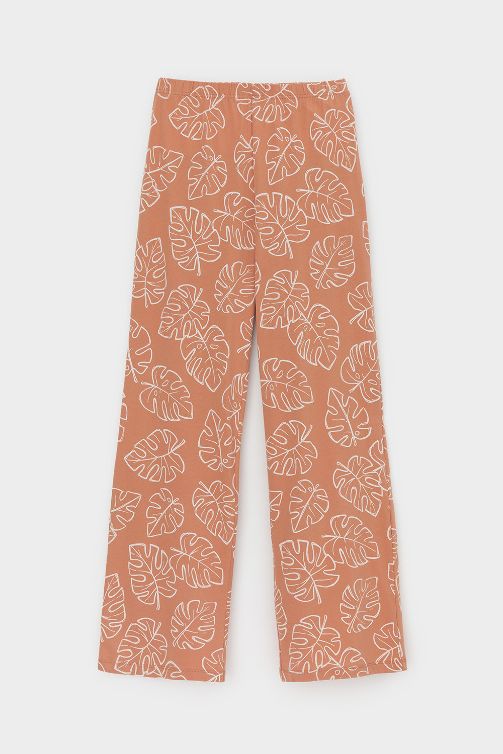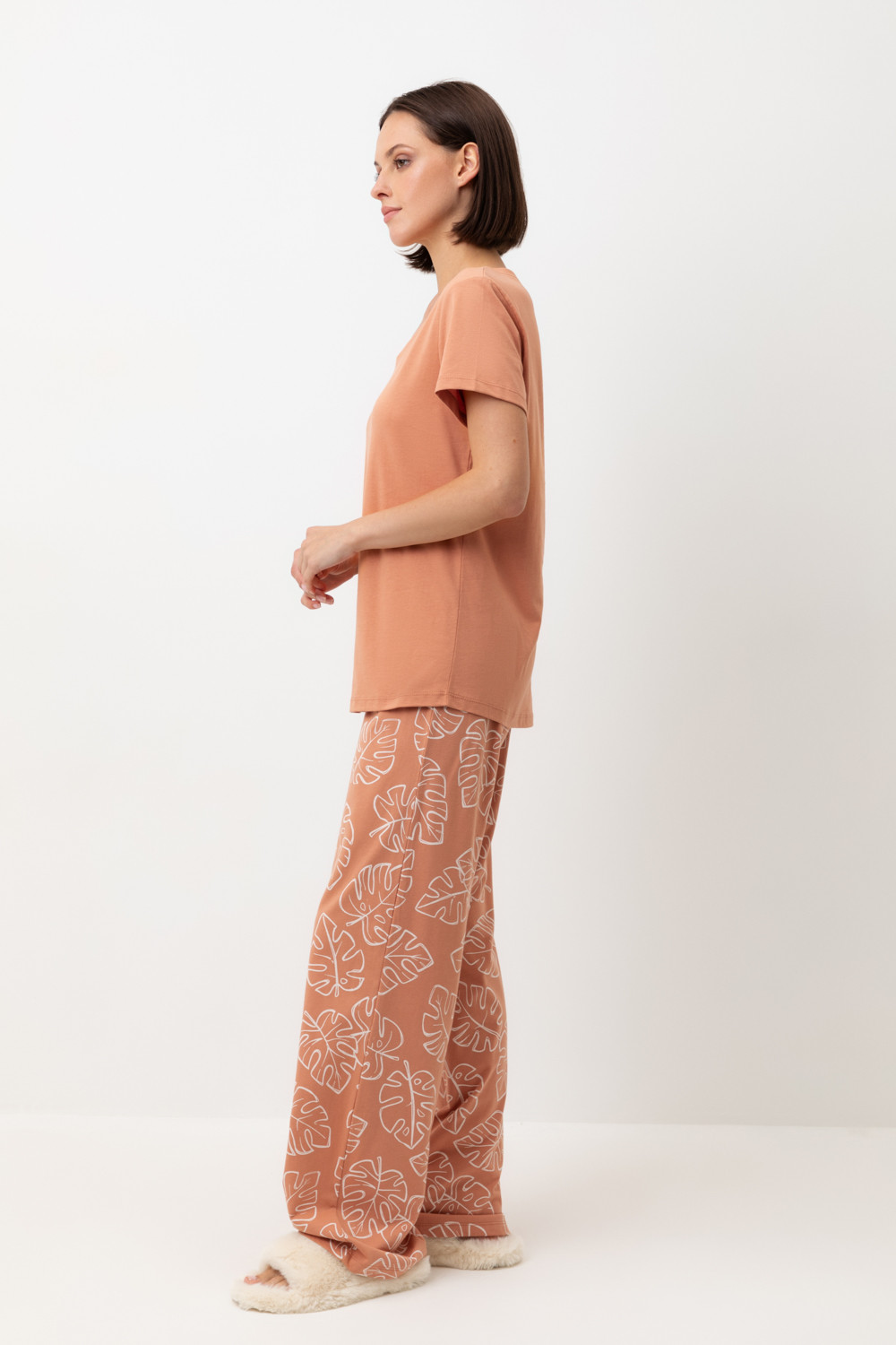Легкий комплект для комфортного сна и отдыха из натурального хлопка. Футболка с V-образным вырезом комфортно садится по фигуре.  Брюки с поясом на резинке выполнены из набивного трикотажа. Гладкий материал приятен к телу и позволяет коже дышать.