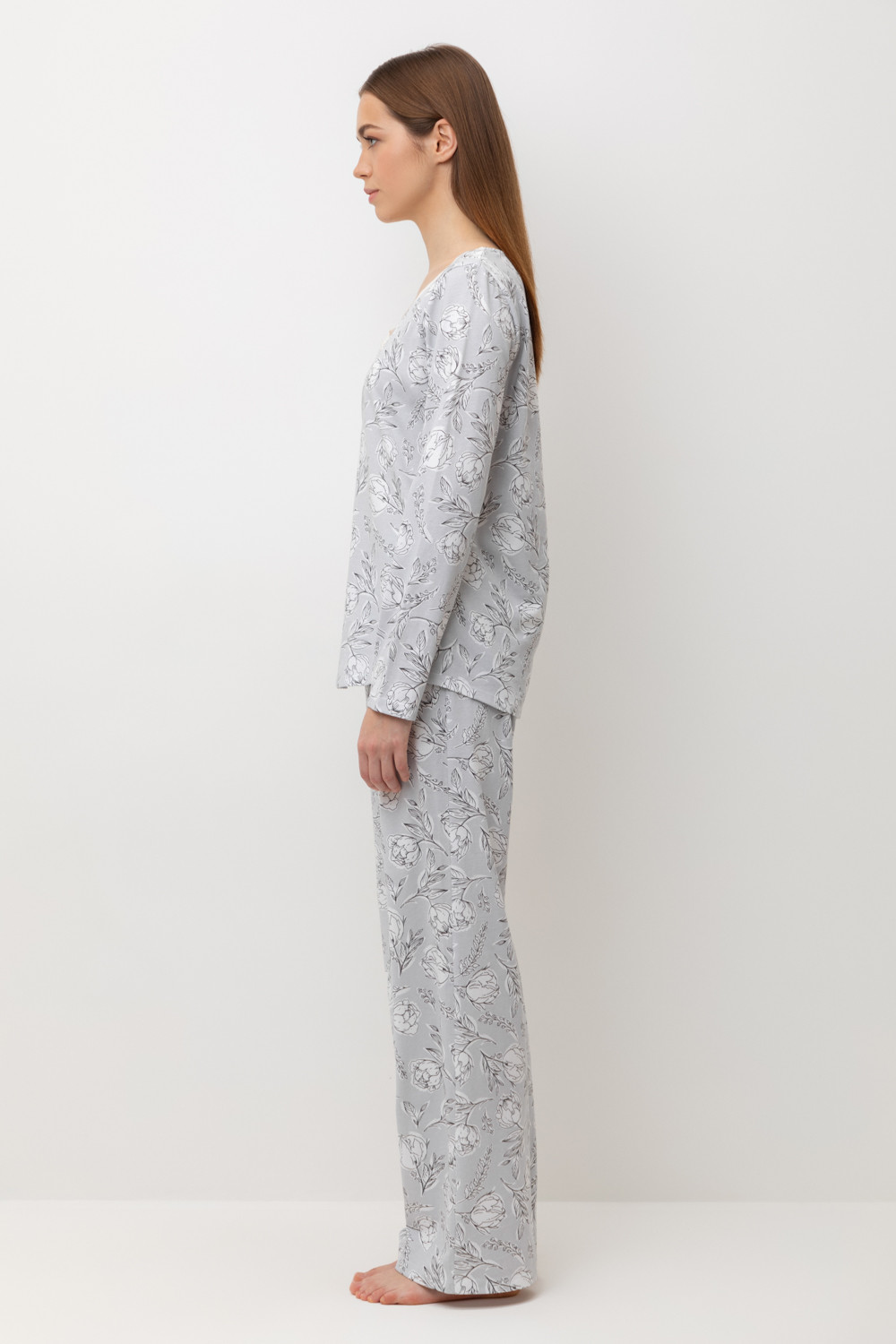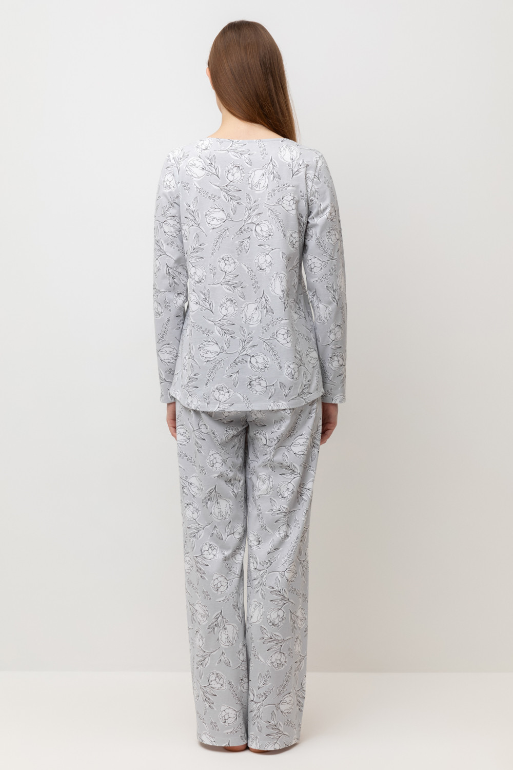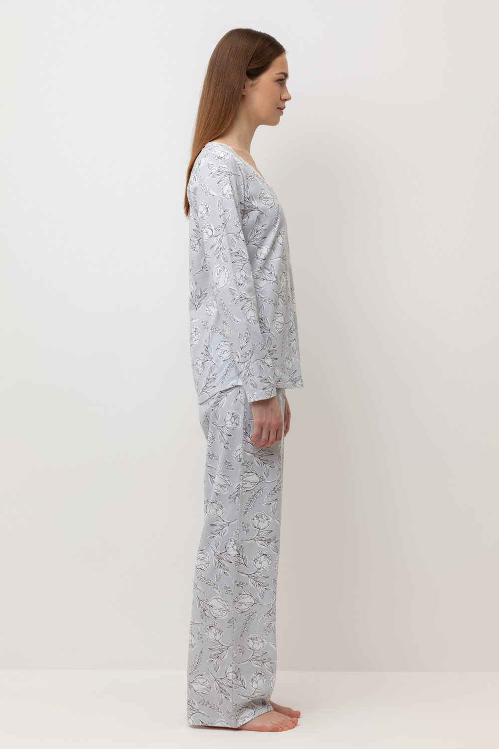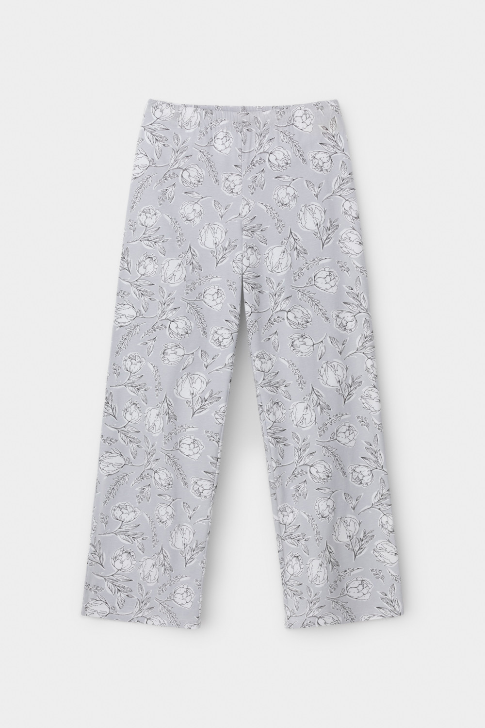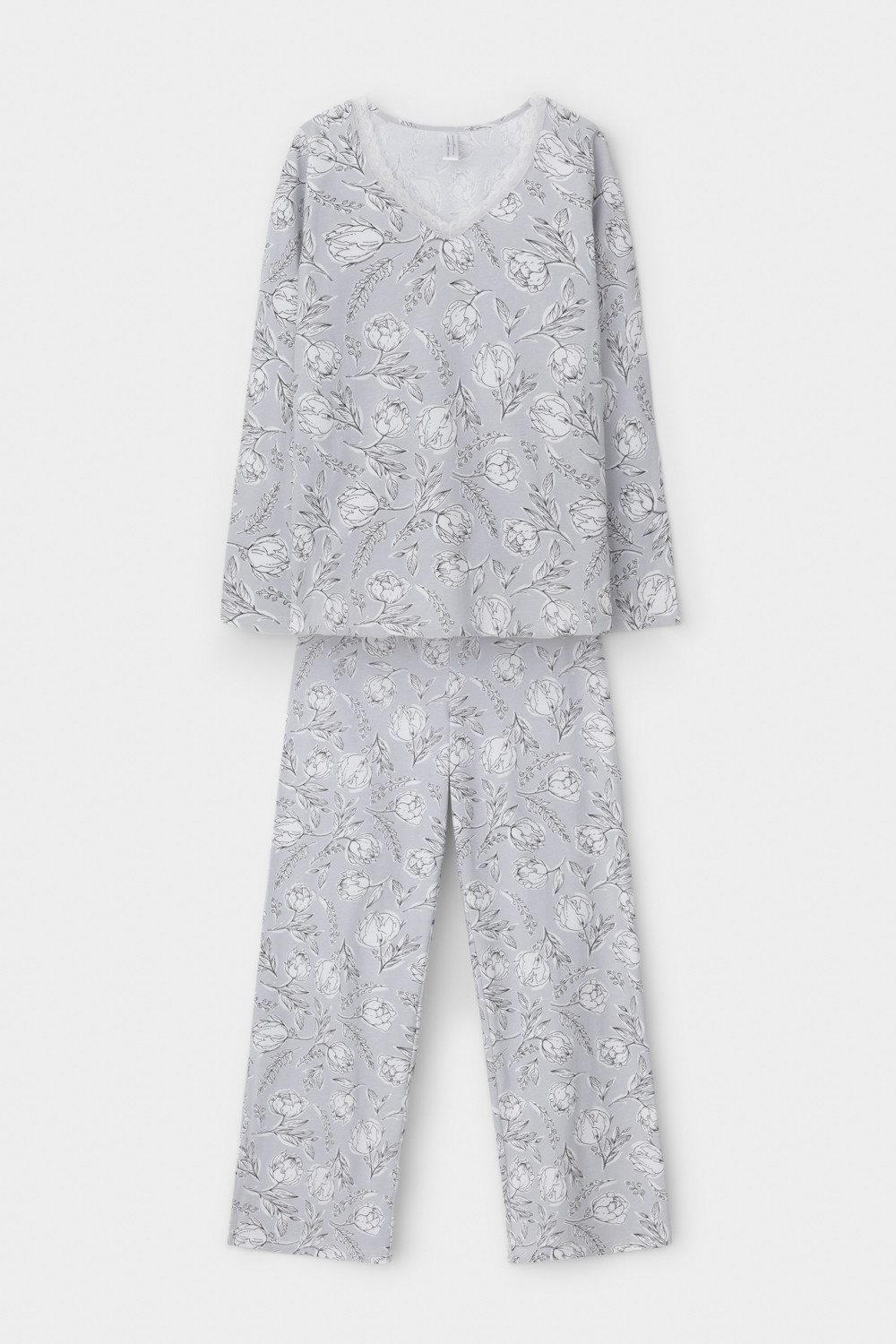 Легкий комплект для комфортного сна и отдыха набивного трикотажа с нежным рисунком из 100% натурального хлопка. Джемпер с V-образным вырезом, украшенный эластичным кружевом комфортно садится по фигуре.  Брюки с поясом на резинке и атласной лентой. Гладкий материал приятен к телу и позволяет коже дышать.
