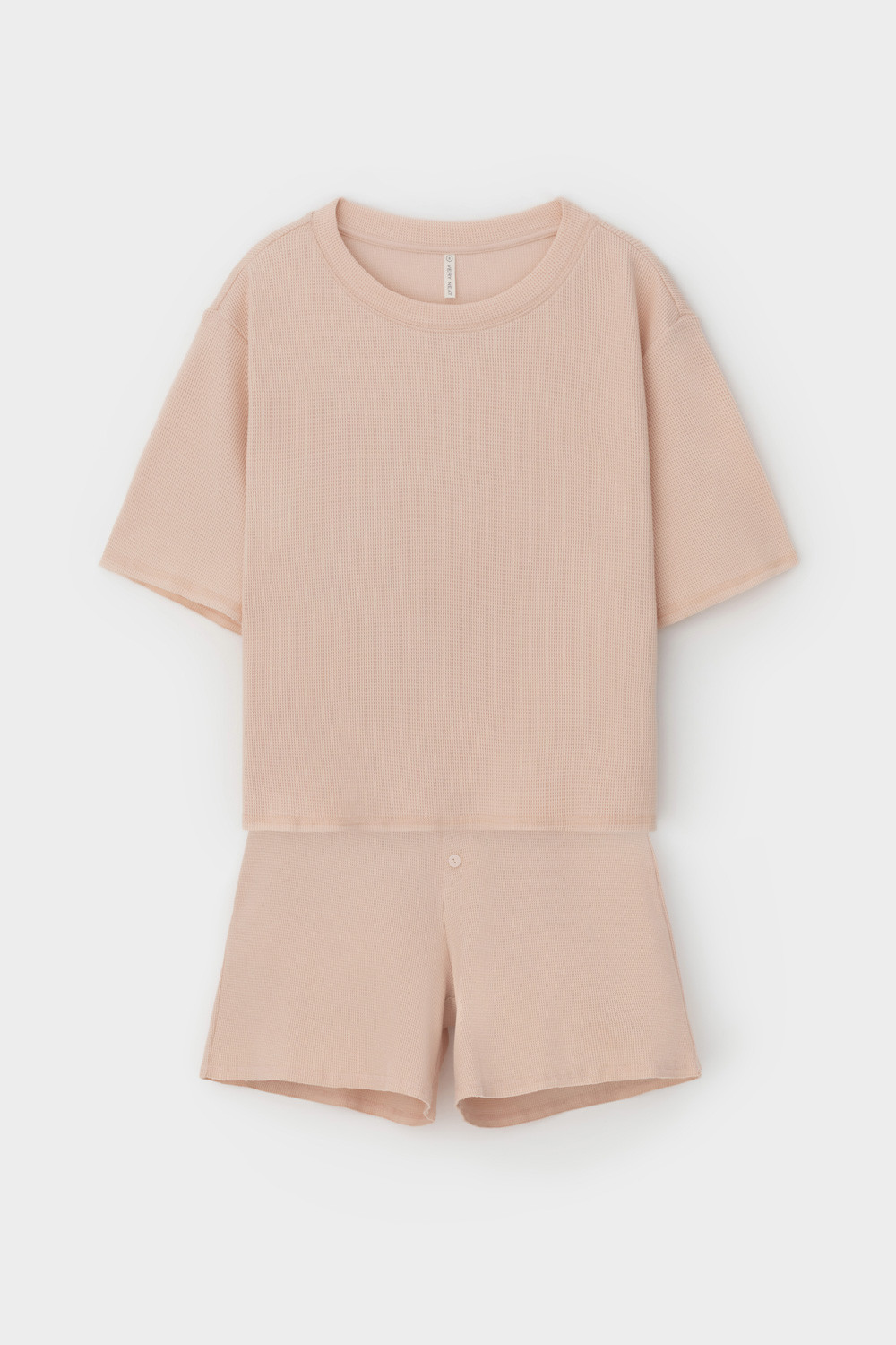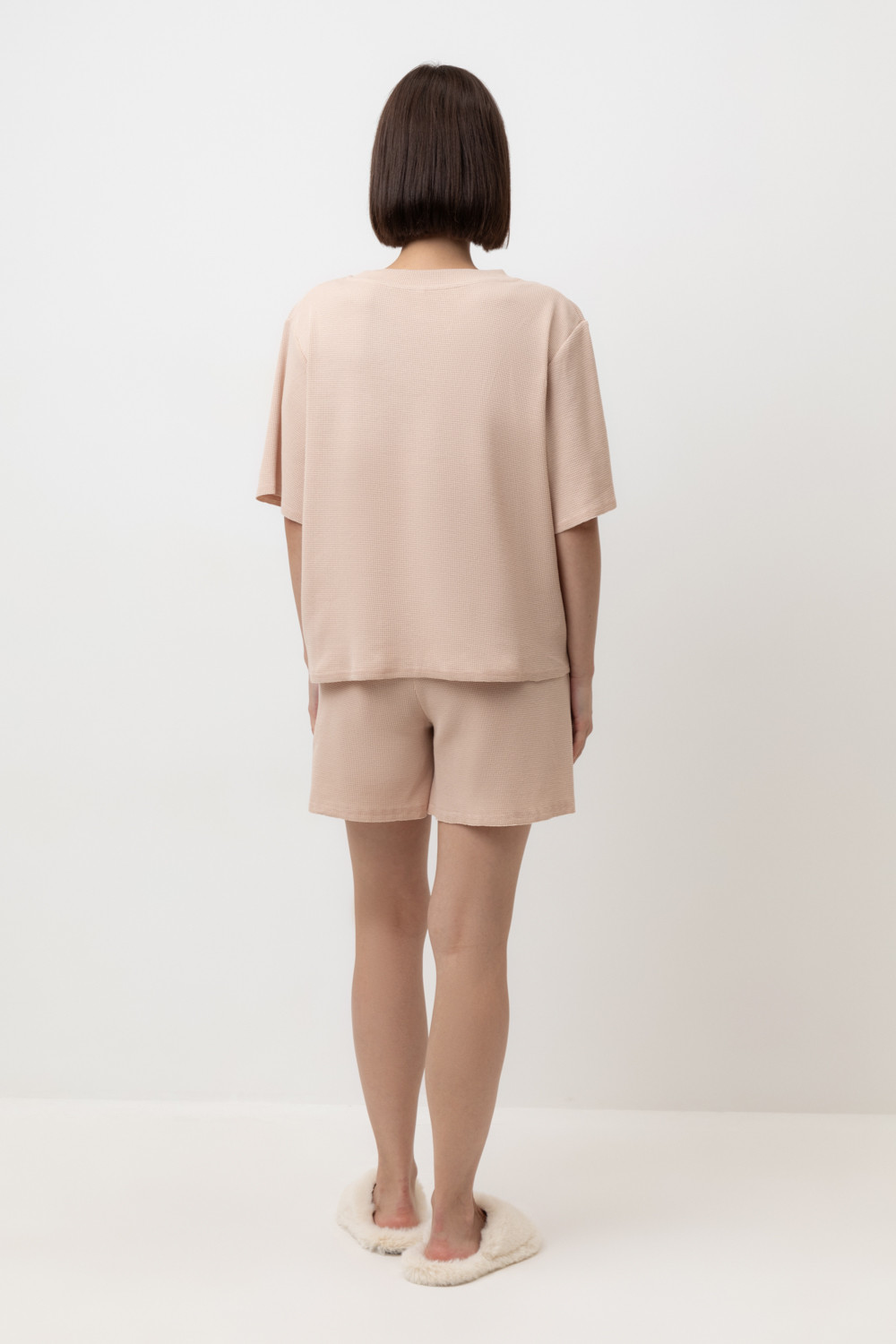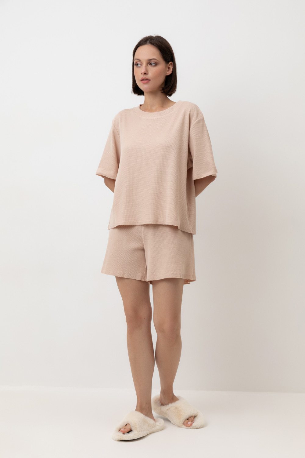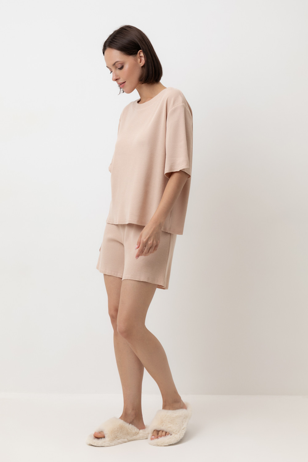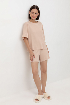 Комплект из объемного трикотажа с добавлением эластичных волокон. Свободный силуэт и мягкий пояс  обеспечат комфорт во время сна и отдыха.
