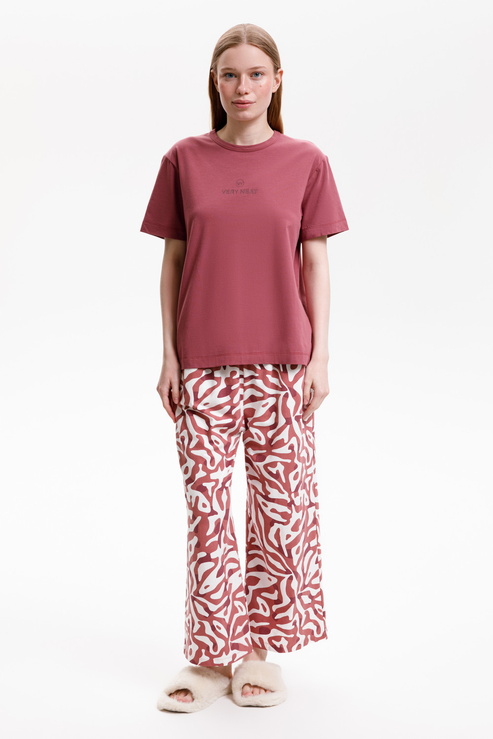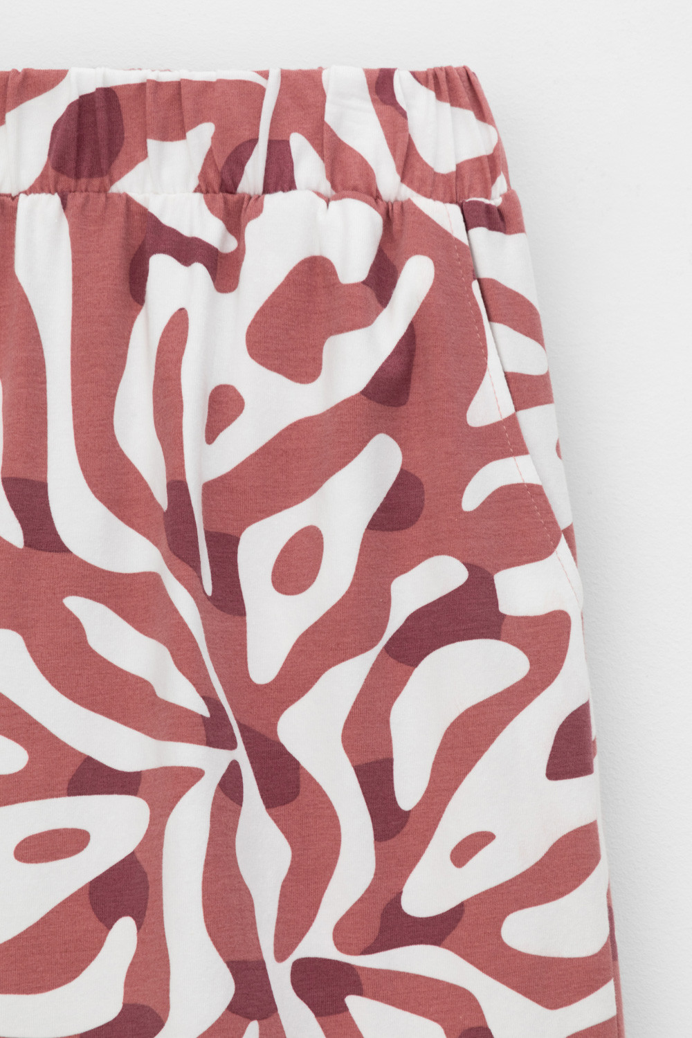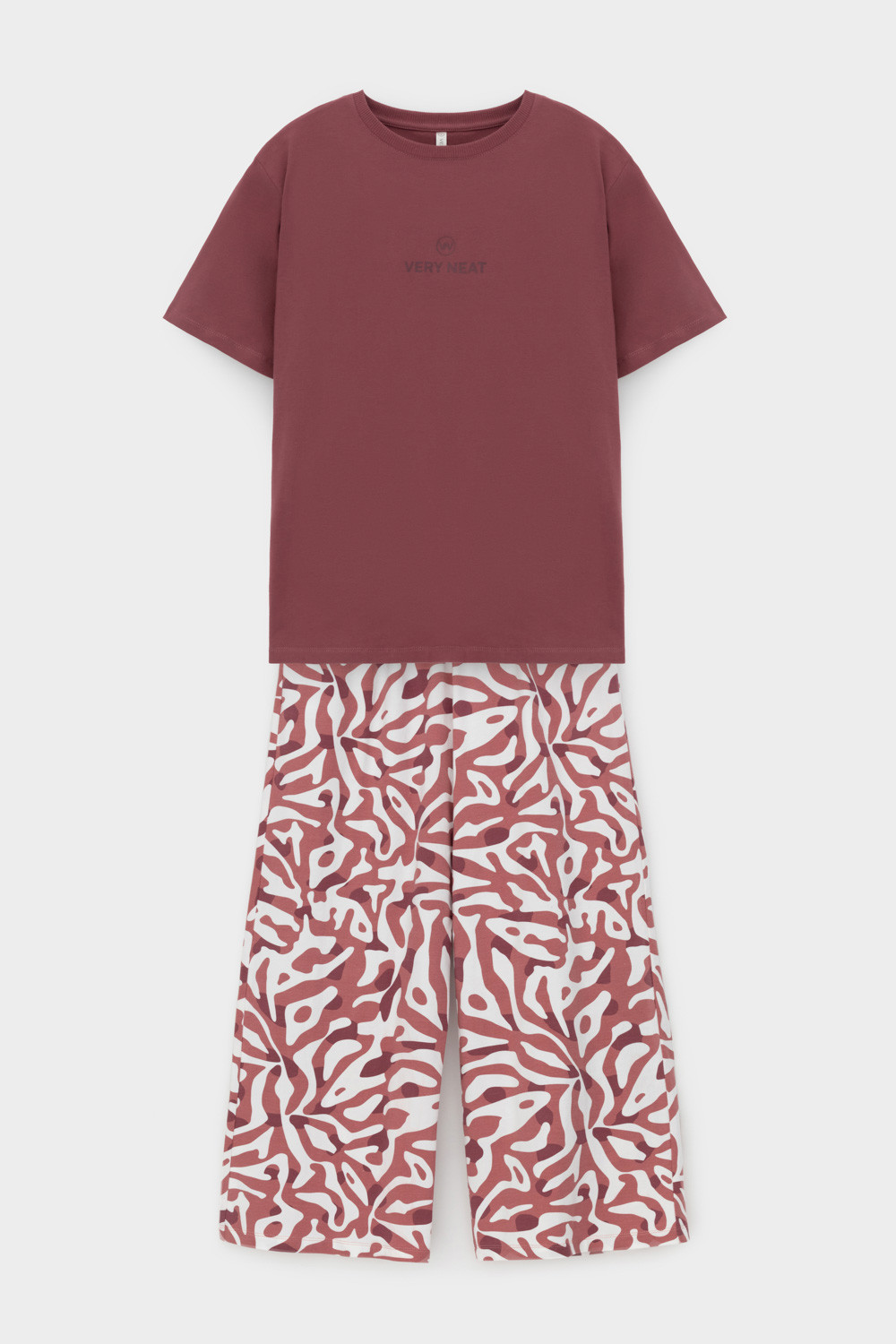 Комплект из высококачественного гребенного хлопка. Мягкий на ощупь принт на футболке выполнен на основе  водных красок, что обеспечивает устойчивость к многократным стиркам.  Комплект дополняют укороченные брюки с удобным поясом на резинке и практичными карманами.