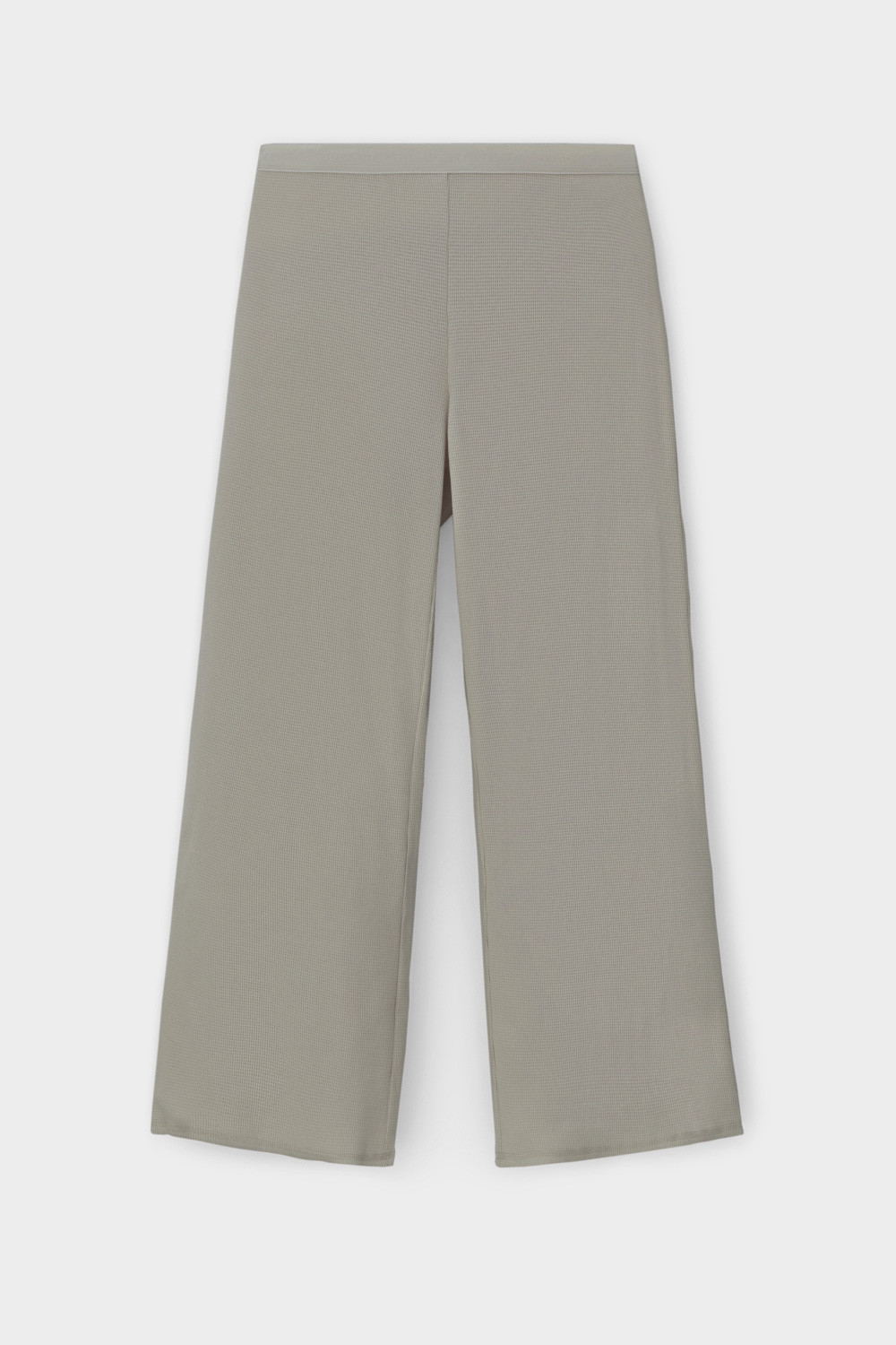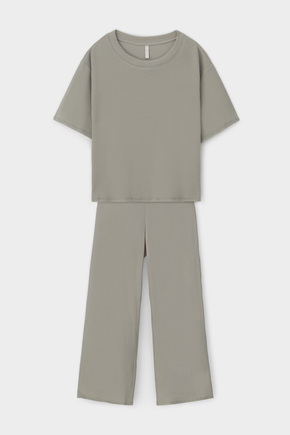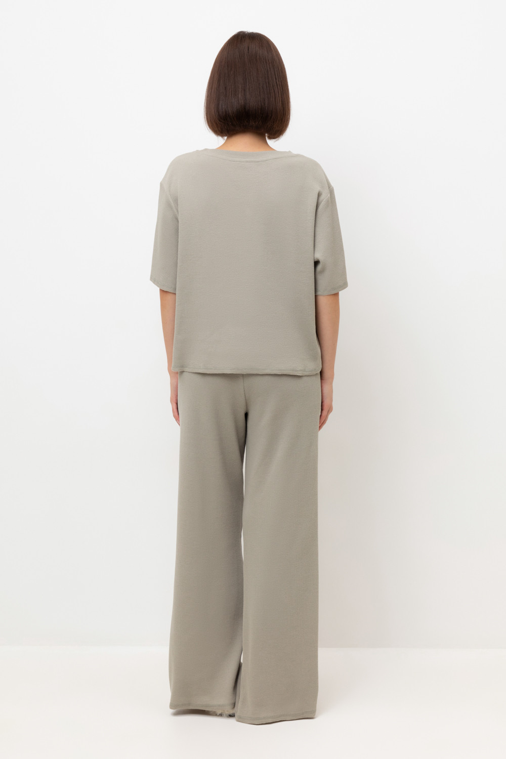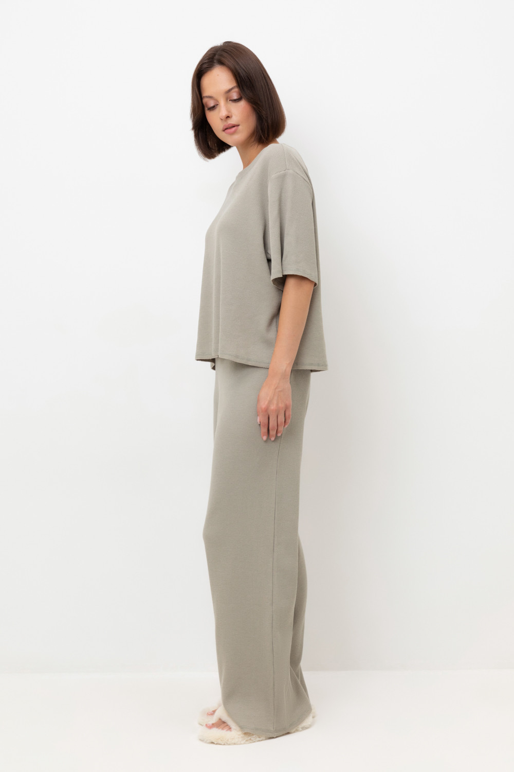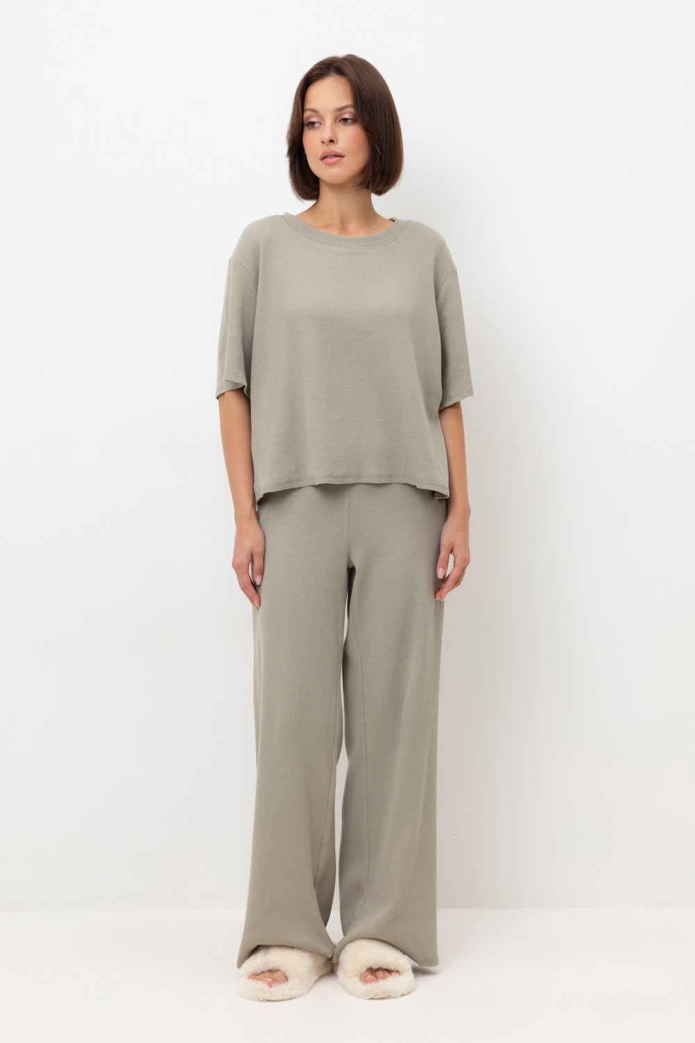 Комплект из объемного трикотажа с добавлением эластичных волокон. Свободный силуэт, мягкий пояс и отсутствие боковых швов на брюках обеспечат комфорт во время сна и отдыха.