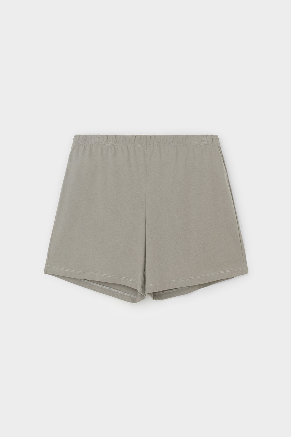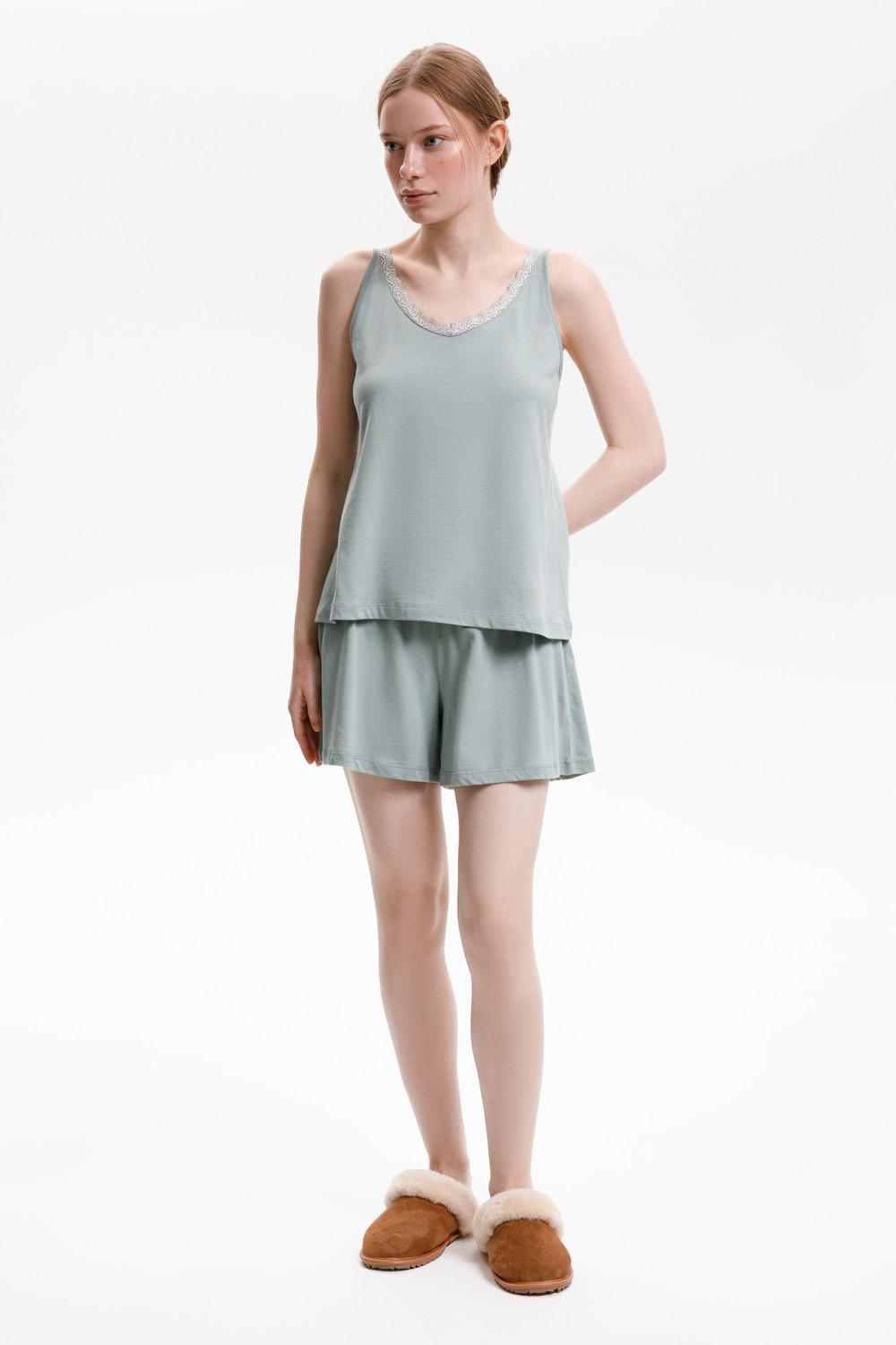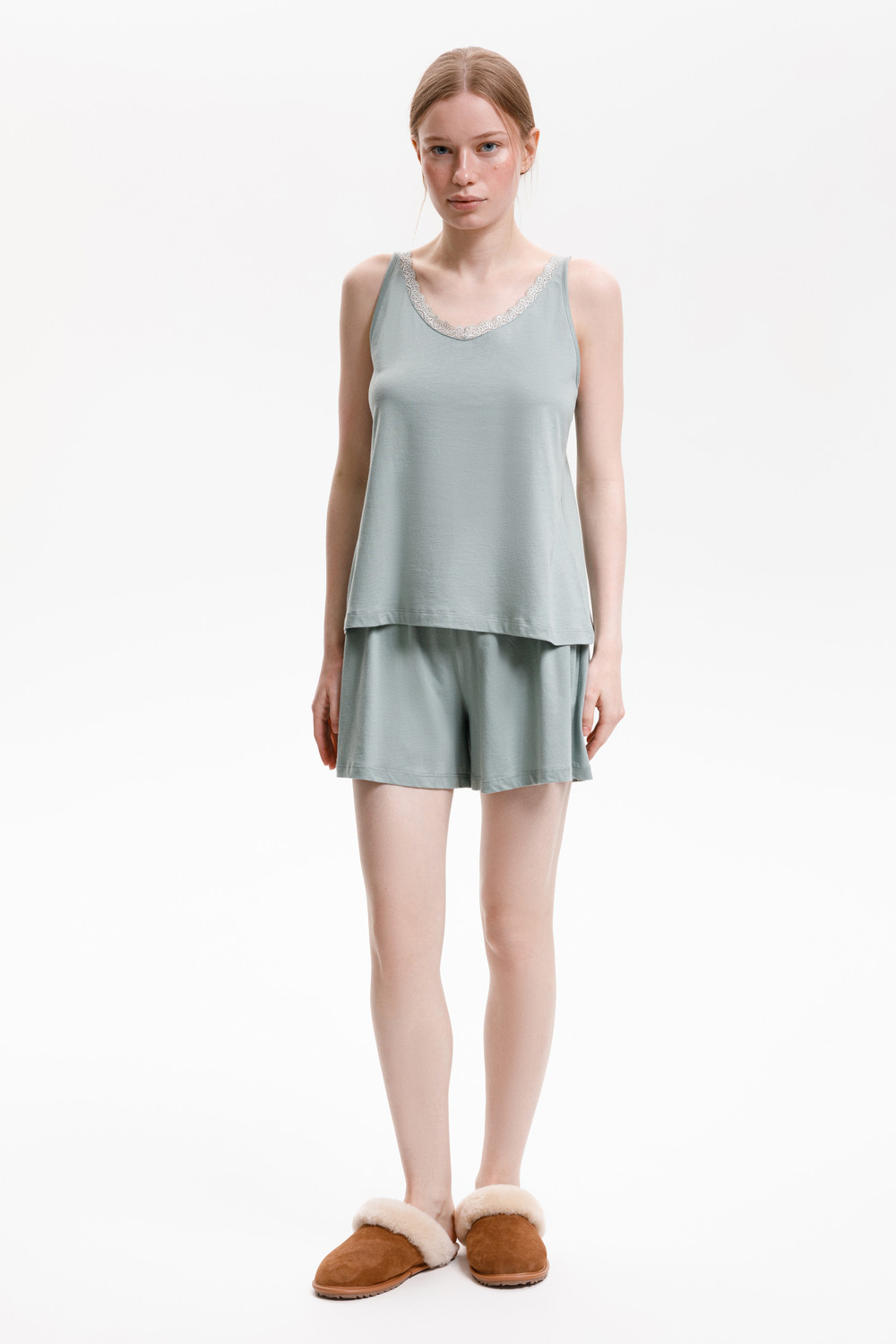 Легкий комплект приглушенного зеленого оттенка выполнен из хлопка с нежнейшим модалом. Свободный крой топа декорированный эластичным кружевом и мягкий пояс шорт обеспечивают легкость и свободу движений.