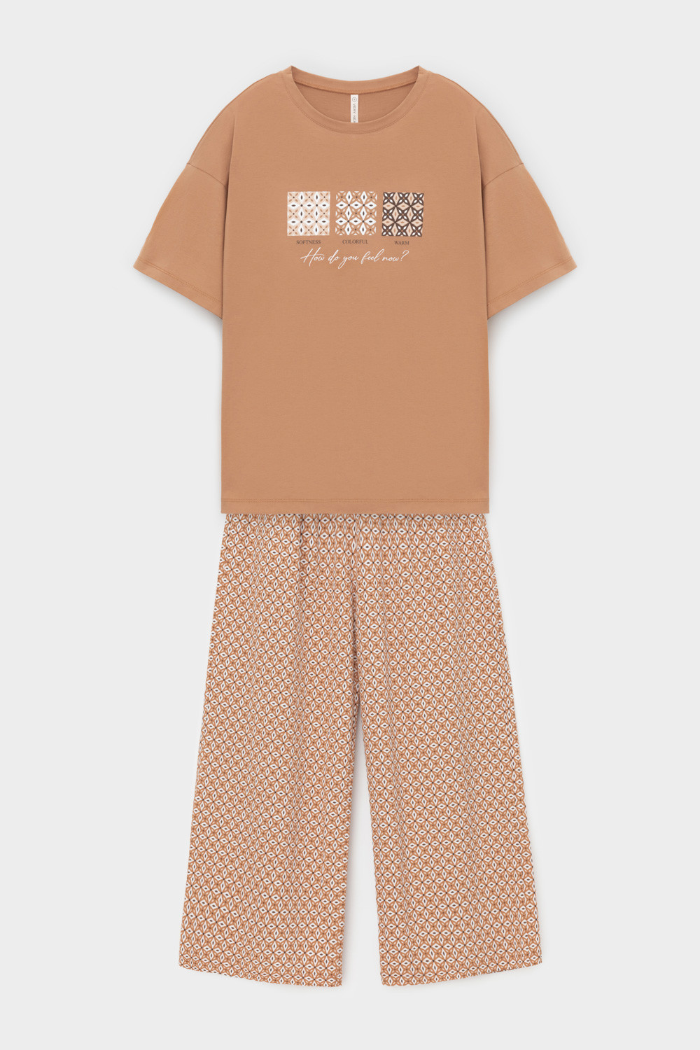 Комплект из высококачественного гребенного хлопка. Мягкий на ощупь принт на футболке выполнен на основе водных красок, что обеспечивает устойчивость к многократным стиркам. Брюки с удобным поясом на резинке и практичными карманами добавляют практичности и удобства.