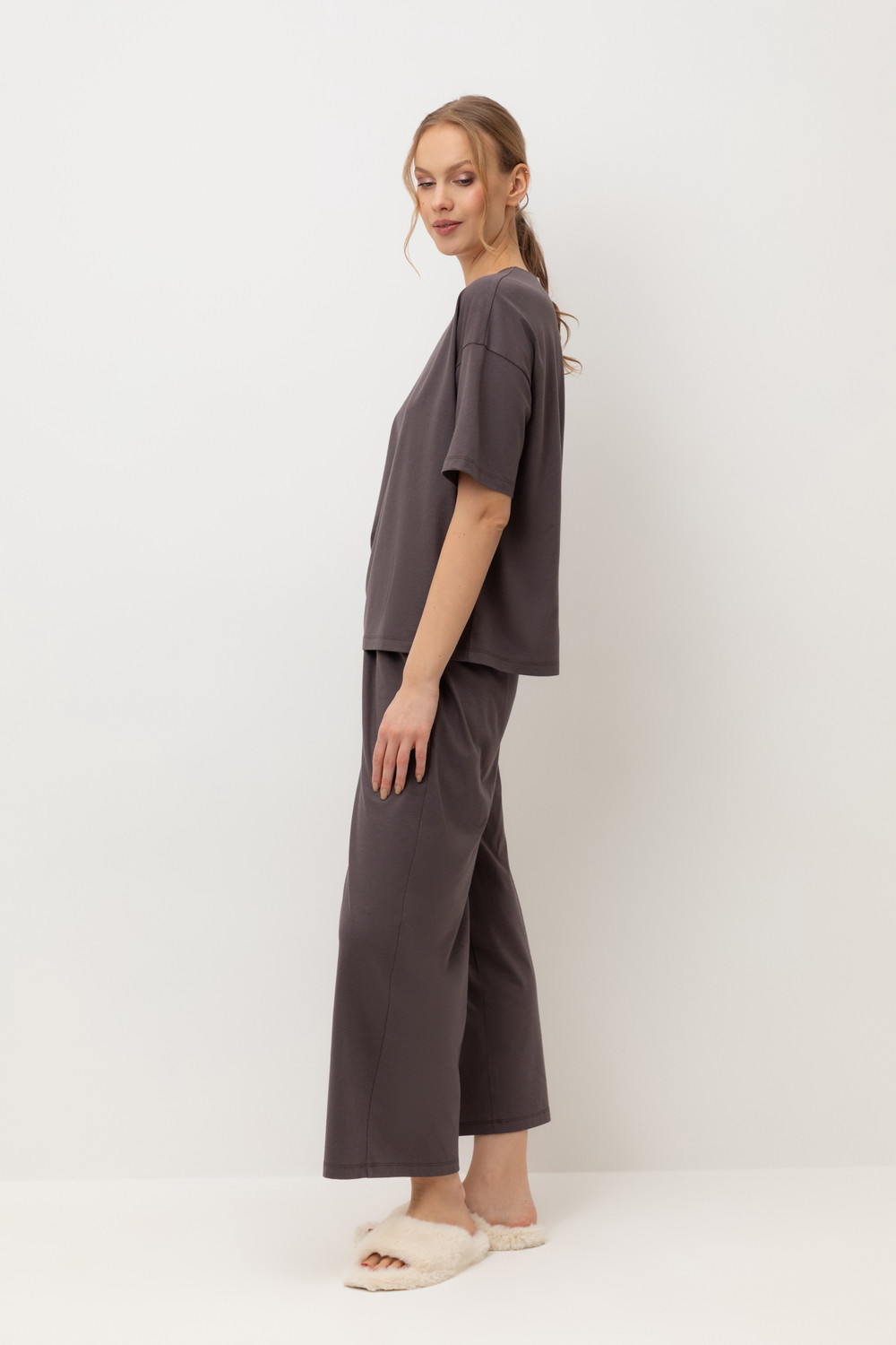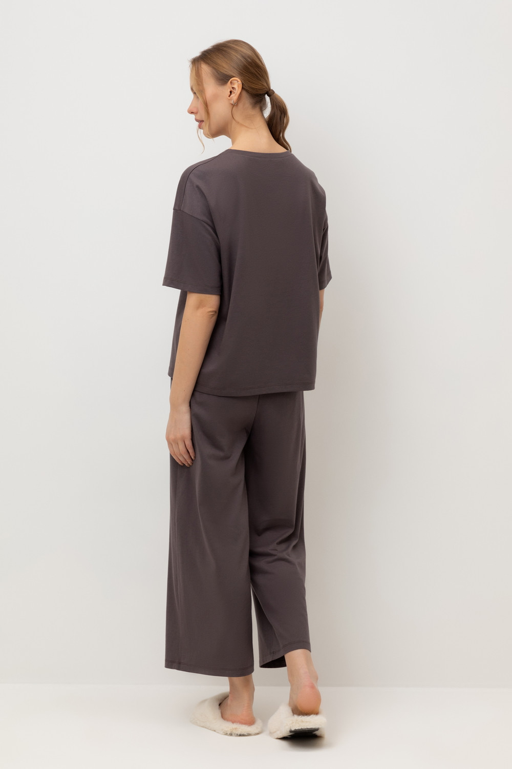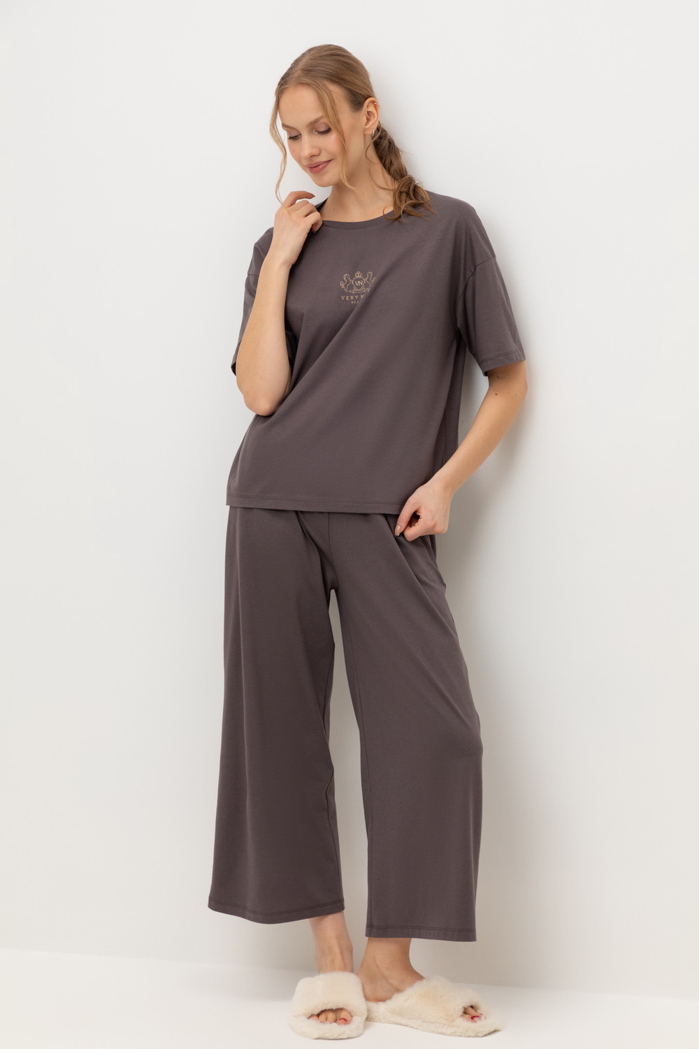 Комплект приглушенного оттенка выполнен из хлопка с нежнейшим модалом. Свободный крой футболки и мягкий пояс брюк обеспечивают легкость и свободу движений.
