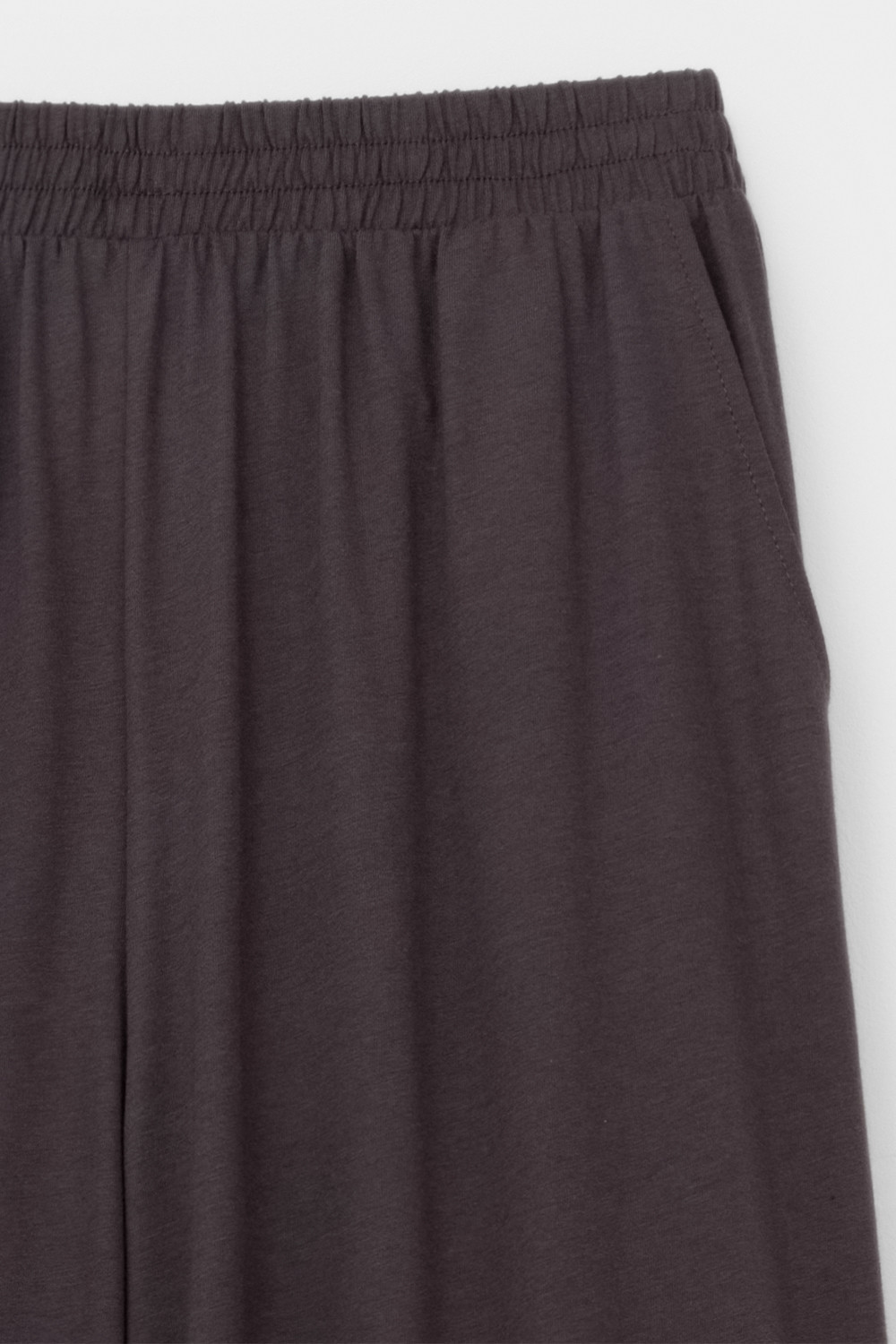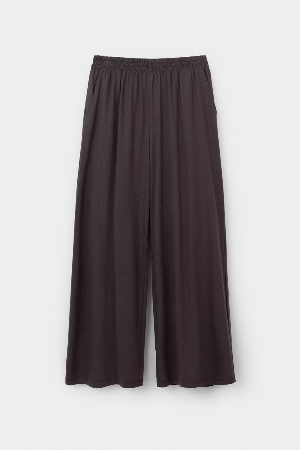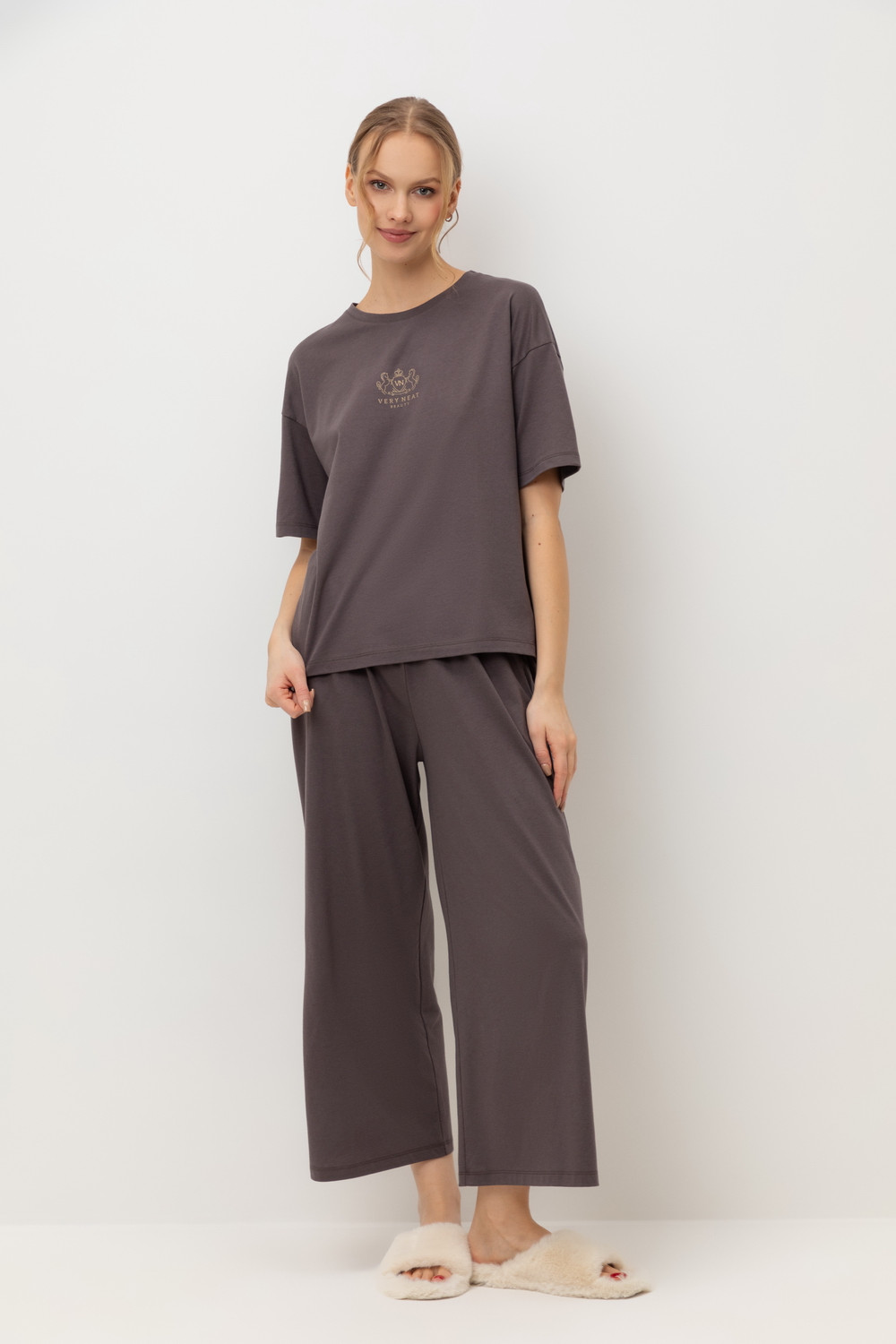 Комплект приглушенного оттенка выполнен из хлопка с нежнейшим модалом. Свободный крой футболки и мягкий пояс брюк обеспечивают легкость и свободу движений.