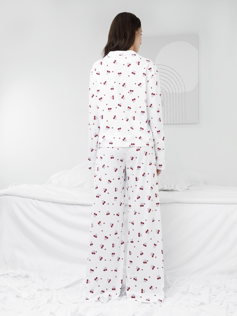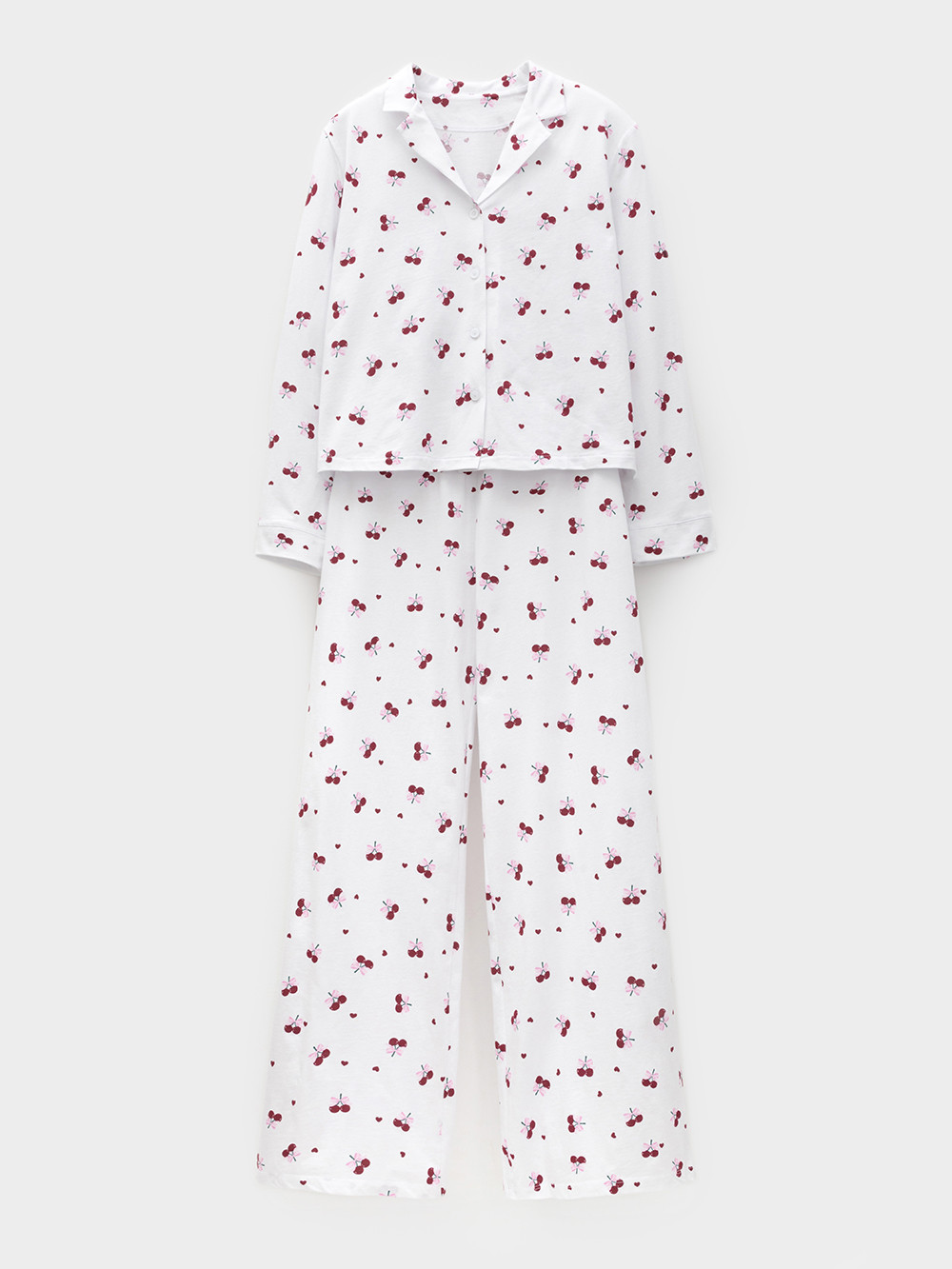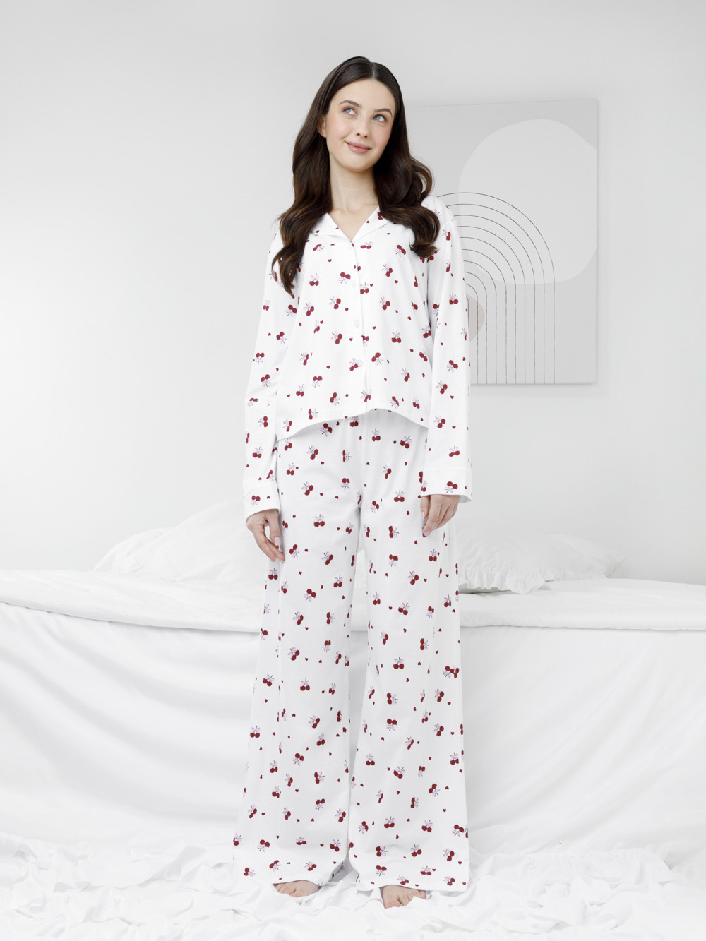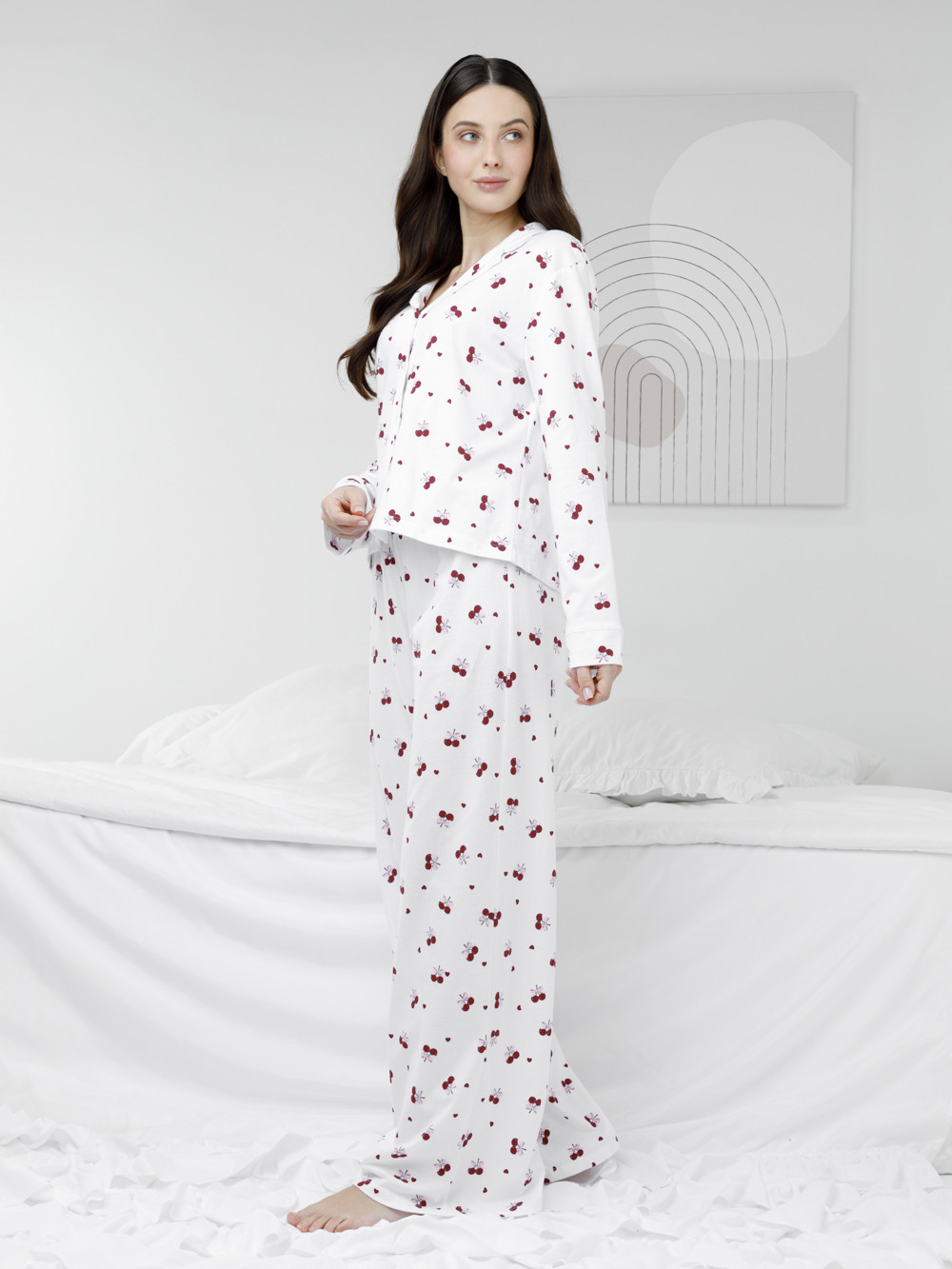 Трикотажная пижама из натурального хлопка для комфортного сна и отдыха. Рубашка на пуговицах с длинными рукавами и широкие брюки с мягкой эластичной резинкой в поясе. Гладкий материал приятен к телу, не теряет форму и позволяет коже дышать. Набивной рисунок выполнен из стойких текстильных гипоаллергенных красителей. Все трикотажные полотна производятся в соответствии с нормами швейцарского сертификата ЭкоТекс.