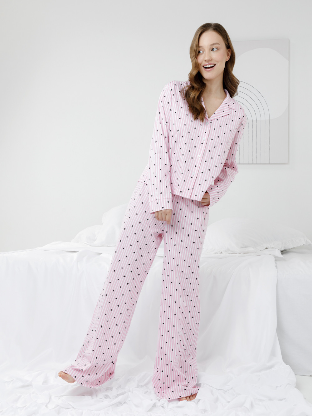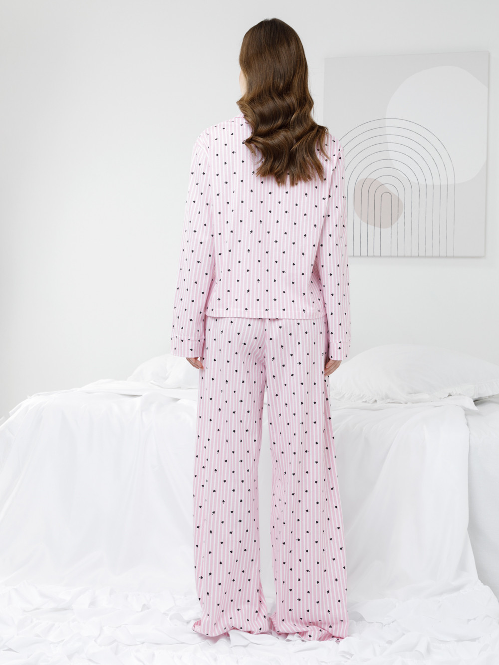 Трикотажная пижама из натурального хлопка для комфортного сна и отдыха. Рубашка на пуговицах с длинными рукавами и широкие брюки с мягкой эластичной резинкой в поясе. Гладкий материал приятен к телу, не теряет форму и позволяет коже дышать. Набивной рисунок выполнен из стойких текстильных гипоаллергенных красителей. Все трикотажные полотна производятся в соответствии с нормами швейцарского сертификата ЭкоТекс.