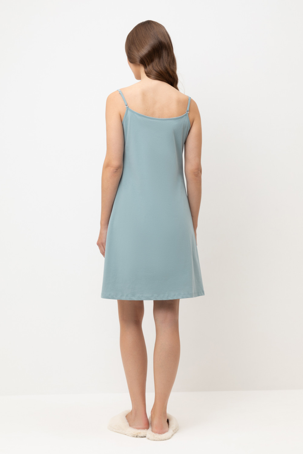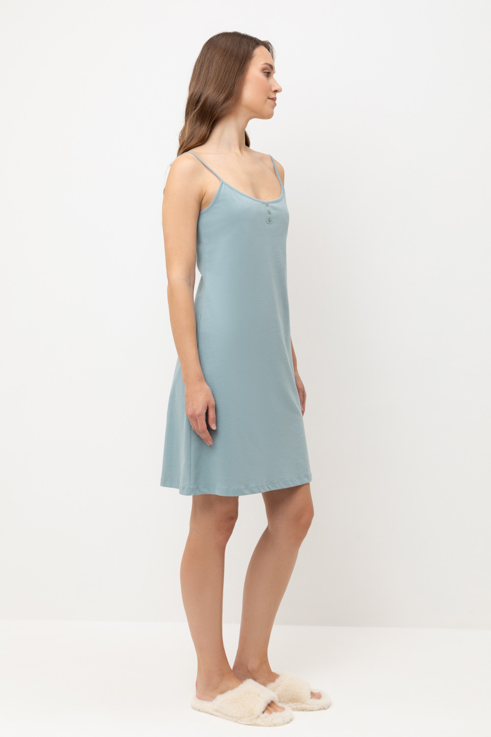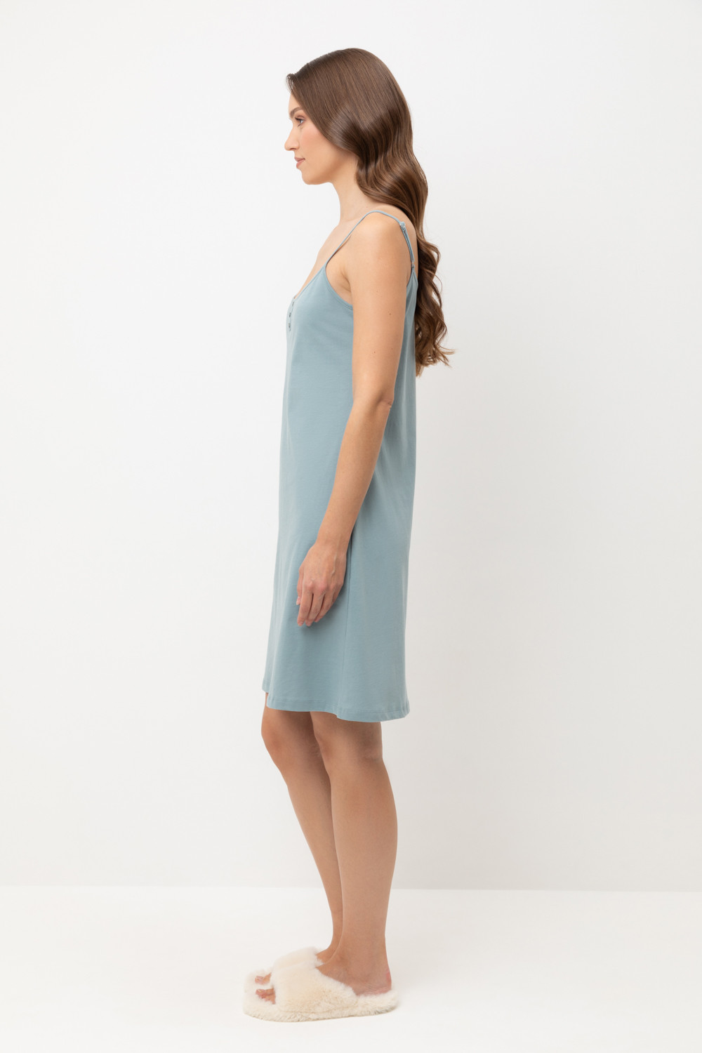 Элегантная женская сорочка с регулируемыми бретелями для комфортного сна. На груди декоративные пуговицы. Гладкий материал приятен к телу и позволяет коже дышать.