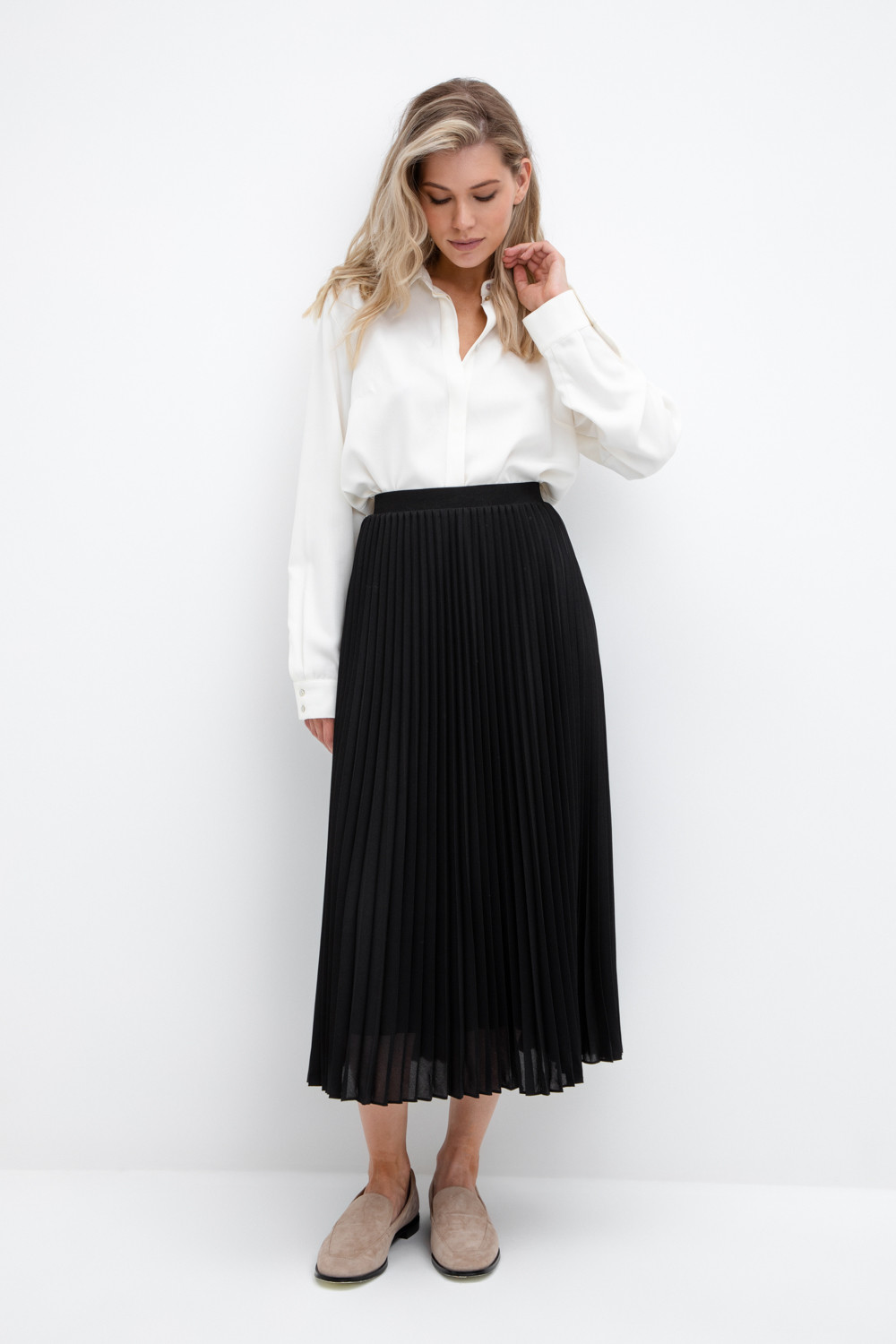 Силуэтная юбка плиссе с подкладом. Пояс на резинке обеспечивает комфортную посадку. Изделие сохраняет цвет и форму после многократных стирок.