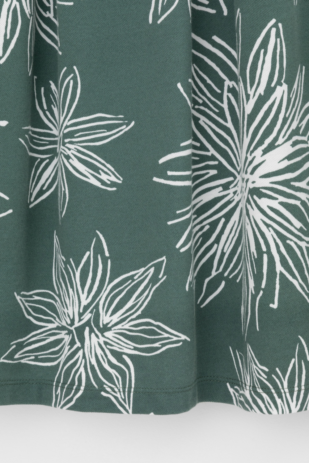 Струящаяся юбка из 100% хлопка пике с небольшой рельефной текстурой дарит ощущение комфорта и легкости. Крупные астры придают изделию летнее настроение.