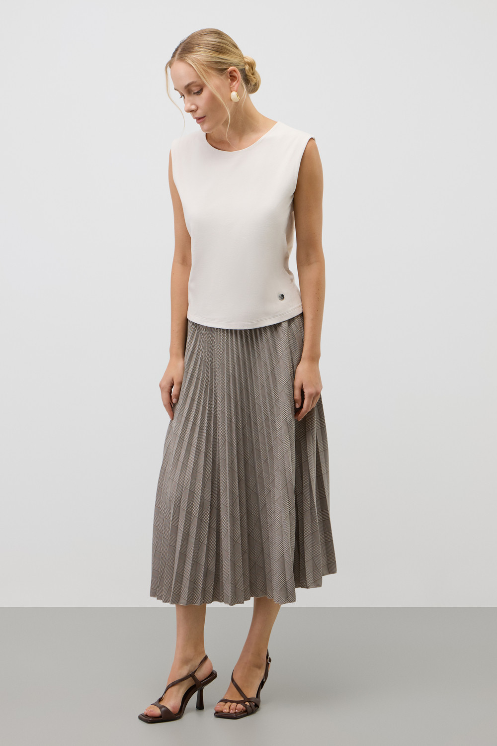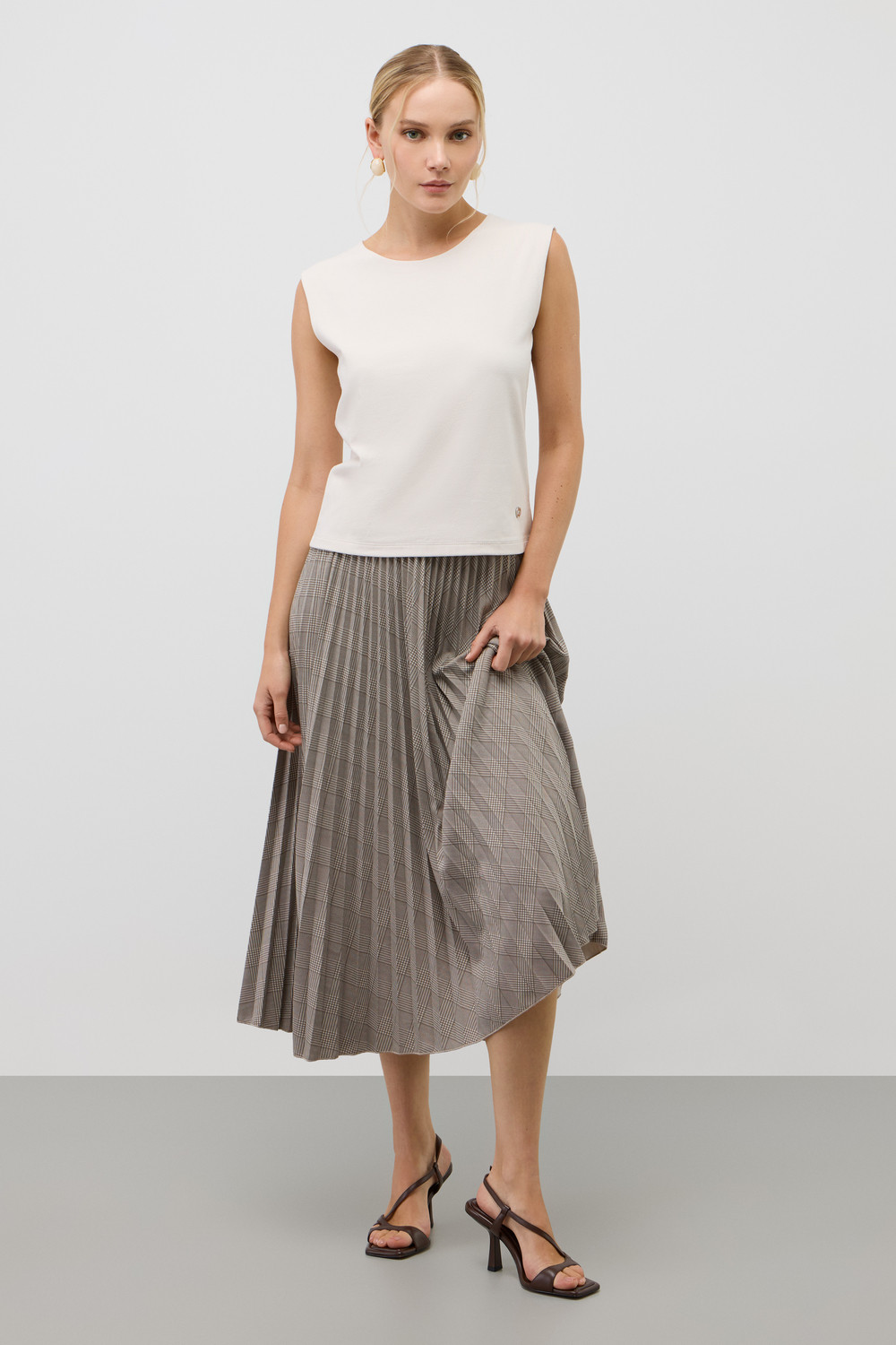Юбка гофре, выполненная из высококачественного трикотажного полотна DOUBLE FACE, отличается особой легкостью и шелковистой текстурой благодаря силиконовой обработке ткани. Она элегантно струится, создавая ощущение легкости и воздушности. Мелкие складки визуально удлиняют силуэт, подчеркивая женственность.