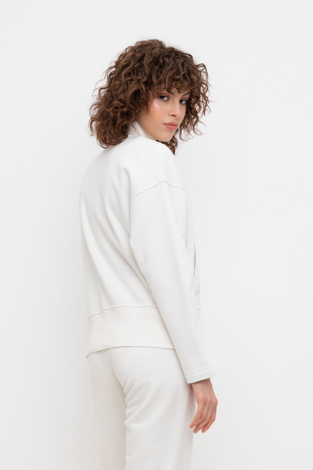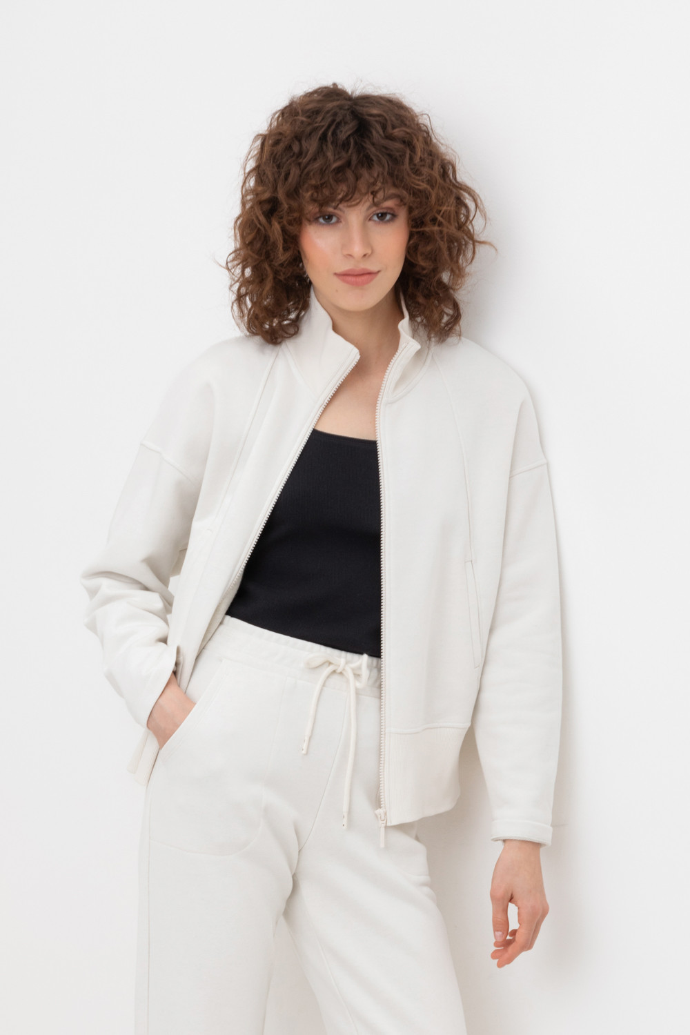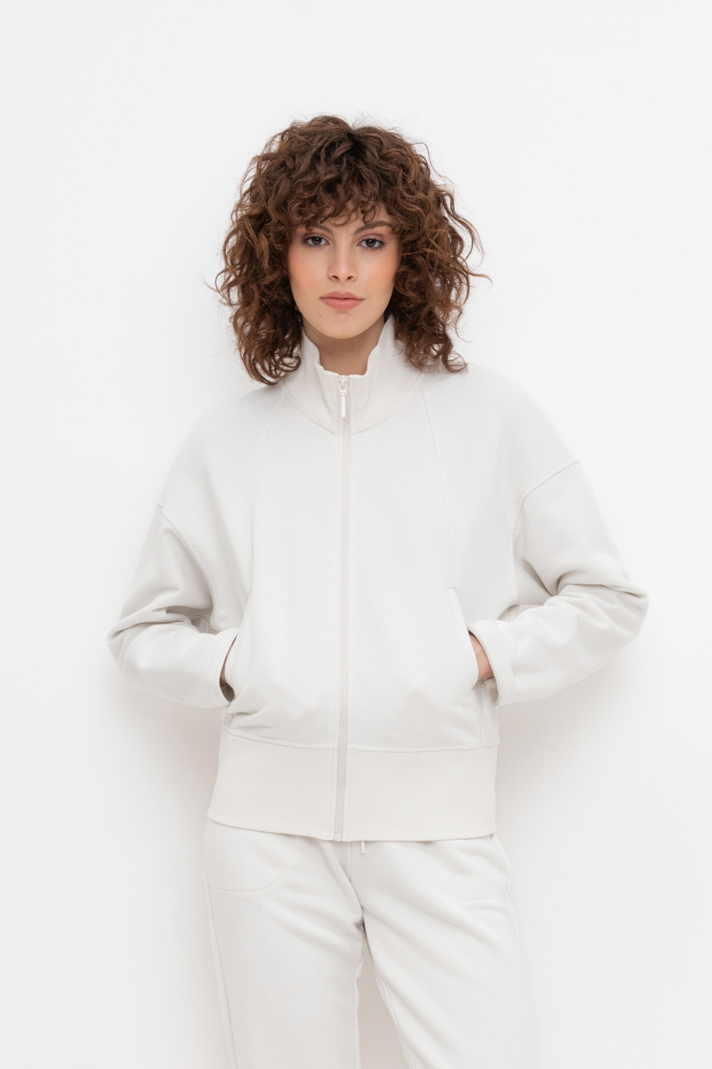Тёплая трикотажная куртка на молнии с высоким воротником стойкой и широким поясом. Произведена из мягкого трикотажного футера трёхнитки. В составе 80% натурального хлопка и 20% полиэстера, при этом полиэстер ввязан внутрь по особой технологии и не соприкасается с кожей.