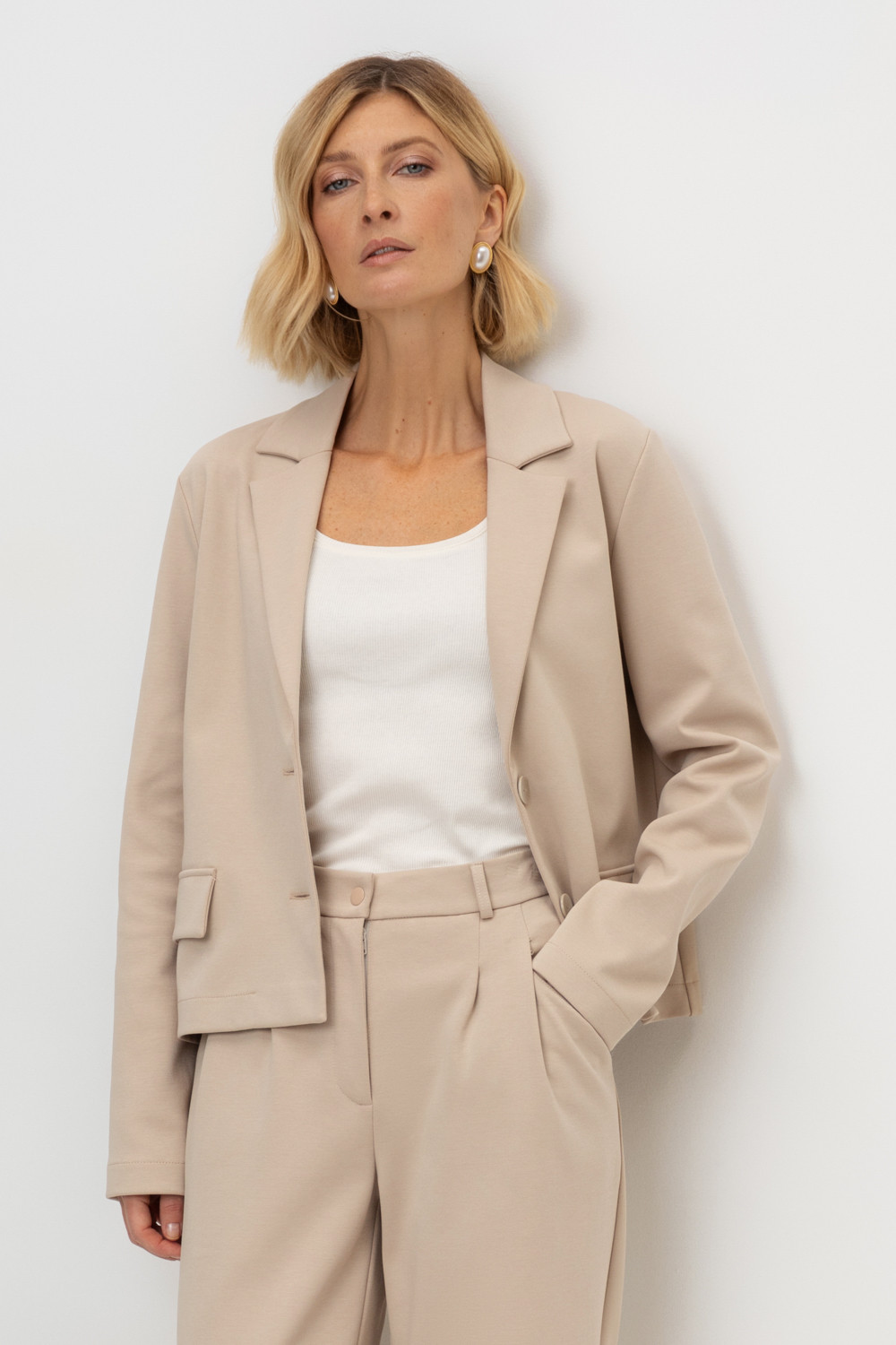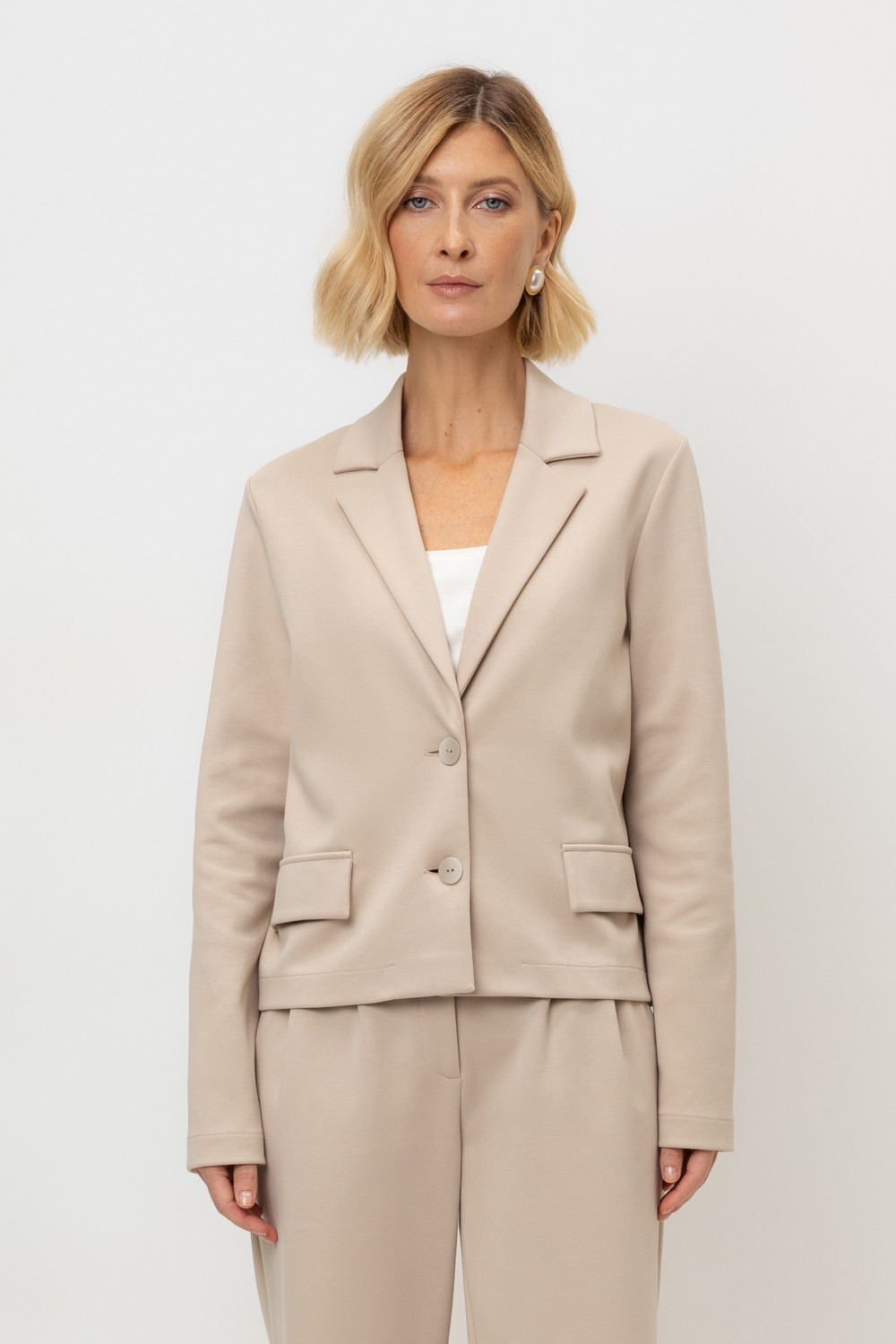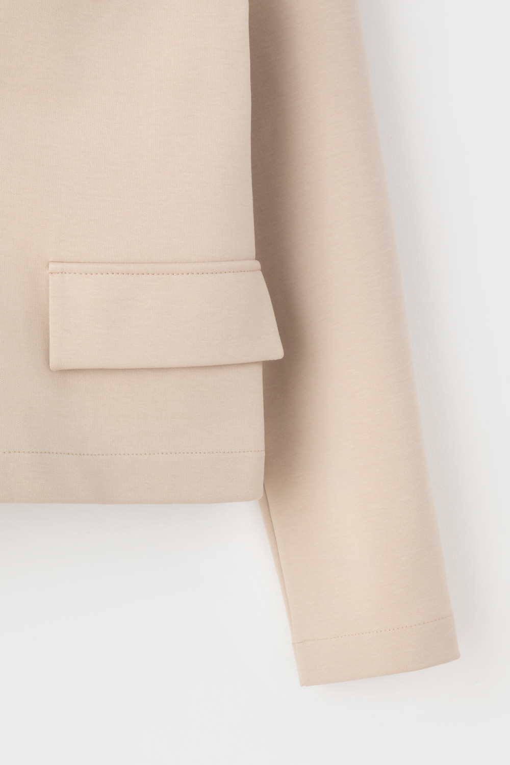 Женский укороченный жакет прямого кроя с имитацией карманов с клапаном из плотного набивного гладкого трикотажа интерлок. Гладкий и плотный материал на основе хлопка сохраняет форму.