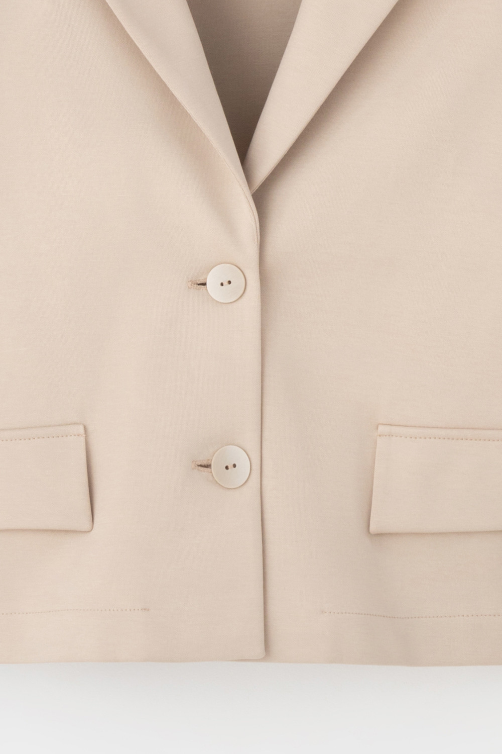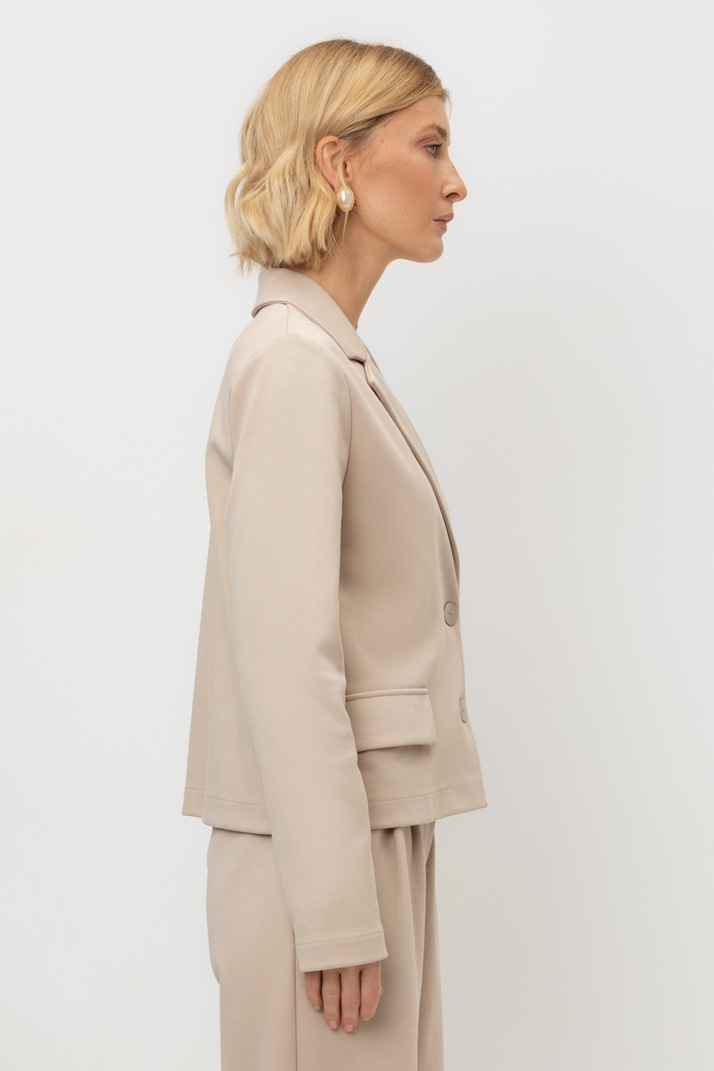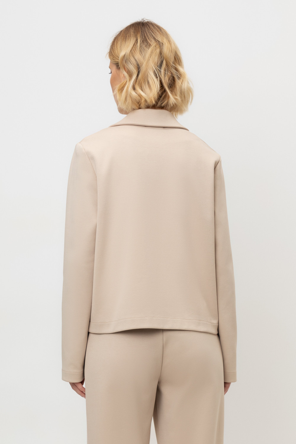 Женский укороченный жакет прямого кроя с имитацией карманов с клапаном из плотного набивного гладкого трикотажа интерлок. Гладкий и плотный материал на основе хлопка сохраняет форму.