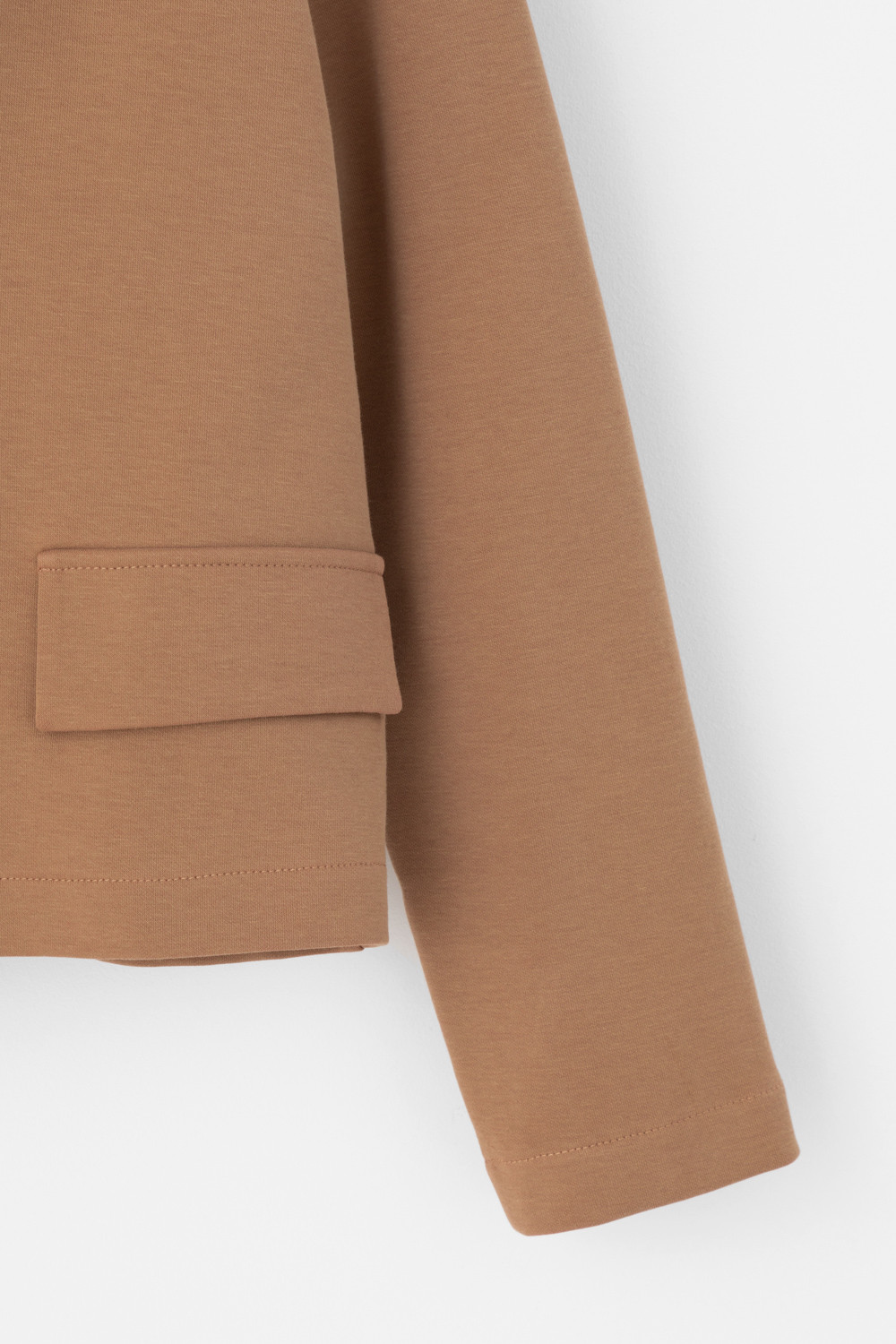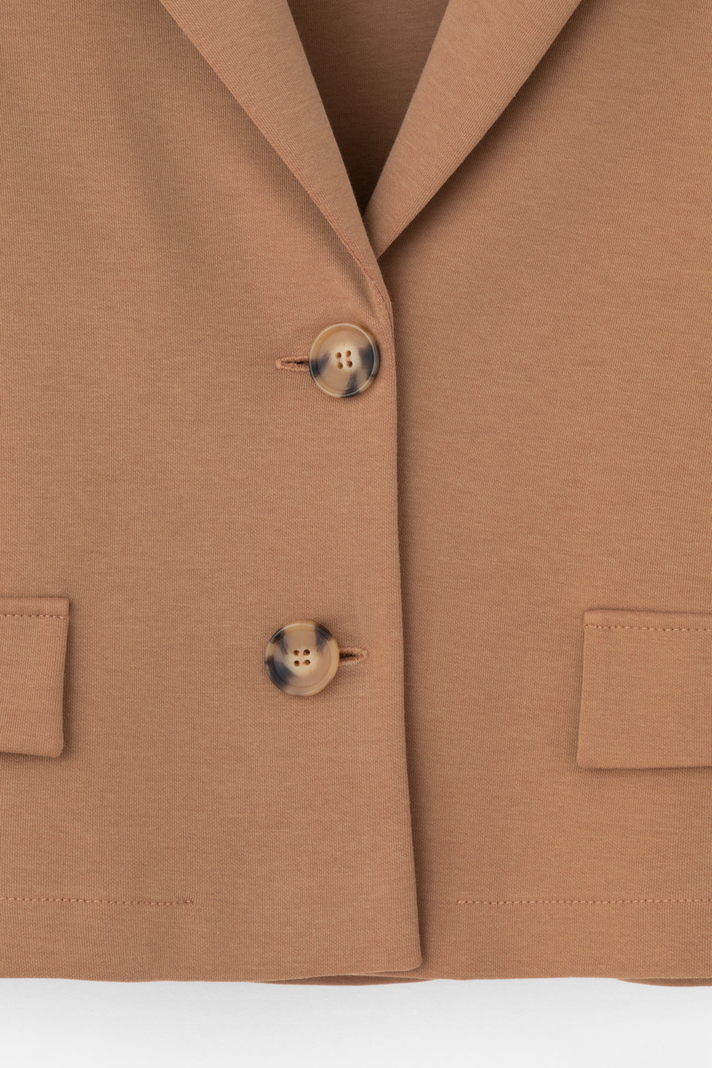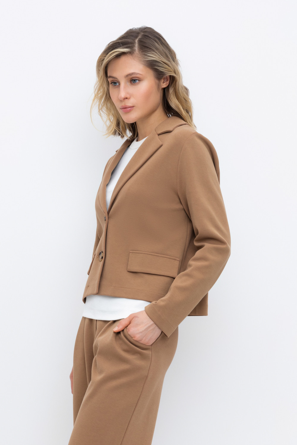 Женский укороченный жакет прямого кроя с имитацией карманов с клапаном из плотного набивного гладкого трикотажа интерлок. Гладкий и плотный материал на основе хлопка сохраняет форму.