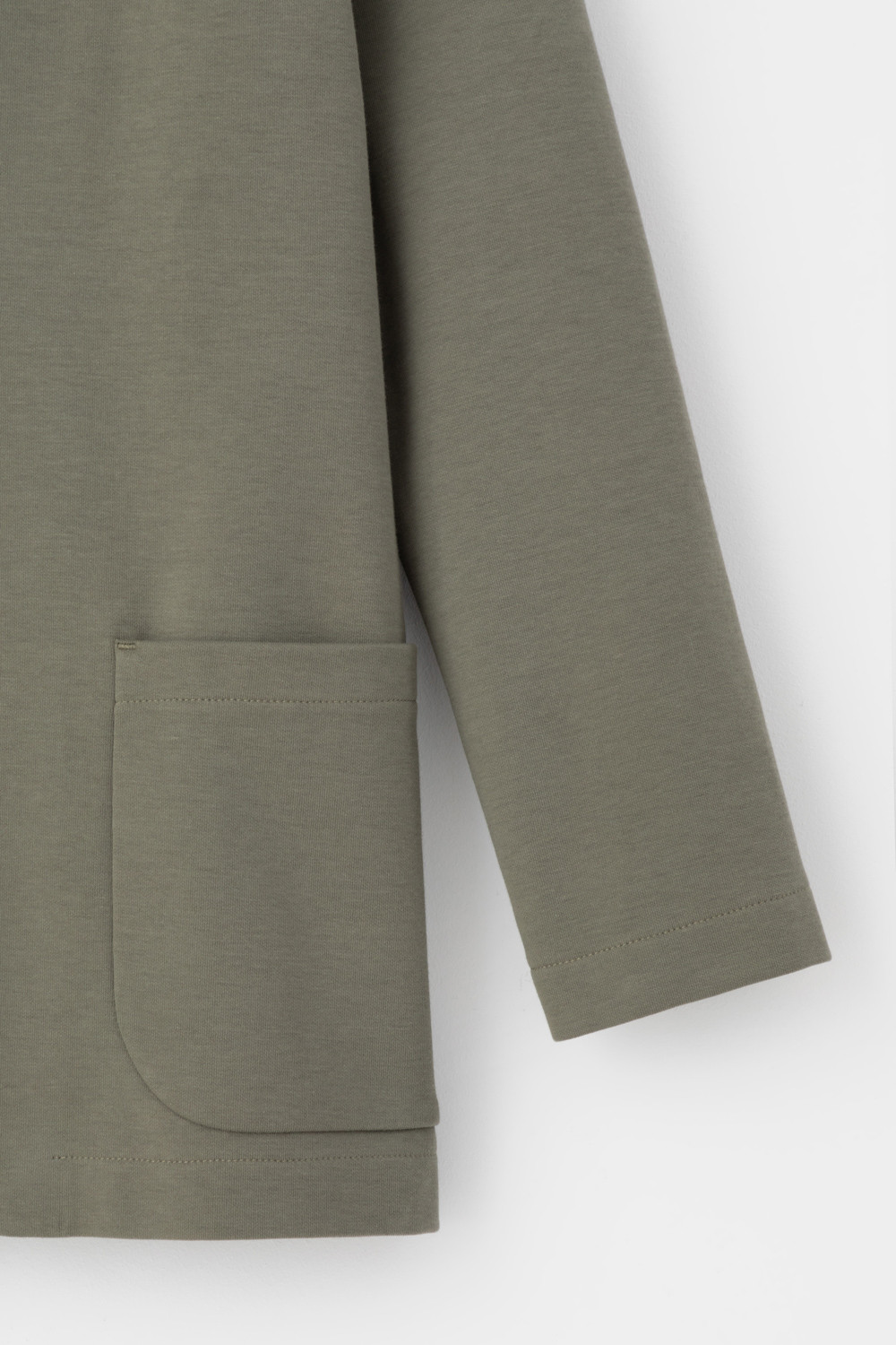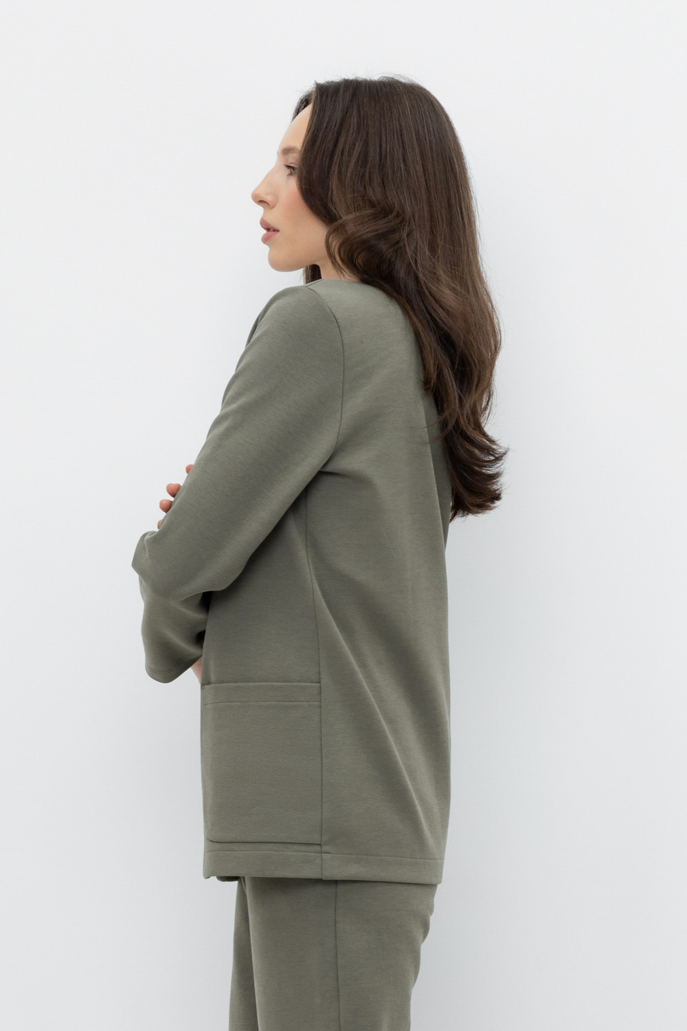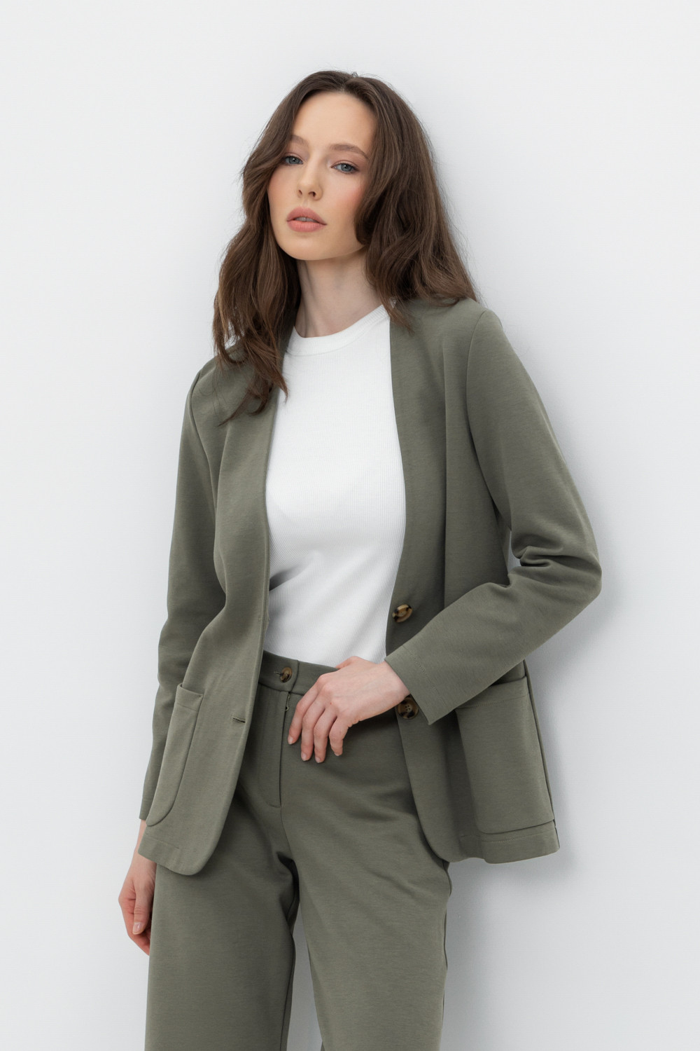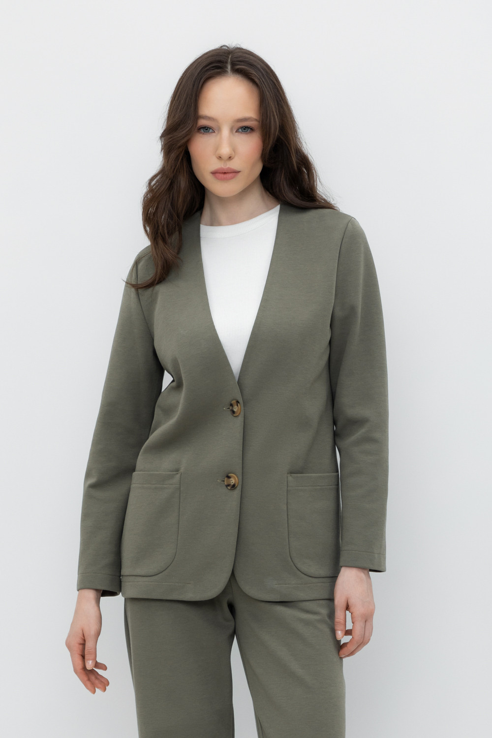 Однобортный, прямой немного удлиненный жакет с застежкой на пуговицы и двумя накладными карманами из плотного гладкого трикотажа интерлок.