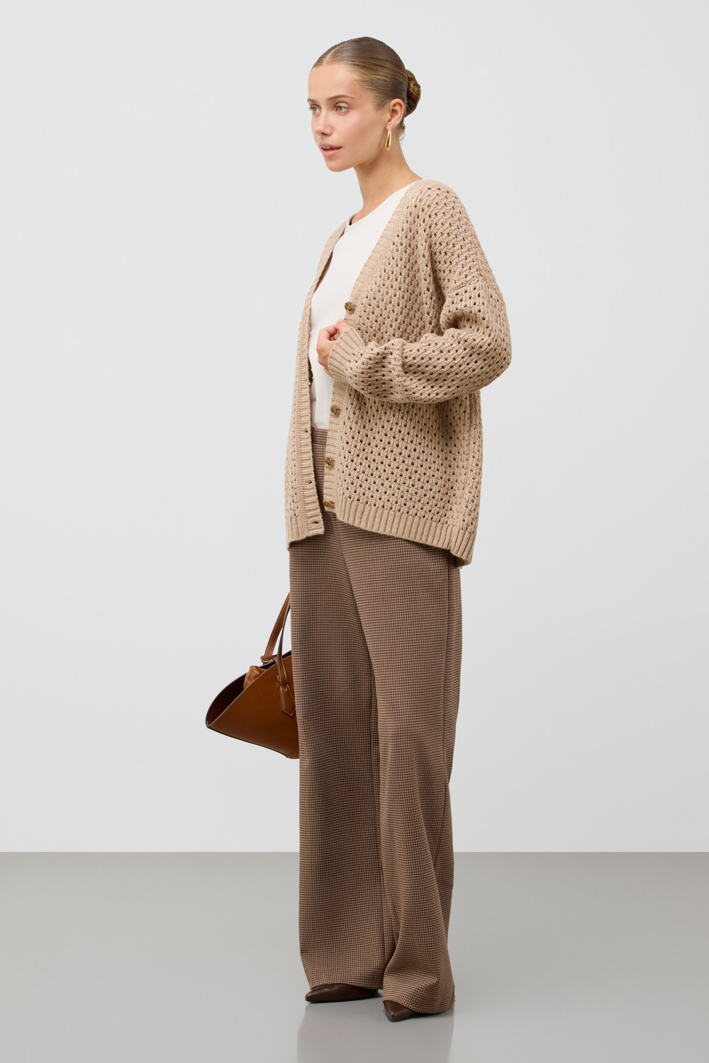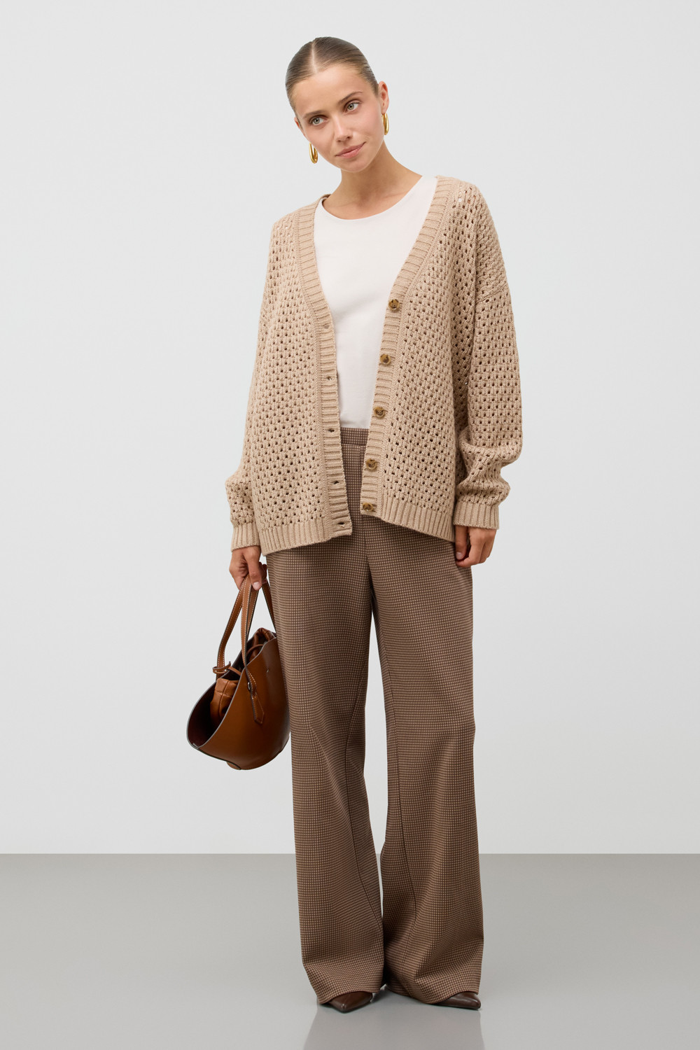 Мягкий  кардиган из ажурной вязки, выполненный из первоклассного материала, сочетает в себе шерсть и акрил, что создает атмосферу комфорта. Он приятно облегает тело, не вызывает дискомфорта и прекрасно сохраняет свою форму.