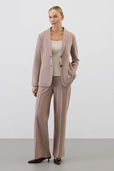 Приталенный пиджак изготовлен из высококачественного трикотажного полотна DOUBLE FACE. Трикотаж прошел специальную каучуковую обработку, что придает пиджаку легкость и шелковистую текстуру. Благодаря уникальному переплетению и специальным методам обработки, он сохраняет свой силуэт и форму, что позволяет легко комбинировать его как с юбками, так и с брюками.