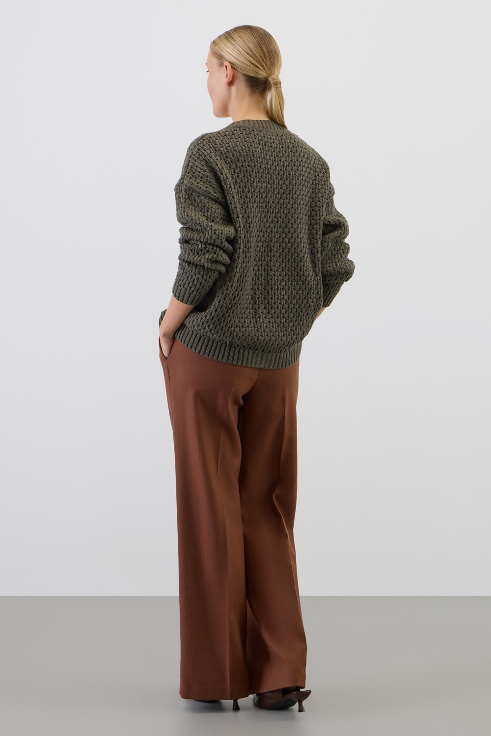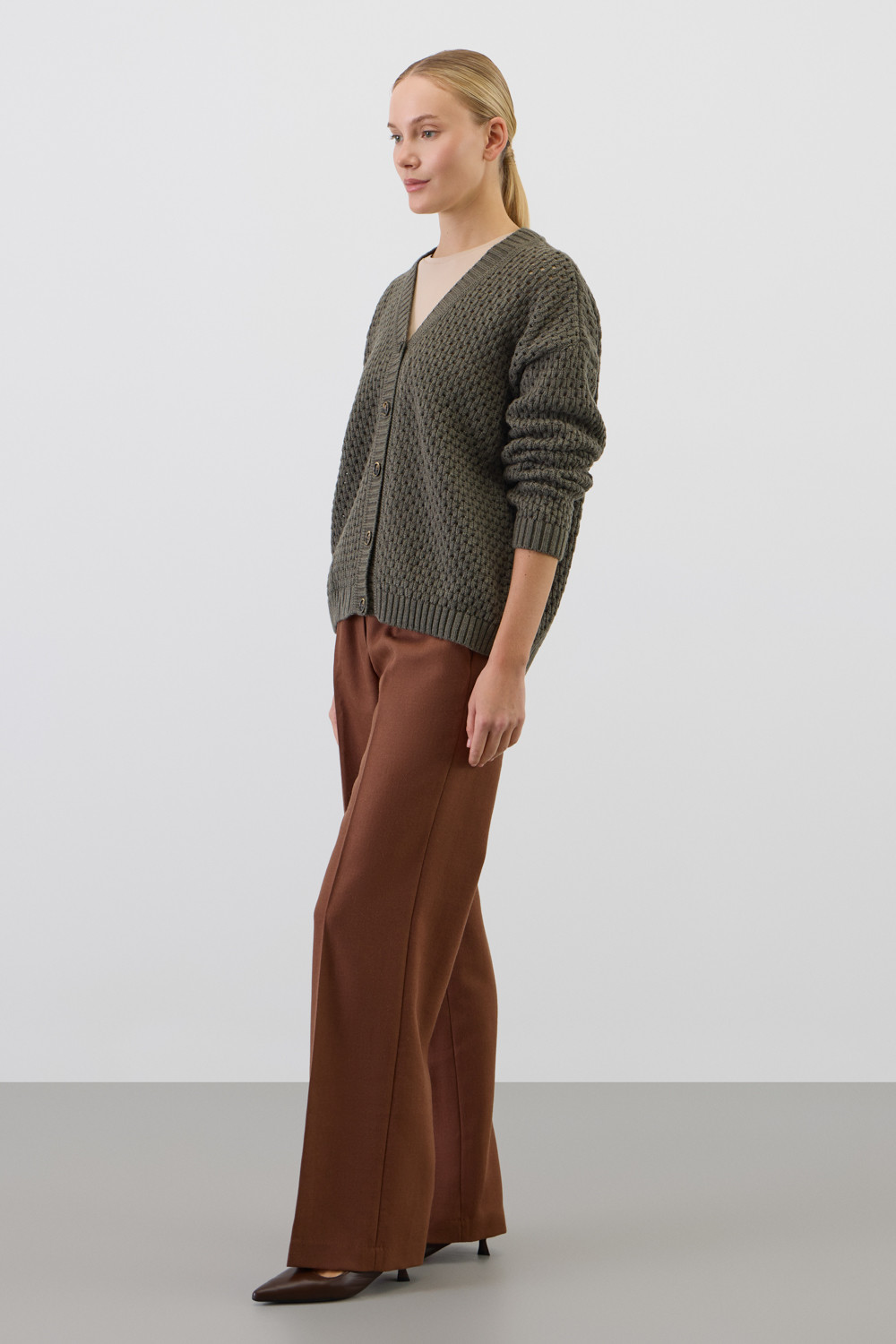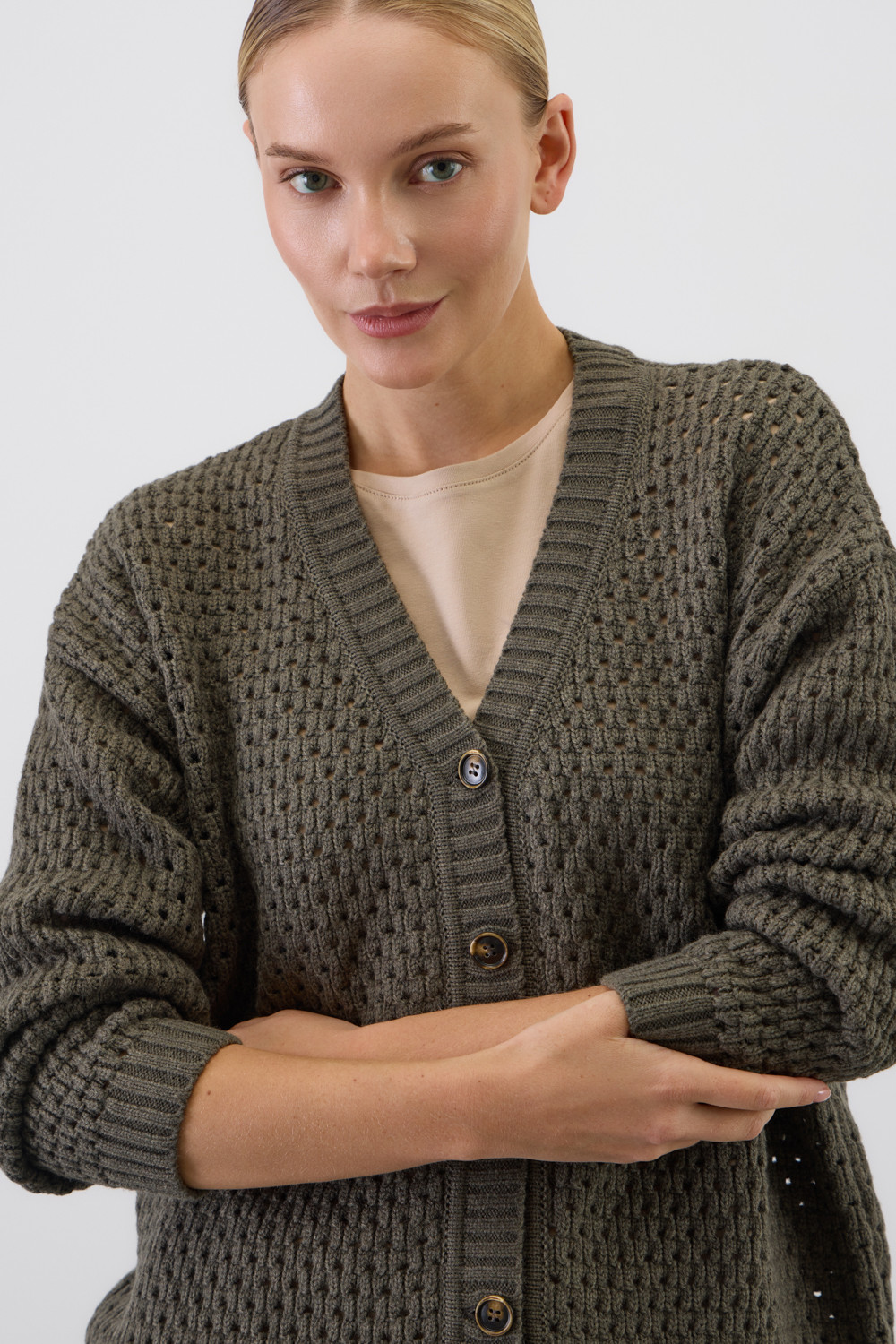 Мягкий  кардиган из ажурной вязки, выполненный из первоклассного материала, сочетает в себе шерсть и акрил, что создает атмосферу комфорта. Он приятно облегает тело, не вызывает дискомфорта и прекрасно сохраняет свою форму.