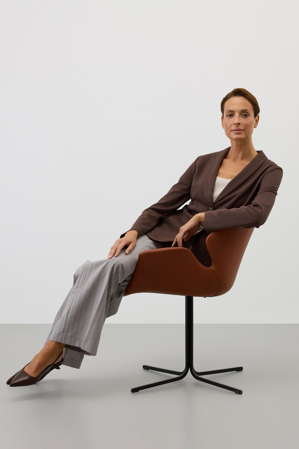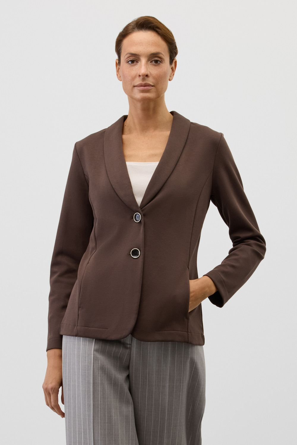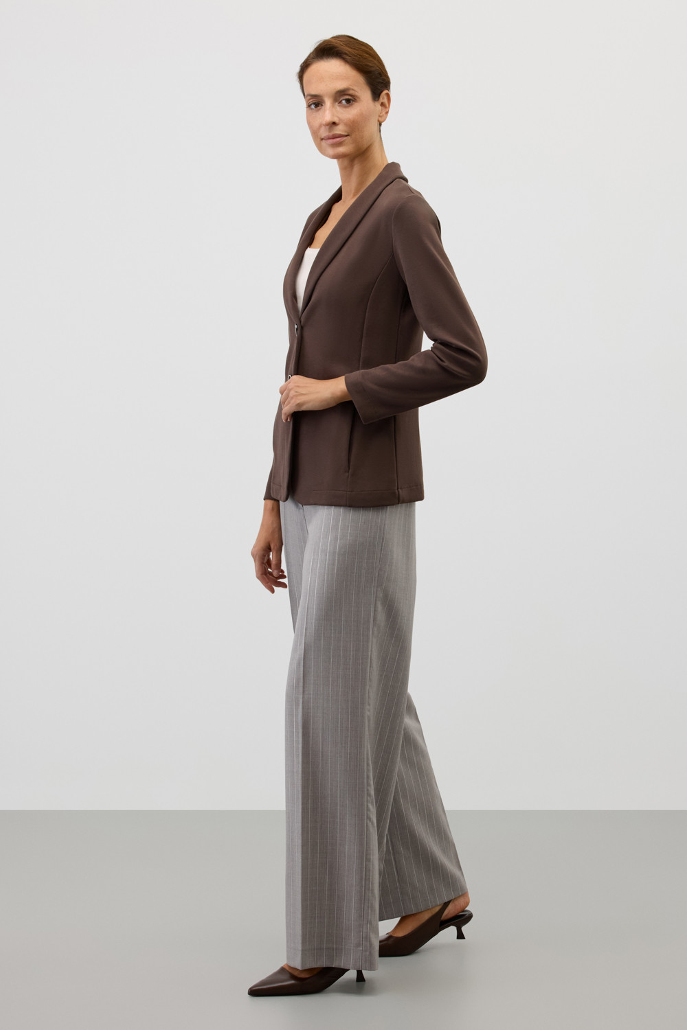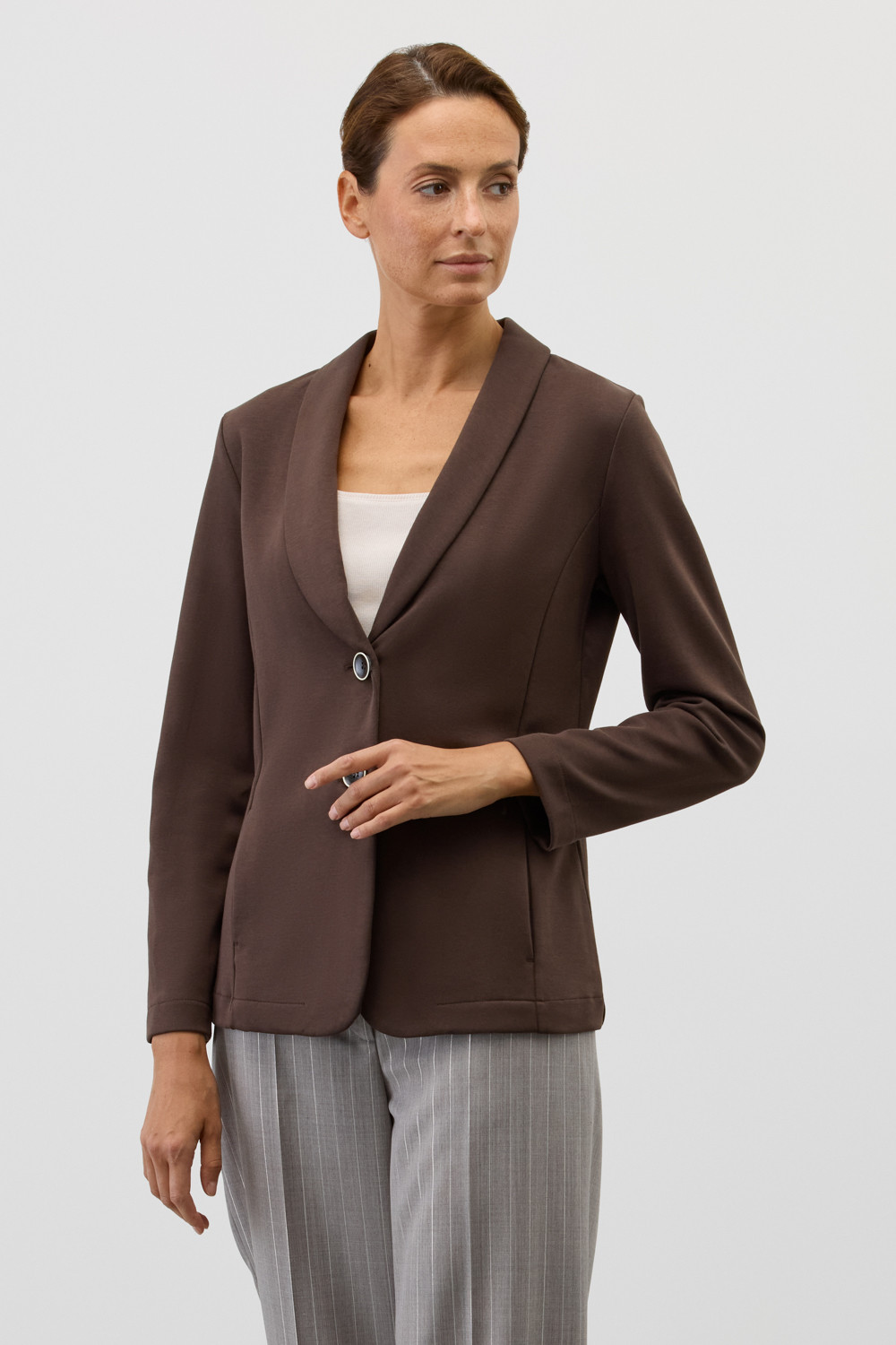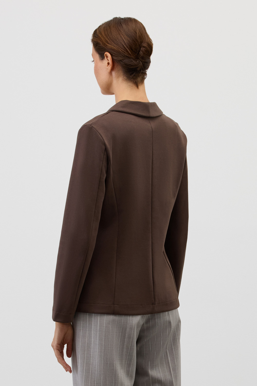 Приталенный пиджак изготовлен из высококачественного трикотажного полотна DOUBLE FACE. Трикотаж прошел специальную каучуковую обработку, что придает ему легкость и шелковистую текстуру. Благодаря уникальному переплетению и специальным методам обработки, он сохраняет свой силуэт и форму, что позволяет легко комбинировать его как с юбками, так и с брюками.