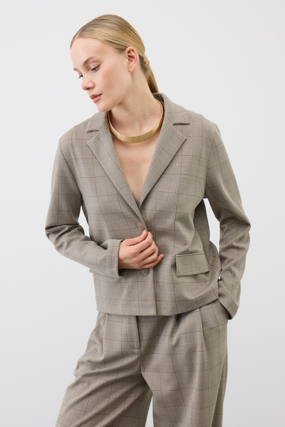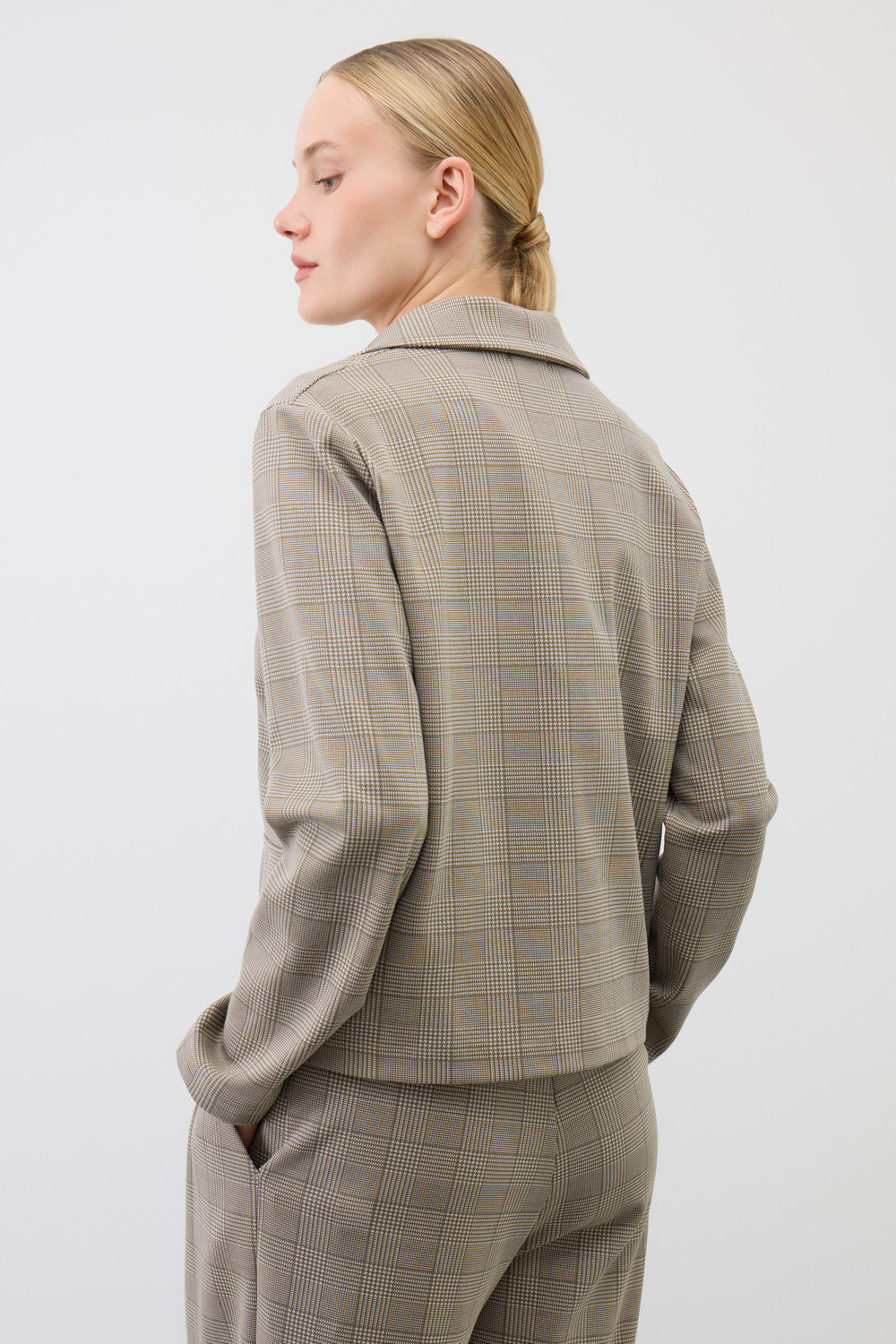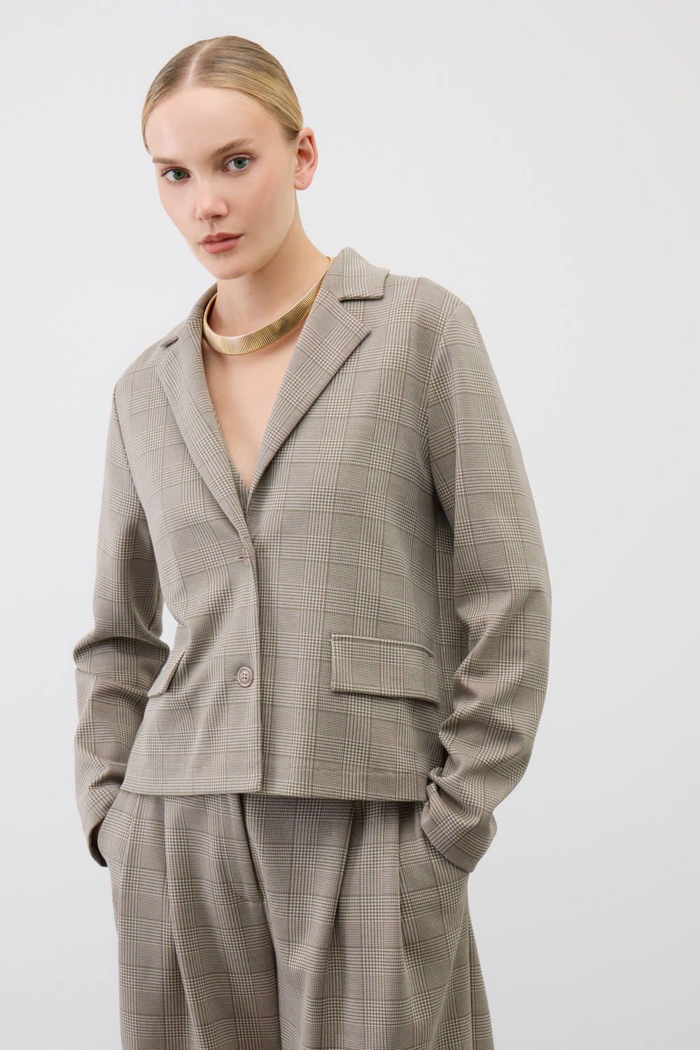 Женский укороченный жакет прямого кроя с имитацией карманов с клапаном из плотного набивного гладкого трикотажа интерлок. Гладкий и плотный материал на основе хлопка сохраняет форму.
