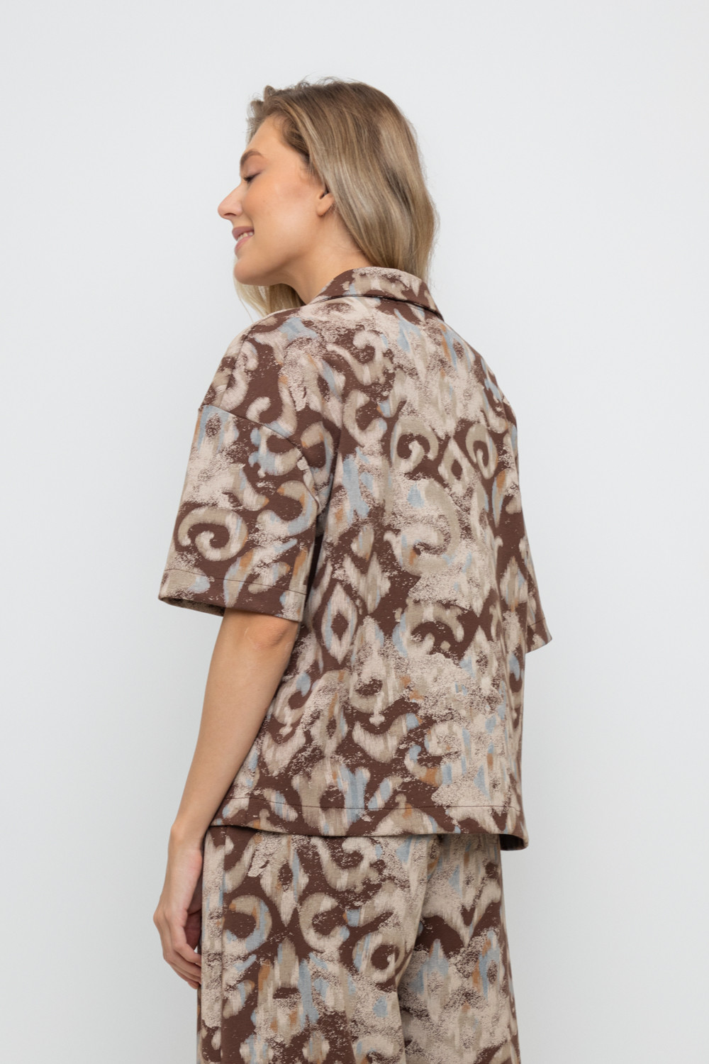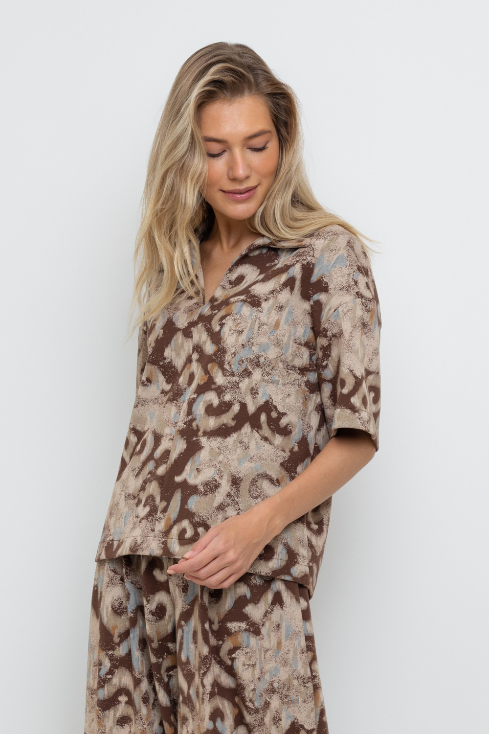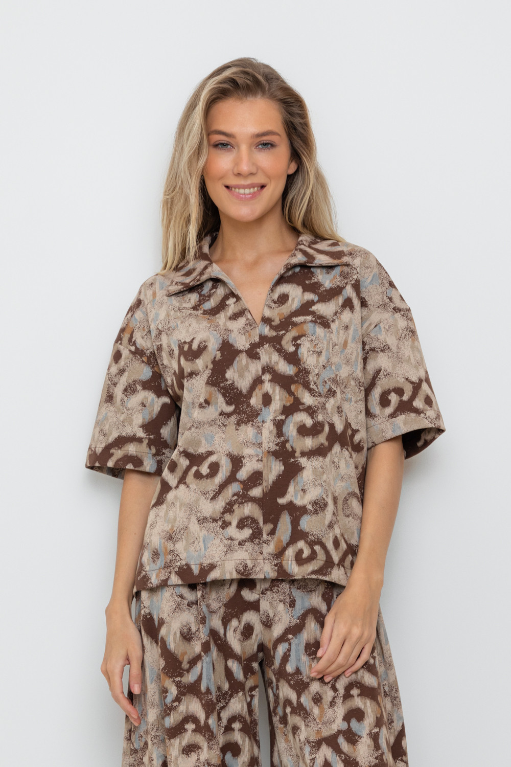 Джемпер поло с короткими рукавами из плотного набивного гладкого трикотажа интерлок с V-образным вырезом. Спущенное плечо придает изделию свободный силуэт.