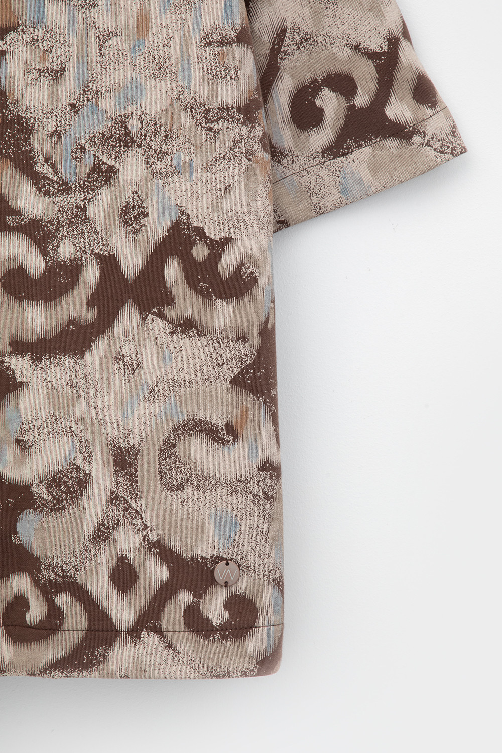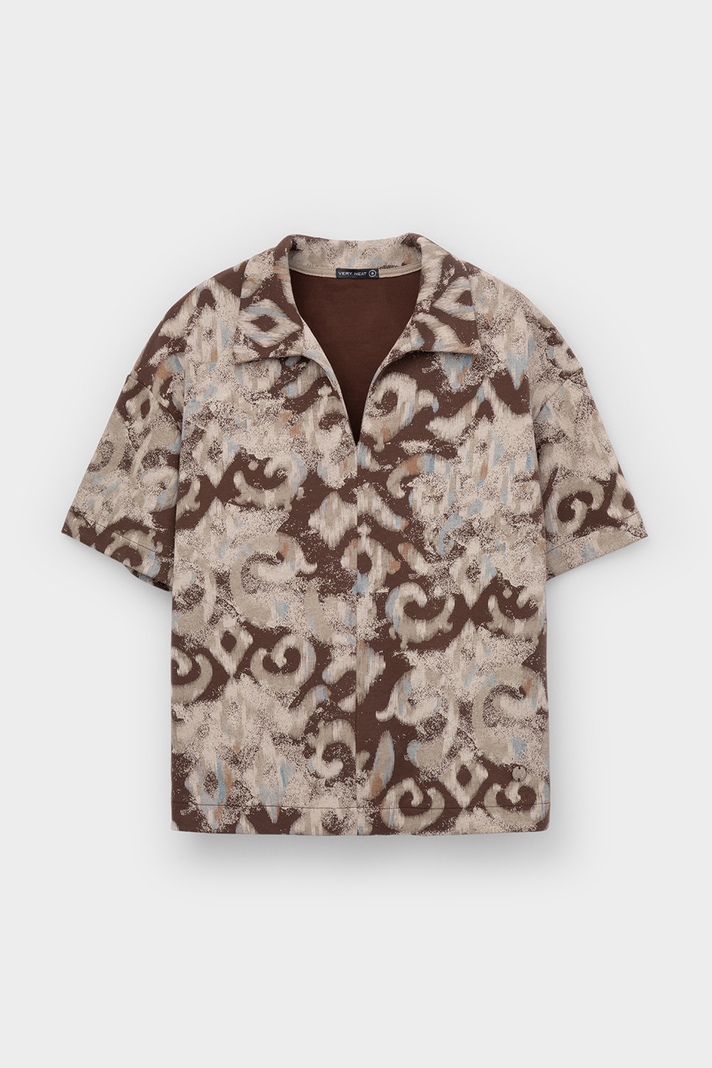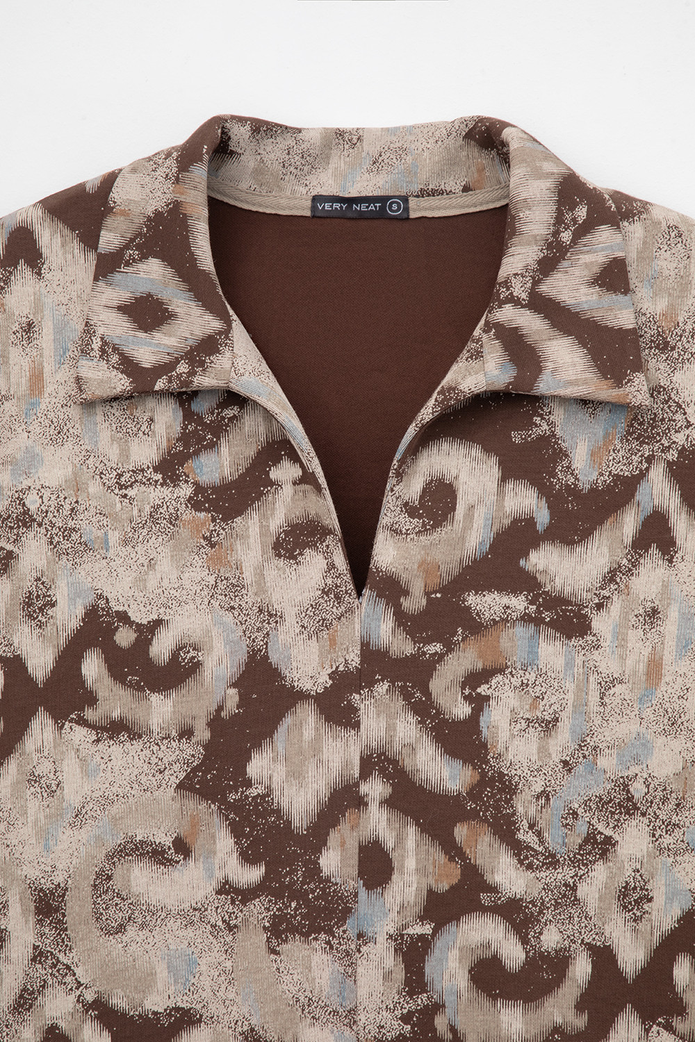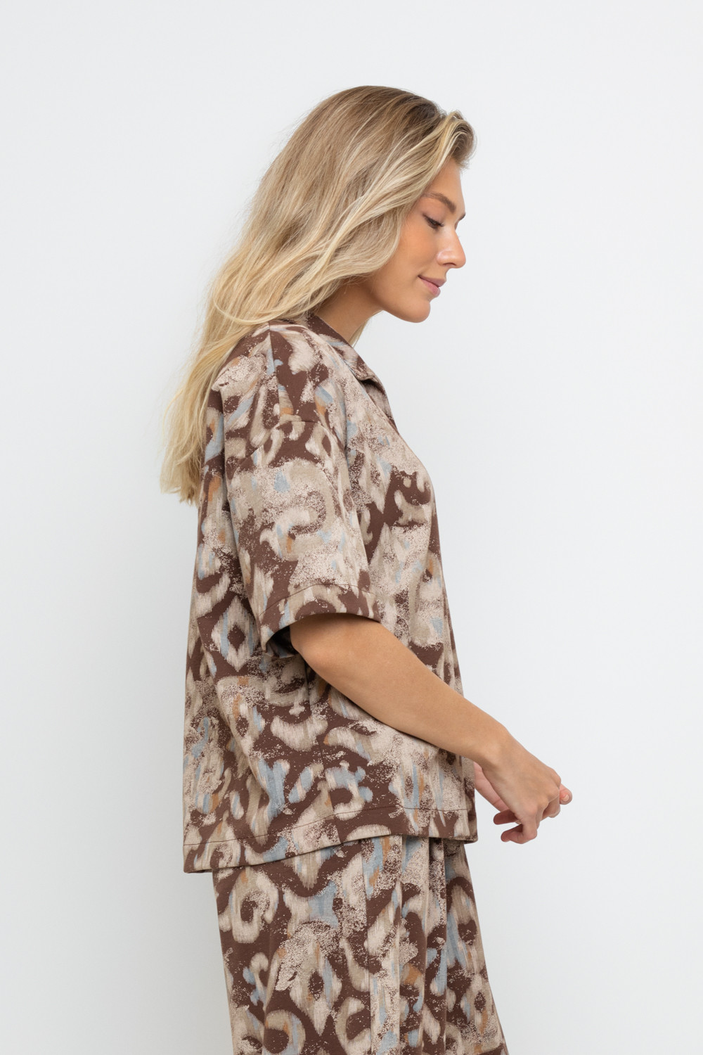 Джемпер поло с короткими рукавами из плотного набивного гладкого трикотажа интерлок с V-образным вырезом. Спущенное плечо придает изделию свободный силуэт.