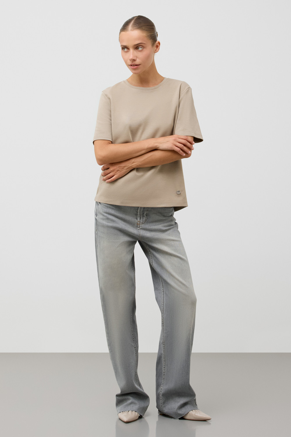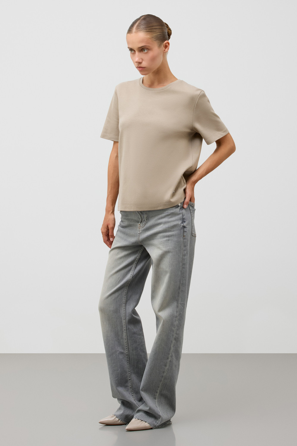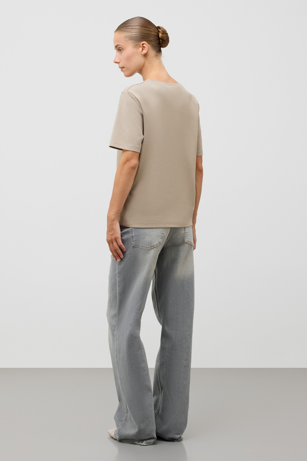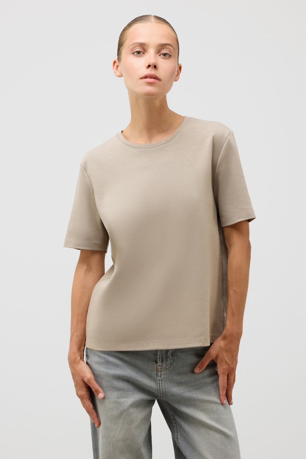 Базовая футболка из премиального трикотажа DOUBLE FACE.  Трикотаж прошел особую обработку силиконом, что придает ему легкость и шелковистость текстуры. Имеет классический круглый вырез и удобный прямой крой.