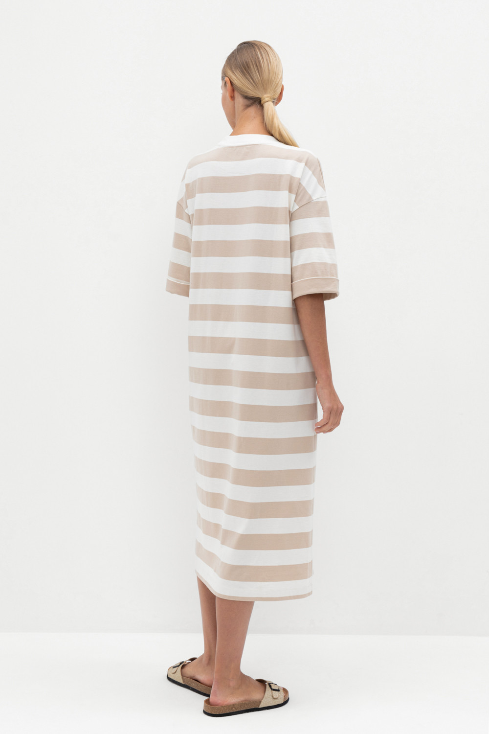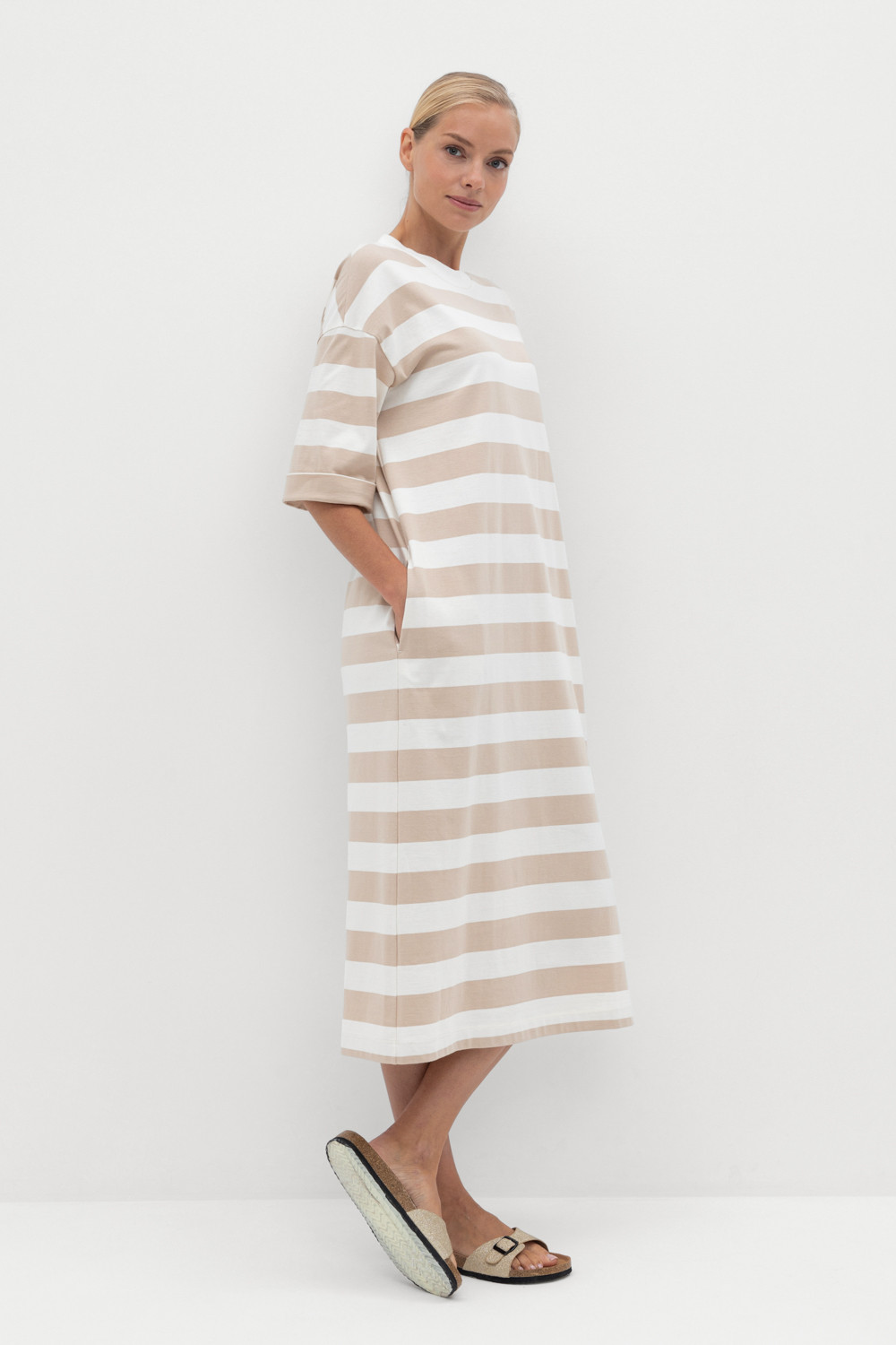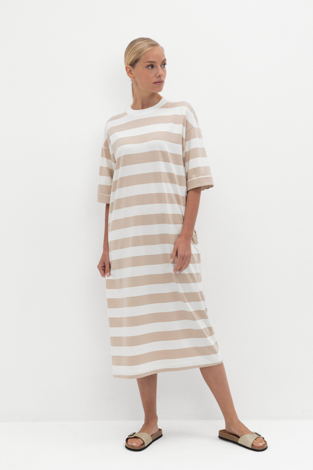 Трикотажное платье в полоску из длинноволокнистого гребенного хлопка. Спущенное плечо придает изделию свободный силуэт.