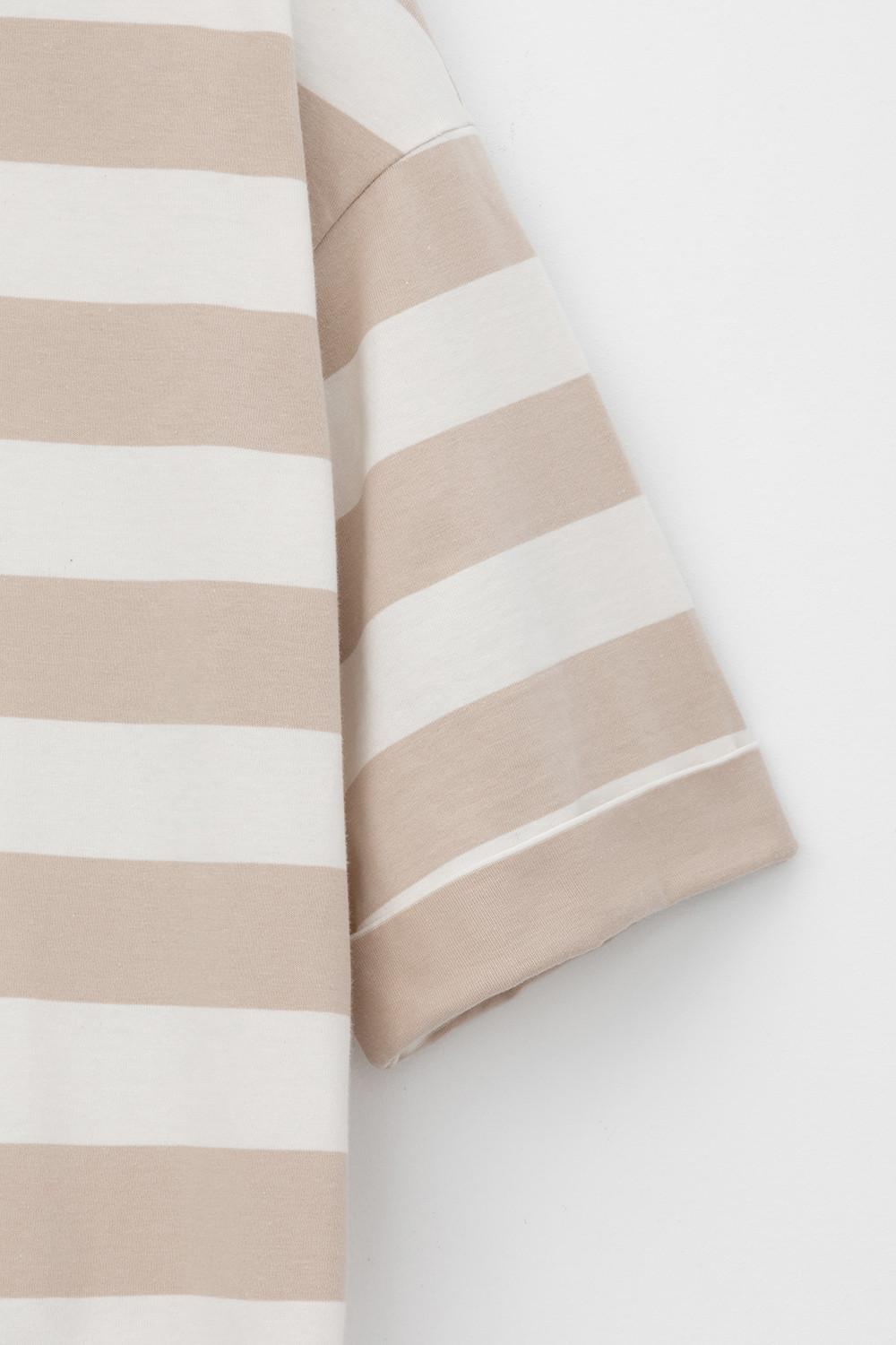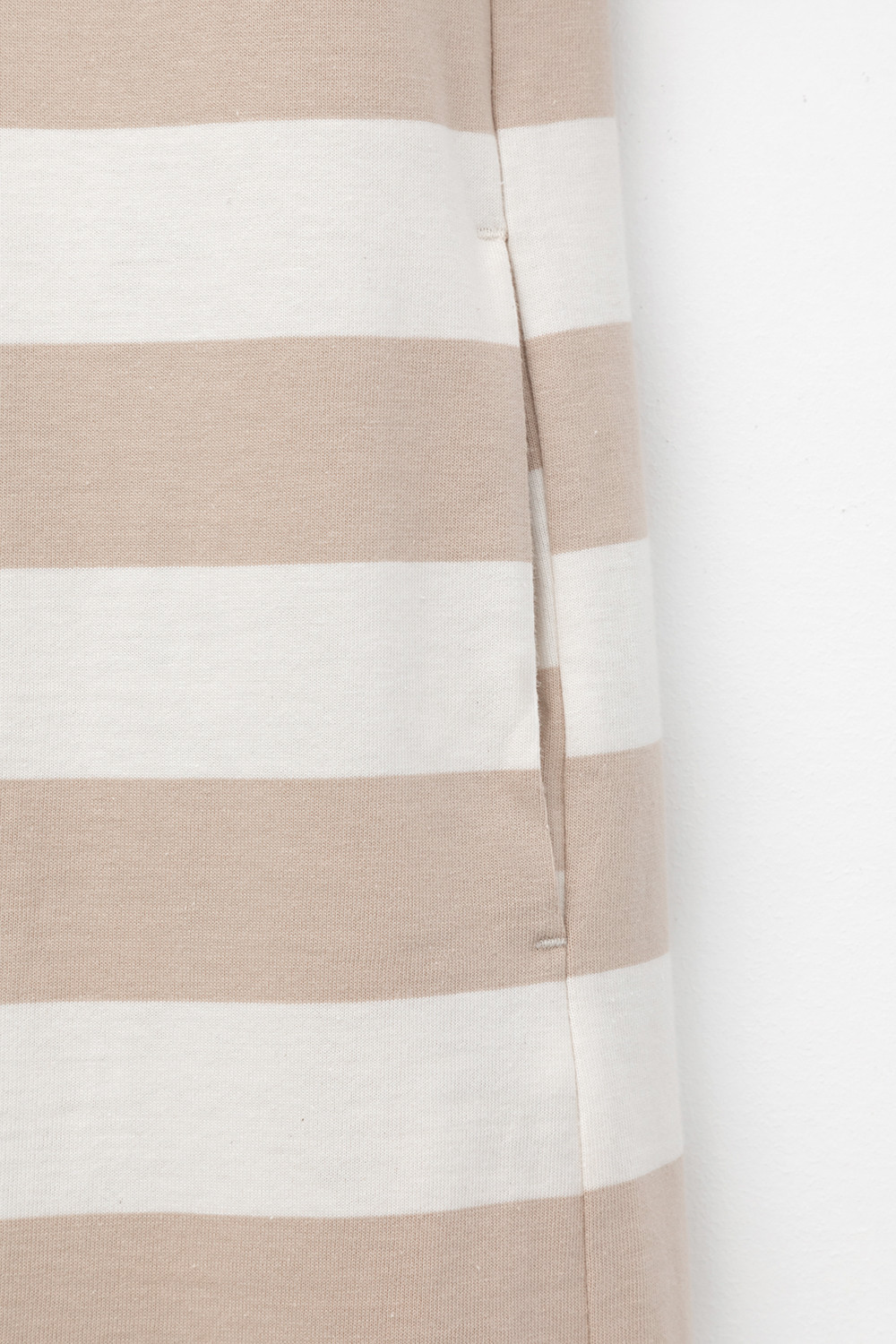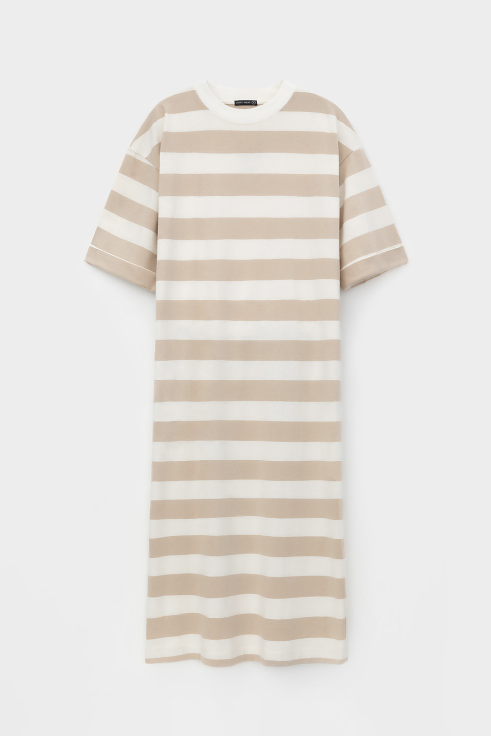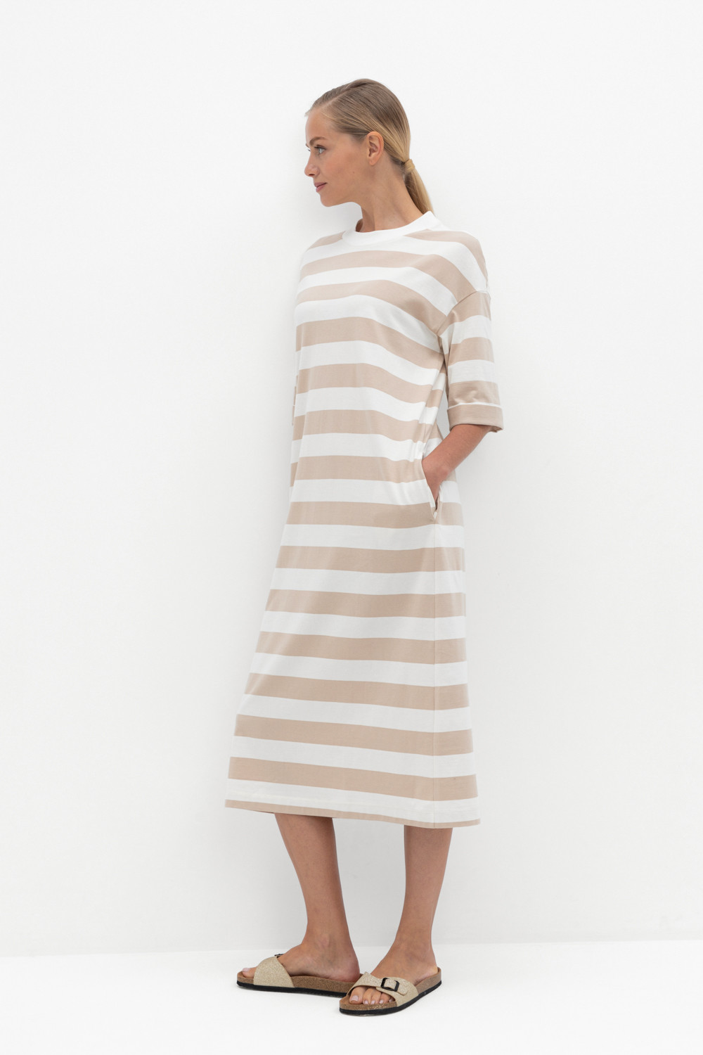 Трикотажное платье в полоску из длинноволокнистого гребенного хлопка. Спущенное плечо придает изделию свободный силуэт.